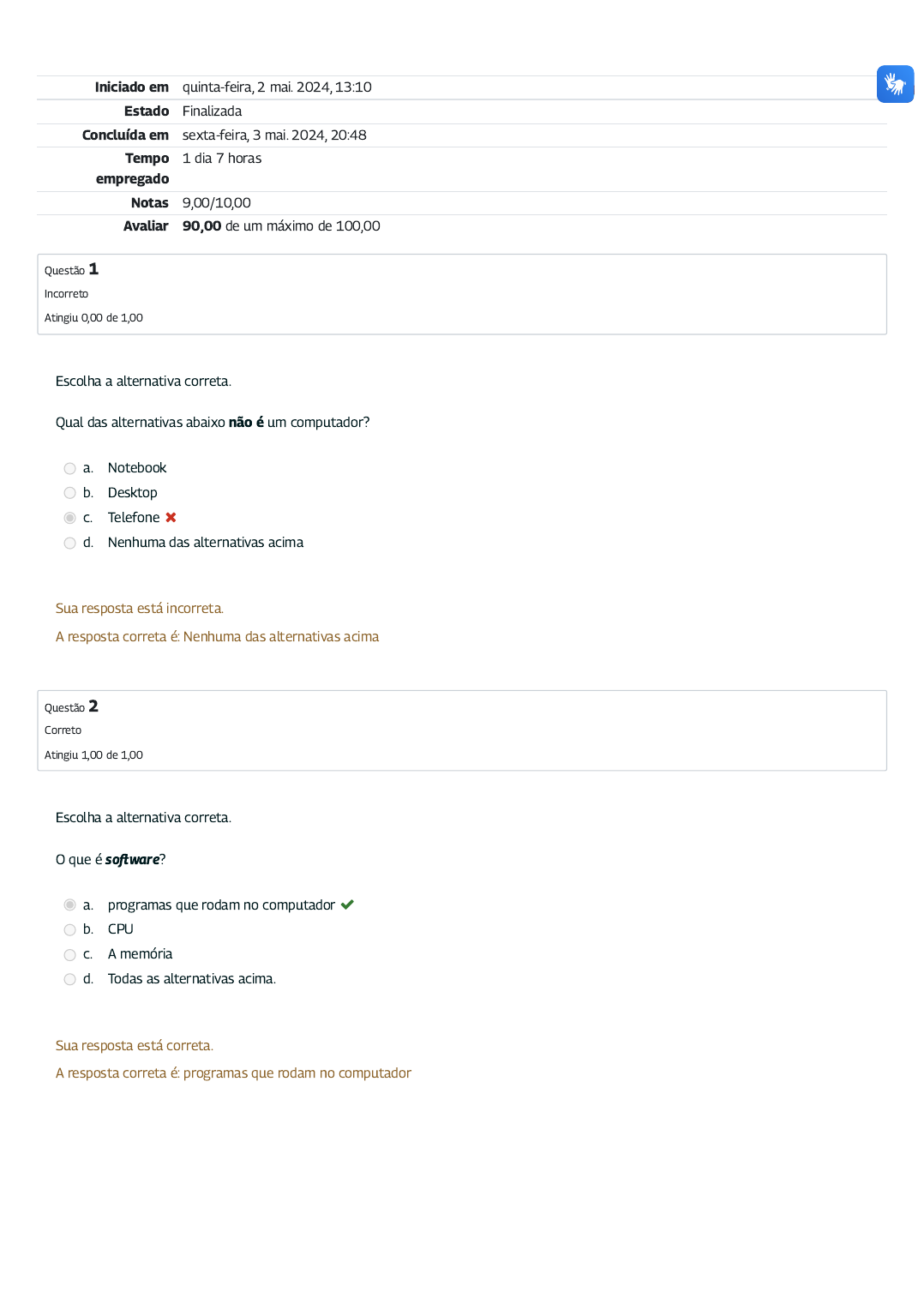 Iniciado em quinta-feira, 2 mai. 2024, 13:10 Estado Finalizada Concluída em sexta-feira, 3 mai. 2024, 20:48 Tempo empregado 1 dia 7 horas Notas 9,00/10,00 Avaliar 90,00 de um máximo de 100,00 Questão 1 Incorreto Atingiu 0,00 de 1,00 Questão 2 Correto Atingiu 1,00 de 1,00 Escolha a alternativa correta. Qual das alternativas abaixo não é um computador? a. Notebook b. Desktop c. Telefone d. Nenhuma das alternativas acima Sua resposta está incorreta. A resposta correta é: Nenhuma das alternativas acima Escolha a alternativa correta. O que é so�ware? a. programas que rodam no computador b. CPU c. A memória d. Todas as alternativas acima. Sua resposta está correta. A resposta correta é: programas que rodam no computador Questão 3 Correto Atingiu 1,00 de 1,00 Questão 4 Correto Atingiu 1,00 de 1,00 Questão 5 Correto Atingiu 1,00 de 1,00 Escolha VERDADEIRO ou FALSO para a questão abaixo. Notebooks, tablets e smartphones: todos eles são tipos de computadores pessoais. Verdadeiro Falso A resposta correta é 'Verdadeiro'. Escolha alternativa correta. Como se chama quando o dispositivo Bluetooth está conectado? a. descoberto b. compartilhamento c. emparelhamento d. nenhuma das alternativas acima Sua resposta está correta. A resposta correta é: emparelhamento Complete a frase com a alternativa correta. Um assistente digital pode... a. enviar e-mails ou textos b. enviar e-mails ou textos c. gerenciar e criar listas d. todas as alternativas acima Sua resposta está correta. A resposta correta é: todas as alternativas acima Questão 6 Correto Atingiu 1,00 de 1,00 Questão 7 Correto Atingiu 1,00 de 1,00 Questão 8 Correto Atingiu 1,00 de 1,00 Escolha VERDADEIRO ou FALSO para a questão abaixo. Muitos aplicativos podem ser sincronizados pela Internet para que se possa trabalhar a partir de diferentes dispositivos. Verdadeiro Falso A resposta correta é 'Verdadeiro'. Escolha a alternativa correta. O que torna uma senha forte? a. pelo menos oito caracteres de comprimento b. deve ser uma combinação de letras, números e símbolos c. deve haver pelo menos uma letra maiúscula d. todas as alternativas acima Sua resposta está correta. A resposta correta é: todas as alternativas acima Escolha VERDADEIRO ou FALSO para a questão abaixo. Ao criar uma senha segura, é melhor usar números ou nomes associados a você para que possa lembrá-los facilmente. Verdadeiro Falso A resposta correta é 'Falso'. Questão 9 Correto Atingiu 1,00 de 1,00 Questão 10 Correto Atingiu 1,00 de 1,00 Escolha a alternativa correta. Qual é o nome do aplicativo de apresentações da Microso�? a. Palestra b. PowerPoint c. Panorama d. Excel Sua resposta está correta. A resposta correta é: PowerPoint Escolha a alternativa correta. Qual das alternativas abaixo não é uma maneira de começar a trabalhar em um documento do Word? a. Abrir um modelo. b. Abrir um navegador da Web e procurar pelo Word. c. Abrir um arquivo existente. d. Abrir um documento existente. Sua resposta está correta. A resposta correta é: Abrir um navegador da Web e procurar pelo Word. ◄ Videoaulas Seguir para... Avaliação de Satisfação com o Curso ► https://mooc41.escolavirtual.gov.br/mod/url/view.php?id=76408&forceview=1 https://mooc41.escolavirtual.gov.br/mod/questionnaire/view.php?id=76410&forceview=1