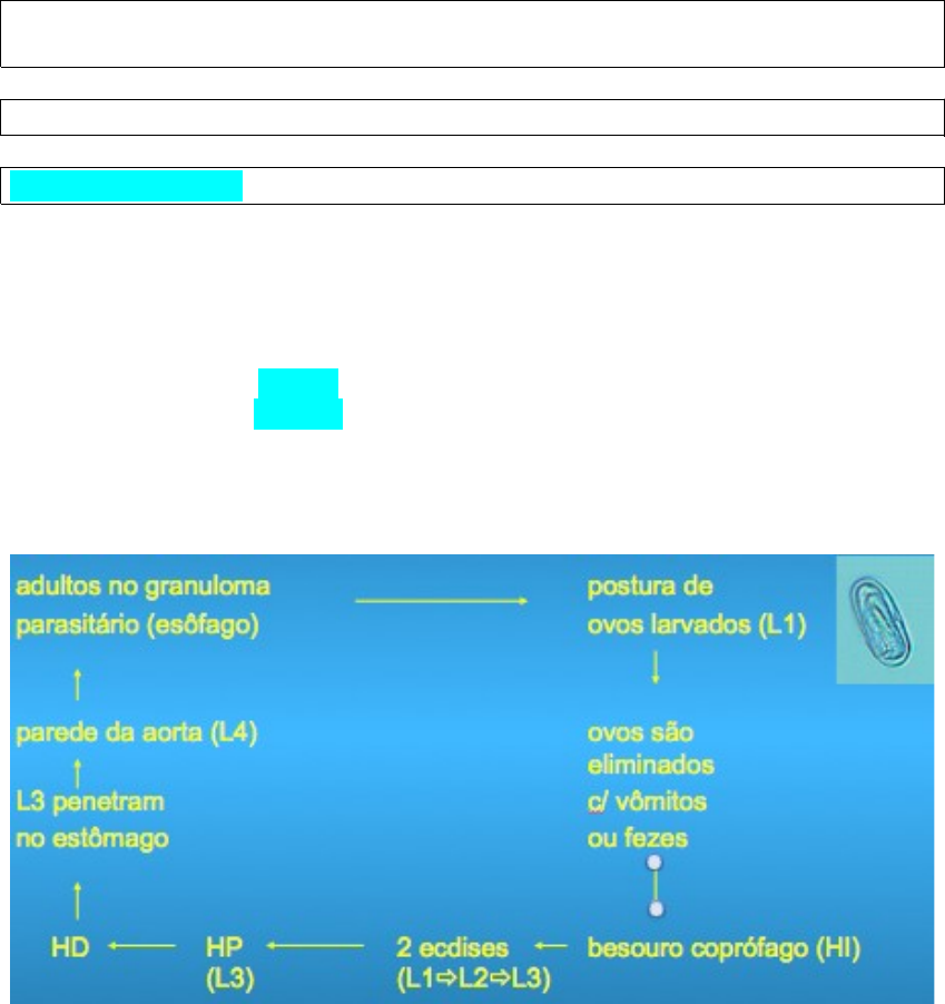 Resumo para prova Doenças Parasitárias Verminoses Gástricas ESPIROCERCOSE dos CÃES e GATOS · Agente etiológico: Spirocerca lupi · Hospedeiros: cão e gato (raro) · His: besouros coprófagos · Identificação: Adultos = até 8 cm no interior do granuloma (cor rósea, enovelados) · Localização: Larvas = parede da aorta Adultos: granulomas na parede do esôfago · Distribuição geográfica: regiões tropicais e subtropicais. Ciclo Biológico: Heteroxênico; PPP: ~ 2 anos Patogenia: · Migração das larvas: lesões na a. Aorta · Granulomas parasitários: disfagia, vômitos · Osteossarcoma esofágico · Espondilose de vértebras torácicas (ação toxêmica) · Osteoartropatia pulmonar hipertrófica dos ossos longos Osteopatia hipertrófica = síndrome paraneoplásica rara Sintomatologia Clínica: · Geralmente ausente (silenciosa) · Disfagia, emese e emagrecimento Epidemiologia: · Incidência alta em áreas endêmicas · Infecção facilitada pela variedade de HPs · Acomete mais cães de caça Diagnóstico: · Exame coproparasitológico: pesquisa de ovos nas fezes ou vômito · Imagenológico: endoscopia / exame radiográfico Tratamento: · Disofenol (7 a 10 mg/kg) · Ivermectina (0,2 mg/kg, dose única) Verminoses do INTESTINO DELGADO TOXOCARIOSE dos CÃES e GATOS Espécies: 1. Toxocara canis 2. Toxocara cati 3. Toxocara leonina Hospedeiros: 1. Canídeos 2. Felídeos 3. Canídeos e Felídeos Tamanho: Grande (até 10 cm) · Adultos: extremidade ant. = abertura bucal rodeado por 3 lábios · (Macho) = cauda afilada com 1 espículo, pode apresentar asa caudal Ovos: Arrendondados (subglobulares), embrionados de casca grossa e geralmente irregular. (Fêmeas): ovíparas – alimentação: quimo (bolo alimentar) Ciclo Biológico: Monoxênico (direito), pode ser ou não migratório Patogenia: · Lesões mecânicas: · Destruição do epitélio intestinal Diarréia de origem osmótica + inflamatória · Obstrução da luz do intestino delgado Retenção da parede intestinal – distensão abdominal · Perfuração da parede intestinal · Obstrução do ducto colédoco – icterícia obstrutiva · Disfunção da motilidade intestinal – intussuscepção de segmento da alça · Estágios larvais em infecções maciças – pneumonia às vezes edema pulmonar / pequenas homorragias imperseptiveis · Filhotes – podem nascer com disfunções pulmonares image5.jpeg image6.png image7.png image1.png image2.png image3.jpeg image4.jpeg