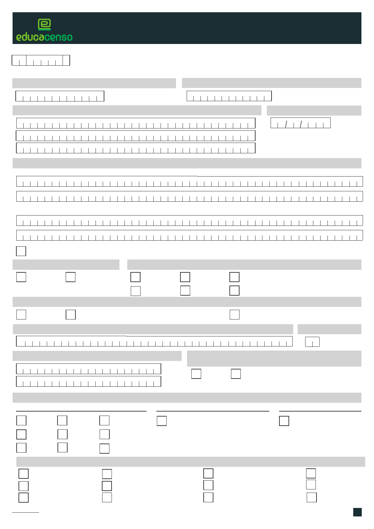 CENSO ESCOLAR 2024 1 1 – Identificação única (código gerado pelo Inep) IDENTIFICAÇÃO 3 – Nome completo 1 4 – Data de nascimento 1 5 – Filiação (informar nome completo) 1 Filiação 1 Filiação 2 Não declarado/ignorado 8 – Nacionalidade Brasileira Brasileira – nascido no exterior ou naturalizado Estrangeira 29 – País de nacionalidade 10 – UF de nascimento 11 – Município de nascimento Código da escola 12a –Tipo de deficiência, transtorno do espectro autista ou altas habilidades/superdotação Cegueira Surdez Surdocegueira Deficiência intelectual Baixa visão Deficiência auditiva Deficiência física Deficiência Transtorno do espectro autista Transtorno do espectro autista Altas habilidades/superdotação Altas habilidades/ superdotação Sim Não Deficiência múltipla 12 – Aluno(a) com deficiência, transtorno do espectro autista ou altas habilidades/superdotação 2 – Número do CPF – 6 – Sexo Masculino Feminino 7 – Cor/raça Branca Amarela Preta Parda Indígena Não declarada FORMULÁRIO DE ALUNO 1 - Dados carregados da base da Receita Federal para esse CPF. 2 - Este campo se refere ao país de origem do aluno e se aplica somente aos alunos estrangeiros. O campo será desabilitado para alterações de informações quando inserido CPF. Auxílio ledor Guia-intérprete Tradutor-intérprete de Libras Leitura labial Auxílio transcrição Material didático e prova em Braille Nenhum CD com áudio para deficiente visual Prova superampliada (Fonte 24) Prova em Vídeo Libras 12b – Recursos para uso do(a) aluno(a) em sala de aula e para participação em avaliações do Inep (Saeb) Prova ampliada (Fonte 18) Prova de Língua Portuguesa como Segunda Língua para surdos e deficientes auditivos Visão monocular DOCUMENTO DADOS SOBRE A ÁREA RESIDENCIAL DO(A) ALUNO(A) 15 – CEP 14 – País de residência 16 – UF 17 – Município DADOS DE VÍNCULO 20 – Nome da turma 13 – Número da matrícula da certidão de nascimento (certidão nova) 21 – Turma multi Creche Pré-escola Educação infantil Ensino fundamental Ano Educação de jovens e adultos (EJA) Anos iniciais Anos finais Curso técnico misto Concomitante Subsequente 18 – Localização/zona de residência Urbana Rural 19 – Localização diferenciada de residência Área de assentamento Terra indígena Comunidade quilombola Não está em área de localização diferenciada 22 – Trilha de aprofundamento do itinerário formativo (preenchimento apenas para alunos em turmas com a oferta dessa unidade curricular) Linguagens e suas tecnologias Matemática e suas tecnologias Ciências da natureza e suas tecnologias Ciências humanas e sociais aplicadas Formação técnica e profissional 22a – Composição do itinerário formativo integrado (entre as áreas de conhecimento ou entre as áreas de conhecimento e a formação técnica profissional) Formação técnica e profissional Ciências humanas e sociais aplicadas 23 – Tipo do curso do itinerário de formação técnica e profissional (preenchimento apenas se informada formação técnica e profissional no campo 22 ou 22a) Curso técnico Qualificação profissional técnica 23a – Código do curso técnico3 (preenchimento apenas se informado curso técnico no campo 23) 2 Linguagens e suas tecnologias Matemática e suas tecnologias Ciências da natureza e suas tecnologias Área onde se localizam povos e comunidades tradicionais 24 – Itinerário concomitante intercomplementar à matrícula de formação geral básica Sim Não 3 - Ver código do curso técnico no Caderno de Conceitos e Orientações do Censo Escolar, disponível em: https://www.gov.br/inep/pt-br/areas-de-atuacao/pesquisas-estatisticas-e-indicadores/censo-escolar/orientacoes/matricula-inicial , na aba "Orientações de preenchimento" Itinerário formativo integrado (entre as áreas de conhecimento ou entre as áreas de conhecimento e a formação técnica profissional) (preenchimento apenas se informada formação técnica e profissional no campo 22) https://www.gov.br/inep/pt-br/areas-de-atuacao/pesquisas-estatisticas-e-indicadores/censo-escolar/orientacoes/matricula-inicial 3 27 – Transporte escolar público Utiliza Não utiliza 27a – Poder público responsável pelo transporte escolar Municipal Estadual 27b – Tipo de veículo utilizado no transporte escolar Vans/Kombi Ônibus Outro tipo de veículo rodoviário Micro-ônibus Bicicleta Rodoviário Embarcação Aquaviário Tração animal Capacidade de até 5 alunos Capacidade acima de 35 alunos Capacidade de 5 a 15 alunos Capacidade de 15 a 35 alunos 25 – Tipo de atendimento educacional especializado (AEE) Ensino do Sistema Braille Ensino das técnicas de cálculo no Soroban Desenvolvimento de funções cognitivas Ensino de técnicas para orientação e mobilidade Desenvolvimento de vida autônoma Ensino da Língua Brasileira de Sinais (Libras) Ensino da Língua Portuguesa como Segunda Língua Ensino do uso da Comunicação Alternativa e Aumentativa (CAA) Ensino da informática acessível Ensino do uso de recursos ópticos e não ópticos 26 – Recebe escolarização em outro espaço (diferente da escola) Em domicílioNão recebe escolarização fora da escola Em hospital Enriquecimento curricular Página 1 Página 2 Página 3