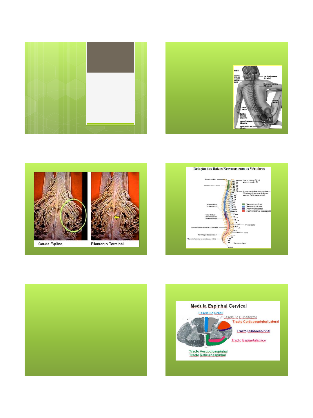 1 Lesões Medulares Prof. MSc. Hudson Pinheiro Medula Espinhal ÓRGÃO MAIS SIMPLES ONDE O TUBO NEURAL FOI MENOS MODIFICADO DURANTE O DESENVOLVIMENTO; É UMA MASSA CILINDRÓIDE DE TECIDO NERVOSO SITUADA DENTRO DO CANAL VERTEBRAL; NO HOMEN ADULTO MEDE APROXIMADAMENTE 45 CENTÍMETROS. CRANIALMENTE A MEDULA LIMITA-SE COM O BULBO, APROXIMADAMENTE AO NÍVEL DO FORAME MAGNO DO OSSO OCCIPTAL; O LIMITE CAUDAL DA MEDULA TEM IMPORTÂNCIA CLÍNICA E NO ADULTO SITUA-SE GERALMENTE NA 2ª VÉRTEBRA LOMBAR (L2); VIAS ASCENDENTES: FUNÍCULO POSTERIOR (TRACTO DO FASCÍCULO GRÁCIL E CUNEIFORME); FUNÍCULO LATERAL (TRACTO ESPINOTALÂMICO LATERAL E TRACTOS ESPINOCEREBELARES); FUNÍCULO ANTERIOR (TRACTO ESPINOTALÂMICO ANTERIOR). VIAS DESCENDENTES: FUNÍCULO LATERAL (TRACTO CORTICOESPINHAL LATERAL E TRACTO RUBROESPINHAL); FUNÍCULO ANTERIOR (TRACTO CORTICOESPINHAL ANTERIOR E TRACTO RETICULOESPINHAL). 2 GRÁCIL E CUNEIFORME: Propriocepção consciente: permite sem auxílio da visão, situar uma parte do corpo ou perceber o seu movimento; Tato discriminativo: permite localizar e descrever as características táteis de um objeto; Sensibilidade Vibratória: Percepção de estímulos mecânicos repetitivos (Diapasão) Esterognosia: Capacidade de perceber com as mãos a forma e o tamanho de um objeto. Vias Ascendentes do Funículo Anterior O TRATO ESPINOTALÂMICO ANTERIOR: identifica informações referentes ao tato grosseiro (tato leve) e pressão; O TRACTO ESPINOTALÂMICO LATERAL: (o tamanho desse tracto aumenta à medida que ele sobe na medula pela constante adição de novas fibras) é responsável pelas informações dolorosas e referentes à temperatura. “Em casos de dor decorrente, principalmente de câncer, aconselha-se o tratamento cirúrgico por secção do tracto espino – talâmico. O TRACTO ESPINO CEREBELAR POSTERIOR: Responsáveis por impulsos de propriocepção inconsciente originados em fusos neuro musculares e órgãos neurotendinosos; O TRACTO ESPINO CEREBELAR ANTERIOR: penetram no cerebelo, levando informações de receptores periféricos e da própria medula. CARACTERÍSITICAS DAS VIAS DESCENDENTES: DIVIDEM-SE EM DOIS GRUPOS: VIAS PIRAMIDAIS E EXTRAPIRAMIDAIS VIAS PIRAMIDAIS: Antes de penetrar na medula, passam pela pirâmides bulbares; VIAS EXTRAPIRAMIDAIS : Não passam pelas pirâmides bulbares. 3 VIAS EXTRAPIRAMIDAIS: TECTO – ESPINHAL: Tronco e musculatura proximal; VESTÍBULO – ESPINHAL: Tronco e musculatura proximal Manutenção do equilíbrio e postura básica; RETÍCULO – ESPINHAL: Tronco e musculatura proximal Manutenção do equilíbrio e postura básica; RUBRO – ESPINHAL: (Motricidade da parte distal dos membros) LESÃO MEDULAR PERDA OU REDUÇÃO IMEDIATA DAS FUNÇÕES FÍSICAS ; LESÃO COMPLETA X LESÃO INCOMPLETA; PARAPLEGIA (Paresia) X TETRAPLEGIA SÍNDROMES MEDULARES INCIDÊNCIA DE LESÃO MEDULAR TRAUMÁTICA COLUNA CERVICAL INFERIOR (C5-C7); COLUNA TORÁCICA MÉDIA (T4-T7); COLUNA TÓRA-LOMBAR (T10-L2). ADULTO JOVEM (30 ANOS) HOMENS (86,2%) Etiologia da lesão medular traumática Acidentes de trânsito (47,1%) - Automóvel (30,8%) - Motocicleta (9,1%) - Bicicleta (3,2%) - Atropelamento (3,9%) FPAF (18,9%) Queda de altura (16,4%) Mergulho em águas rasas (5,3%) Tumor (3,9%) FPAB (1,9%) Outros (1,9%) 4 Fisiopatologia da Lesão Medular EDEMA ESMAGAMENTO COMPRESSÃO SECÇÃO PARCIAL OU TOTAL HEMORRAGIA INFARTO 5 Fases Psicológicas da Lesão medular FASE DE CHOQUE FASE DE NEGAÇÃO FASE DE RECONHECIMENTO FASE DE ADAPTAÇÃO QUADRO CLÍNICO Choque medular Anestesia superficial e profunda Paralisia flácida Vasodilatação paralítica Anidrose Arreflexia vesical e atonia intestinal Ausência de ejaculação e ereção no homem Ausência de ereção clitoriana, lubrificação vaginal e amenorréia na mulher Pode durar por dias, semanas ou meses, sendo mais comum 3 semanas. SEGUNDA FASE: RETORNO DA ATIVIDADE MEDULAR REFLEXA Reorganização funcional das estruturas medulares localizadas abaixo do nível da lesão; Lesões completas, anestesia e paralisia persistente; Paralisia flácida por ausência do arco reflexo (NMI); Paralisia hipertônica com o arco reflexo preservado (NMS); Sinal de Babinski, reflexos cutâneo anal e bulbocavernoso são os primeiros a se manifestar; Controle vasomotor reinicia-se (SNA); Bexiga neurogênica (manifesta o comportamento futuro); Disfunção intestinal (evacuação reflexa intermitente); Alterações sexuais (funções dependem do tipo e nível de lesão) Amenorréia cede; Concepção intacta. INSTALAÇÃO DO QUADRO CLÍNICO DE ACORDO COM O NÍVEL DA LESÃO: NEURÔNIO MOTOR SUPERIOR; NEURÔNIO MOTOR INFERIOR. 6 LESÃO MEDULAR ARREFLEXIA FLACIDEZ PERDA DA SENSIBILIDADE ABAIXO DA LESÃO QUADRO CLÍNICO Controle térmico: perda da capacidade de tremer, perda da resposta de vasodilatação e vasoconstrição, ausência de sudorese termorreguladora; Espasticidade; Deficiências respiratórias: irá variar dependendo do nível da lesão. Lesão de C1 a C3, perda do nervo frênico. Redução da expansão torácica comprometendo a eficácia da tosse e remoção de secreção. Padrão respiratório alterado, com achatamento e redução da expansão da parede torácica anterior e elevação epigástrica; Auterações no SNA HÁ DOIS TIPOS DE INTESTINO: INTESTINO REFLEXO: POSSUI ARCO REFLEXO PRESERVADO, PERISTALTISMO DIMINUÍDO E NÃO TÊM CONTRAÇÃO INTESTINAL (S2 A S4 RESPONSÁVEL PELO ESVAZIAMENTO INTESTINAL); INTESTINO AUTÔNOMO OU NÃO REFLEXO: PERISTALTISMO TAMBÉM ESTÁ DIMINUÍDO, MAS NÃO CONSEGUE FAZER AS FEZES DESCEREM, FORMANDO FECALOMAS. Há dois tipos de bexiga: Bexiga Neurogênica Reflexa: lesões de NMS, espástica, paredes espessas, trabeculadas e com imagem radiológica que parece um árvore de natal. Bexiga Neurogênica autônoma ou não-reflexa: lesões de NMI, flácidas (sem ação reflexa do detrusor), grande volume, retenção urinária (volume residual alto). CATETERIZAÇÃO significa introduzir um fino tubo, denominado cateter