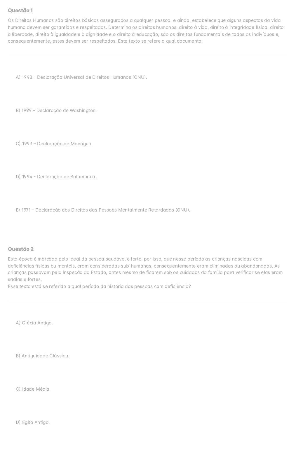 Questo Os Dieitos Humnos so dieitos bsicos ssegudos quque pesso, e ind, estbeece que guns spectos d vid humn devem se gntidos e espeitdos. Detemin os dieitos humnos: dieito vid, dieito integidde físic, dieito ibedde, dieito igudde e dignidde e o dieito educço, so os dieitos fundmentis de todos os indivíduos e, consequentemente, estes devem se espeitdos. Este texto se efee qu documento: A� 8 � Decço Unives de Dieitos Humnos �ONU�. B� � Decço de Wshington. C� � Decço de Mngu. D� � Decço de Smnc. E� 7 � Decço dos Dieitos ds Pessos Mentmente Retdds �ONU�. Questo 2 Est époc é mcd peo ide d pesso sudve e fote, po isso, que nesse peíodo s cinçs nscids com deficiêncis físics ou mentis, em consideds sub-humns, consequentemente em eiminds ou bndonds. As cinçs pssvm pe inspeço do Estdo, ntes mesmo de ficem sob os cuiddos d fmíi p veific se es em sdis e fotes. Esse texto est se efeido qu peíodo d histói ds pessos com deficiênci? A� éci Antig. B� Antiguidde Cssic. C� Idde Médi. D� Egito Antigo. Highlight E� Rom Antig. Questo A educço especi o Bsi foi infuencido po gums expeiêncis concetizds n Euop e nos EUA. É impotnte evidenci que n histói d Educço Especi no Bsi, existem dus vetentes pedgógics: médico-pedgógic e psicopedgógic que fom obsevds dunte histói d Educço Especi no Bsi. Recione pimei coun com segund, de codo com s ccteístics de cd um ds dus vetentes. Vetente médico- pedgógic As decisões ecionds com o dignóstico e com s ptics pedgógics so subodinds o médico. 2 Vetente piscopedgógic Utiizm um esc métic de inteigênci, o que epesentou um nov fom de cssific s pessos com deficiênci, com bse nos citéios de poveitmento esco. O médico esco e o pofission que cssificv pesso com deficiênci. Em considedos nomis todos os unos que em cpzes de se dpt s condições de vid dii. Foi, tmbém, infuencid pes efoms do sistem educcion, poposts peo movimento d Esco Nov. Tinh um fich p infom s condições físics, os ddos ntopométicos e os spectos cognitivos do uno. A� 2, , , 2, 2, . B� 2, 2, 2, , , . C� , 2, 2, 2, , . D� , 2, , 2, 2, . E� , , , 2, 2, 2. Questo Aguns bsieios, infuencidos po expeiêncis eizds po médicos, fiósofos e educdoes de outos píses, d Euop e dos Estdos Unidos, começm ogniz seviços votdos p o tendimento ds pessos com deficiênci sensoiis, mentis e físics. É nesse contexto, que em 2 de setembo de 85, o Impedo D. Pedo II, ci o _________________________________. Mque tentiv que peenche cun. A� Impei Instituto p Meninos Sudos. B� Impei Instituto de Sudos-Mudos. C� Impei Instituto dos Meninos Cegos e Sudos-Mudos. D� Impei Instituto dos Meninos Cegos. E� Impei Instituto p Deficientes Físicos. Questo 5 Foi pti do dvento do Cistinismo que s pessos com deficiênci pssm se consides como citus de Deus, que têm m e pecism de cuiddos. As pimeis pessos expic sobe s deficiêncis e ci s instituições p tende s pessos com deficiênci tivem um ppe muito impotnte n histói d Educço Especi. Recione pimei coun com segund coun, efeente o ppe dos estudiosos segui no econhecimento d pesso com deficiênci. Toms Wiis Contibui p o pocesso de ensino ds pessos com deficiênci, o esst que expeiênci sensoi deve se bse n ptic pedgógic e, ind, que deve hve individuidde no pocesso de pendizgem. 2 Ches Miche de L’Epée É conhecido como o pi dos sudos, fundou pimei esco púbic p sudos em Pis. Louis Bie Pubicou o pimeio ivo que expicv cientificmente que deficiênci ment e devido s estutus ceebis defeituoss. John Locke Monge espnho beneditino, foi o pimeio educdo de sudos d histói. Ee Highlight dedicou um bo pte d su vid o ensino de sudos, fihos de nobes. 5 Pedo Ponce de Léon Adptou o código miit de comunicço notun. Esse código ficou conhecido inicimente peo nome de sonogfi e, posteiomente, Bie. Assine tentiv que pesent coet ssociço ente s dus couns. A� , 5, , , 2. B� 5, , 2, , . C� 2, , , , 5. D� , 2, 5, , . E� , 2, , 5, . Questo “A décd de 0, po exempo, testemunhou o boom de instituições especiizds, tis como: escos especiis, centos de hbiitço, centos de ebiitço, oficins potegids de tbho, cubes sociis especiis, ssocições despotivs especiis” �SASSAKI, 2002, p. �. A ciço dests instituições tinh como objetivo: A� Incui n sociedde s pessos com deficiênci, que conseguissem se dpt esss instituições, pois se es conseguim tbh, estud, convive ente si, estvm pts p seem incuíds n sociedde. B� Fonece todos os seviços possíveis, j que sociedde no ceitv que s pessos com deficiênci tivessem cesso os seviços existentes n comunidde. C� Cpcit s pessos com deficiênci, p que es possm se incuíds n sociedde, po meio do tbho. D� nti dieitos iguis p s pessos com deficiênci, j que esss instituições tendim tods s necessiddes que es pecisvm p se incuíds, po exempo, educço, ze, espote, cutu, etc. Highlight Highlight E� Possibiit que tods s pessos com deficiênci tivessem um tendimento especiizdo de codo com su deficiênci, po exempo, s pessos suds seim tendids po instituições especiizds em deficiênci uditiv. Questo 7 N décd de 0, sugem s pimeis ssocições ognizds po pessos peocupds com questo ds pessos com deficiênci. Nesse mesmo peíodo, pemente, se tem gums ções govenmentis pnejndo ciço ds instituições p tende s necessiddes ds pessos com deficiênci. Recione pimei coun com segund coun. Instituto Pestozzi do Bsi Educ cinçs com deficiênci visu em idde esco 2 Instituto Snt Teezinh Atendimento de pessos com deficiênci ment. L-Esco So Fncisco Funcionv em egimento de intento e ecebi, pens, menins suds. Instituto de Cegos Pde Chico Especiizd n ebiitço de pessos com deficiênci físic. A� , , , 2. B� , 2, , . C� , 2, , . D� , , 2, . E� , , 2, . Questo 8 Segundo Ssski �2002�, integço soci iniciou o pocu insei s pessos com deficiênci os sistems sociis, como educço, o tbho, fmíi e o ze. O uto eucid que ess bodgem teve incentivo de cetos pincípios e espectiv
