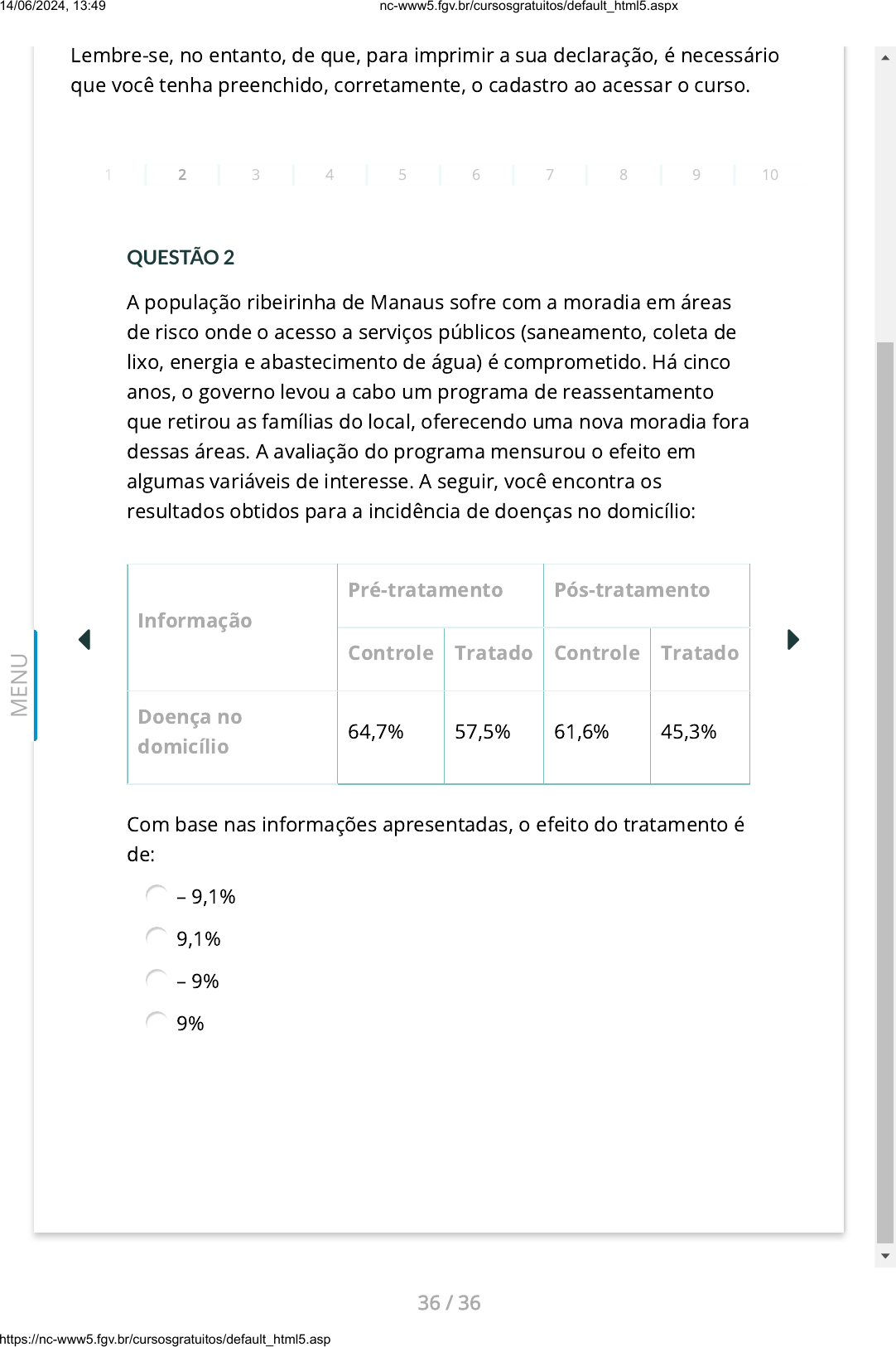 Bem-vindo(a) Adrielly Santana Costa Lembre-se, no entanto, de que, para imprimir a sua declaração, é necessário que você tenha preenchido, corretamente, o cadastro ao acessar o curso. QUESTÃO 2 A população ribeirinha de Manaus sofre com a moradia em áreas de risco onde o acesso a serviços públicos (saneamento, coleta de lixo, energia e abastecimento de água) é comprometido. Há cinco anos, o governo levou a cabo um programa de reassentamento que retirou as famílias do local, oferecendo uma nova moradia fora dessas áreas. A avaliação do programa mensurou o efeito em algumas variáveis de interesse. A seguir, você encontra os resultados obtidos para a incidência de doenças no domicílio: Informação Pré-tratamento Pós-tratamento Controle Tratado Controle Tratado Doença no domicílio 64,7% 57,5% 61,6% 45,3% Com base nas informações apresentadas, o efeito do tratamento é de: – 9,1% 9,1% – 9% 9% 1 2 3 4 5 6 7 8 9 10 36 / 36 M EN U 14/06/2024, 13:49 nc-www5.fgv.br/cursosgratuitos/default_html5.aspx https://nc-www5.fgv.br/cursosgratuitos/default_html5.aspx 1/1