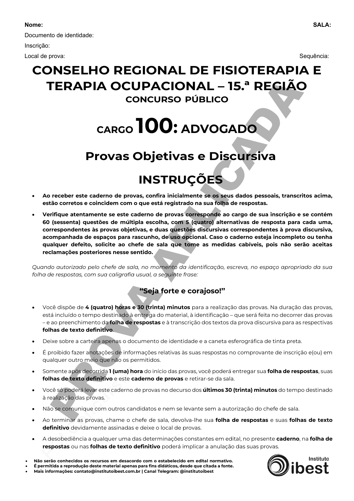 pcimarkpci MjgwNDowMTRkOjU2ODU6ODcwZTo3MWRjOjIzOWI6Yjg1Yzo4ZWY3:RnJpLCAxNCBKdW4gMjAyNCAxOTozNjoxOSAtMDMwMA== www.pciconcursos.com.br SALA: Nome: Documento de identidade: Inscrição: Local de prova: Sequência: CONSELHO REGIONAL DE FISIOTERAPIA E TERAPIA OCUPACIONAL – 15.ª REGIÃO CONCURSO PÚBLICO CARGO 100: ADVOGADO Provas Objetivas e Discursiva INSTRUÇÕES • Ao receber este caderno de provas, confira inicialmente se os seus dados pessoais, transcritos acima, estão corretos e coincidem com o que está registrado na sua folha de respostas. • Verifique atentamente se este caderno de provas corresponde ao cargo de sua inscrição e se contém 60 (sessenta) questões de múltipla escolha, com 5 (quatro) alternativas de resposta para cada uma, correspondentes às provas objetivas, e duas questões discursivas correspondentes à prova discursiva, acompanhada de espaços para rascunho, de uso opcional. Caso o caderno esteja incompleto ou tenha qualquer defeito, solicite ao chefe de sala que tome as medidas cabíveis, pois não serão aceitas reclamações posteriores nesse sentido. Quando autorizado pelo chefe de sala, no momento da identificação, escreva, no espaço apropriado da sua folha de respostas, com sua caligrafia usual, a seguinte frase: ‘‘Seja forte e corajoso!’’ • Você dispõe de 4 (quatro) horas e 30 (trinta) minutos para a realização das provas. Na duração das provas, está incluído o tempo destinado à entrega do material, à identificação – que será feita no decorrer das provas – e ao preenchimento da folha de respostas e à transcrição dos textos da prova discursiva para as respectivas folhas de texto definitivo. • Deixe sobre a carteira apenas o documento de identidade e a caneta esferográfica de tinta preta. • É proibido fazer anotações de informações relativas às suas respostas no comprovante de inscrição e(ou) em qualquer outro meio que não os permitidos. • Somente após decorrida 1 (uma) hora do início das provas, você poderá entregar sua folha de respostas, suas folhas de texto definitivo e este caderno de provas e retirar-se da sala. • Você só poderá levar este caderno de provas no decurso dos últimos 30 (trinta) minutos do tempo destinado à realização das provas. • Não se comunique com outros candidatos e nem se levante sem a autorização do chefe de sala. • Ao terminar as provas, chame o chefe de sala, devolva-lhe sua folha de respostas e suas folhas de texto definitivo devidamente assinadas e deixe o local de provas. • A desobediência a qualquer uma das determinações constantes em edital, no presente caderno, na folha de respostas ou nas folhas de texto definitivo poderá implicar a anulação das suas provas. • Não serão conhecidos os recursos em desacordo com o estabelecido em edital normativo. • É permitida a reprodução deste material apenas para fins didáticos, desde que citada a fonte. • Mais informações: contato@institutoibest.com.br | Canal Telegram: @institutoibest PR OV A AP LI CA DA pcimarkpci MjgwNDowMTRkOjU2ODU6ODcwZTo3MWRjOjIzOWI6Yjg1Yzo4ZWY3:RnJpLCAxNCBKdW4gMjAyNCAxOTozNjoxOSAtMDMwMA== www.pciconcursos.com.br CREFITO-15 100-ADVOGADO 1 Nas questões que avaliarem conhecimentos de informática e(ou) tecnologia da informação, a menos que seja explicitamente informado o contrário, considere que todos os programas mencionados estão em configuração- padrão e que não há restrições de proteção, de funcionamento e de uso em relação aos programas, arquivos, diretórios, recursos e equipamentos mencionados. CONHECIMENTOS BÁSICOS Texto para as questões de 1 a 10. 1 4 7 10 13 16 19 22 25 28 31 A “inocência” moderna fala do poder como se ele fosse um: de um lado, aqueles que o têm, de outro, os que não o têm; acreditamos que o poder fosse um objeto exemplarmente político; acreditamos agora que é também um objeto ideológico, que ele se insinua nos lugares onde não o ouvíamos de início, nas instituições, nos ensinos, mas, em suma, que ele é sempre uno. Adivinhamos então que o poder está presente nos mais finos mecanismos do intercâmbio social: não somente no Estado, nas classes, nos grupos, mas ainda nas modas, nas opiniões correntes, nos espetáculos, nos jogos, nos esportes, nas informações, nas relações familiares e privadas, e até mesmo nos impulsos liberadores que tentam contestá-lo: chamo discurso de poder todo discurso que engendra o erro e, por conseguinte, a culpabilidade daquele que o recebe. Alguns esperam de nós, intelectuais, que nos agitemos a todo momento contra o Poder; mas nossa verdadeira guerra está alhures: ela é contra os poderes, e não é um combate fácil: pois, plural no espaço social, o poder é, simetricamente, perpétuo no tempo histórico: expulso, extenuado aqui, ele reaparece ali; nunca perece; façam uma revolução para destruí-lo, ele vai imediatamente reviver, regerminar no novo estado de coisas. A razão dessa resistência e dessa ubiquidade é que o poder é o parasita de um organismo trans-social, ligado à história inteira do homem, e não somente à sua história política, histórica. Esse objeto em que se inscreve o poder, desde toda eternidade humana, é: a linguagem — ou, para ser mais preciso, sua expressão obrigatória: a língua. Roland Barthes. Aula. São Paulo: Cultrix, 2007 (com adaptações). QUESTÃO 1 De acordo com a concepção defendida pelo autor do texto, o poder (A) concentra-se sob o domínio de um grupo específico. (B) está disperso nas relações sociais. (C) deixou de ser um objeto político. (D) pode gerar riqueza ou pobreza. (E) é contrário aos discursos ideológicos. QUESTÃO 2 Conforme as ideias do texto, o principal meio que leva o poder a perpassar toda a história da humanidade é a (A) língua. (B) desigualdade. (C) família. (D) guerra. (E) política. QUESTÃO 3 Sem prejuízo da correção gramatical do texto e das relações coesivas nele estabelecidas
