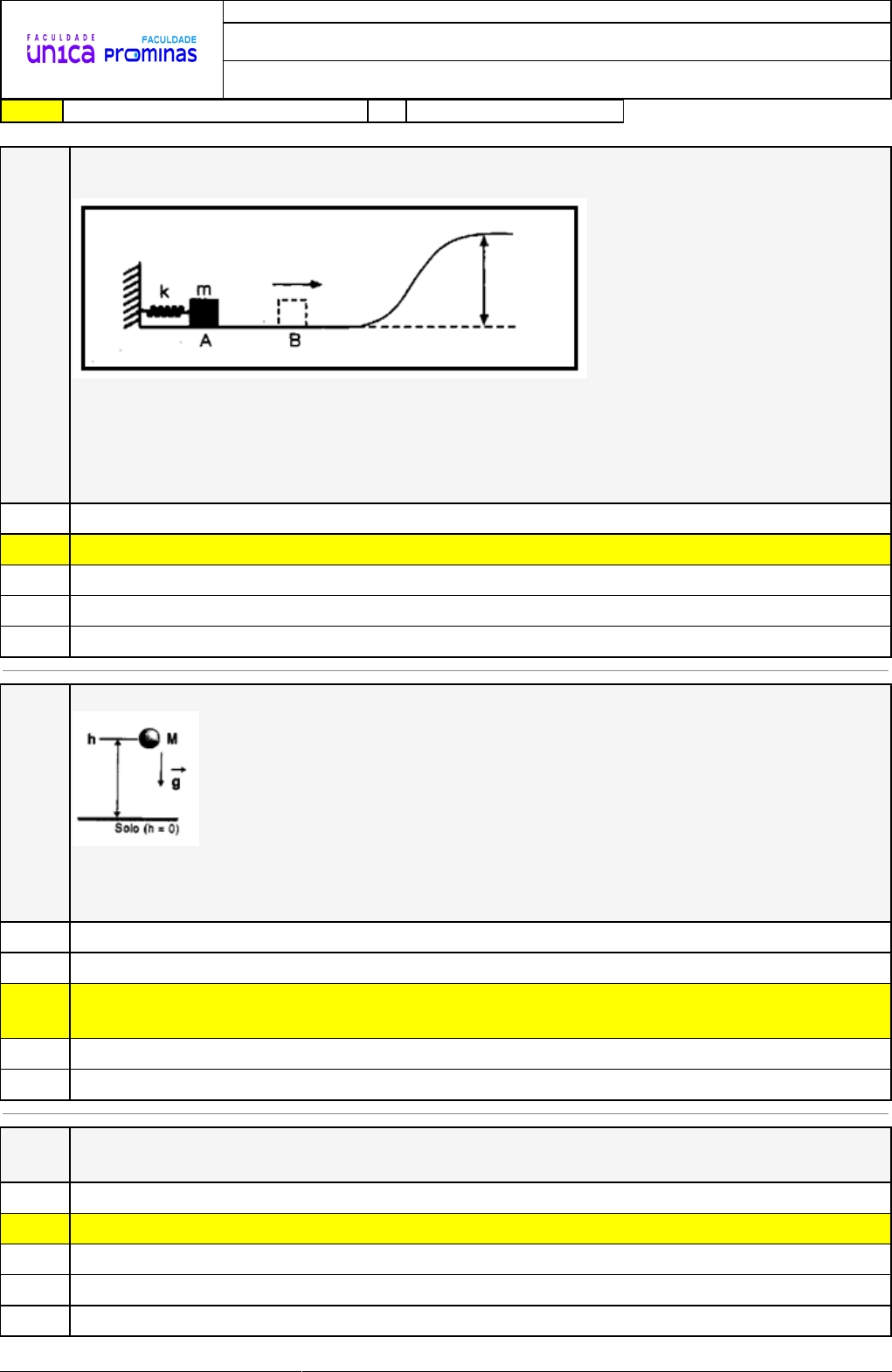 13/06/2024 13:29:59 1/3 REVISÃO DE SIMULADO Nome: SEBASTIÃO FRANCINEIS PEREIRA DA SILVA Disciplina: Física I Respostas corretas são marcadas em amarelo X Respostas marcardas por você. Questão 001 UFV Um corpo de massa 3 kg é empurrado contra uma mola de constante elástica k = 500 N/m, comprimindo-a 40 cm. Ele é liberado e a mola o projeta ao longo de uma superfície horizontal que termina em uma rampa inclinada conforme figura. Determine a altura máxima atingida considerando após abandonar a mola o corpo percorra uma superfície rugosa , havendo uma perda de 15 % da energia mecânica do corpo do ponto de partida ao ponto mais alto atingido. A) 9,96 m B) 1,13 m C) 0,48 m. D) 1,60 m X E) 0,84 m Questão 002 Observe a figura. Uma esfera de massa m = 100 g foi solta de uma altura h em relação ao solo. Ao tocar o solo, a esfera realizou um trabalho de T = 3,0 joules. Desprezando a resistência do ar, é correto afirmar que A) a energia cinética da esfera, a uma altura h = 2,0 m vale 2,0 joules. B) a velocidade da esfera ao tocar o solo, vale 5,5 m/s. X C) a velocidade da esfera, ao passar pelo ponto médio da altura h, vale, aproximadamente, 5,5 m/s. D) a energia cinética da esfera no ponto médio da altura vale 2,0 joules. E) a energia cinética da esfera, ao tocar o solo, vale 2,0 joules. Questão 003 Um objeto é lançado verticalmente para cima, desconsiderando os efeitos de forças dissipativas. Pode-se afirmar que no ponto mais alto de sua trajetória: A) A energia cinética é máxima. B) A energia potencial é máxima. X C) A energia cinética é igual a energia potencial. D) A energia potencial elástica é máxima. E) A energia mecânica é nula. 13/06/2024 13:29:59 2/3 Questão 004 Um corpo é abandonado, em queda livre, de um ponto situado à altura h = 100 m do solo. Pode-se afirmar que A) a energia cinética é máxima no ponto de máxima altura. B) ao atingir o solo, a energia potencial é máxima. C) quando atinge o solo, a energia cinética é igual à potencial. D) no ponto de altura máxima, a energia potencial é o dobro da cinética. X E) após descer 50 m, a energia cinética é igual à potencial. Questão 005 (UFF) A figura 1 mostra o instante em que um pequeno bloco de massa 0,50kg é abandonado, sem velocidade, do ponto A de uma rampa. No trecho AB da rampa, o atrito é desprezível, mas em BC deve ser considerado. A figura 2 mostra o instante em que o bloco, após atingir a mola ideal, de constante elástica igual a 1,5.102 N/m, causa à mesma uma deformação máxima igual a 0,20m: Utilize os dados apresentados a velocidade do bloco ao atingir o ponto B é de A) 2 m/s B) 8 m/s X C) 4 m/s D) 6 m/s E) 10 m/s Questão 006 O gráfico abaixo mostra como varia a intensidade da força elástica sobre uma mola. Utilizando um bloco , m = 4 kg, para comprimir a mola citada e comprimindo-a 15 cm, antes de abandonar o bloco. Calcule a velocidade do bloco ao abandonar a mola. A) 9,18 m/s X B) 18,93 m/s C) 16,77 m/s D) 23,56 m/s E) 26,67 m/s 13/06/2024 13:29:59 3/3 Questão 007 Um corpo escorrega sobre a pista sem atrito que aparece na Figura. Inicialmente, no ponto P, o corpo desce com a velocidade Vo = 6 m/s, sabendo que sua massa 1 Kg, determine a altura que o corpo foi abandonado. X A) 6,8 m. B) 7,2 m. C) 10,1 m. D) 9,6 m. E) 5,0 m. Questão 008 Um corpo, de massa m = 2,0 kg, move-se sobre uma superfície horizontal com atrito, indo de encontro de uma mola cuja a constante elástica é k = 100 N/m. A velocidade do corpo imediatamente antes de atingir a mola é = 3,0 m/s. O corpo comprime a mola X = 40 cm, chegando ao repouso no ponto B. Qual é o trabalho realizado pelo atrito no deslocamento do corpo de A até B ? A) 1 J B) -1 J C) -3 J X D) -2 J E) 2 J