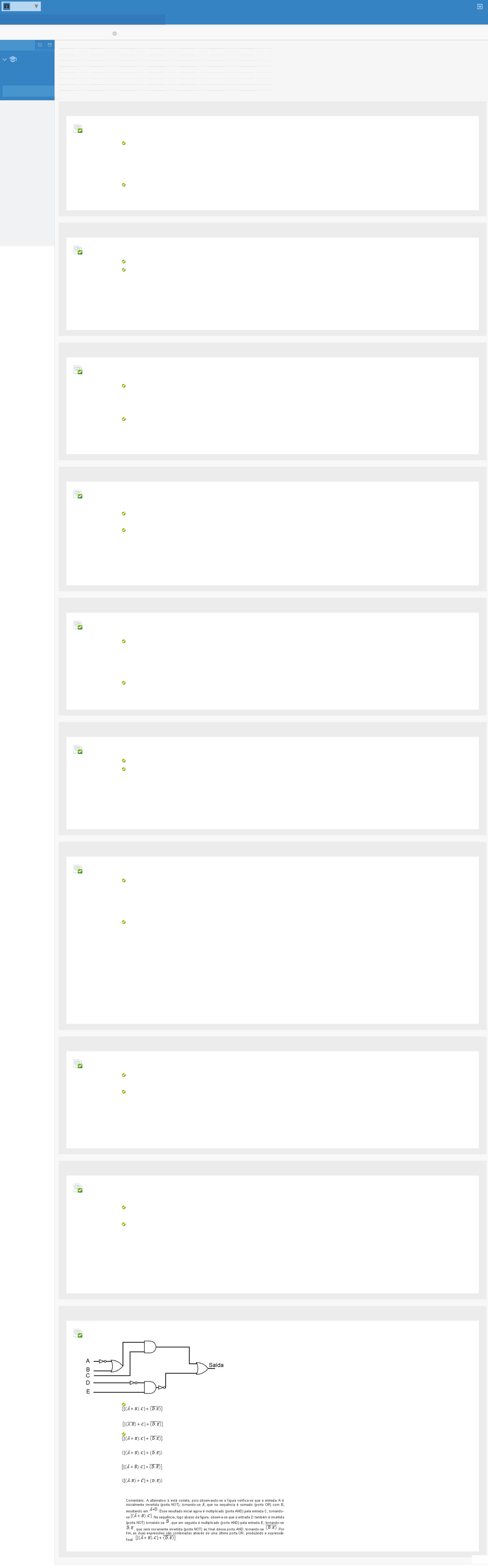 Revisar envio do teste: QUESTIONÁRIO UNIDADE IORGANIZAÇÃO DE COMPUTADORES 3062-60_57501_R_E1_20241 CONTEÚDO ORGANIZAÇÃO DE COMPUTADORES (3062- 60_57501_R_E1_20 241) CONTEÚDO Quarta-feira, 29 de Maio de 2024 00h29min52s BRT Usuário HEBERT SOUZA DIAS Curso ORGANIZAÇÃO DE COMPUTADORES Teste QUESTIONÁRIO UNIDADE I Iniciado 29/05/24 00:20 Enviado 29/05/24 00:29 Status Completada Resultado da tentativa 2,5 em 2,5 pontos Tempo decorrido 8 minutos Resultados exibidos Todas as respostas, Respostas enviadas, Respostas corretas, Comentários, Perguntas respondidas incorretamente Pergunta 1 Resposta Selecionada: e. Respostas: a. b. c. d. e. Comentário da resposta: Um computador pode ser de�nido como uma máquina constituída de partes eletrônicas e/ou eletromecânicas capazes de manipular e fornecer, de forma sistemática, dados e informações para uma gama variada de aplicações. Dessa forma, os dados também podem ser de�nidos como: A matéria-prima ou entrada original a ser processada. Unidades operacionais pertencentes à arquitetura e suas interconexões. Atributos que possuem impacto direto sobre a execução lógica em um programa de computador. Unidades operacionais pertencentes à arquitetura e suas interconexões. Operações realizadas pelo processador, fornecendo instruções para a realização da movimentação de dados. A matéria-prima ou entrada original a ser processada. Resposta: E Comentário: De acordo com o livro-texto, dado e informação podem ser tratados como sinônimos, de forma que o dado também pode ser de�nido como a matéria-prima ou entrada original a ser processada. Pergunta 2 Resposta Selecionada: a. Respostas: a. b. c. d. e. Comentário da resposta: Ao longo de seu desenvolvimento, os computadores possuíram diversos estágios nos quais foram introduzidos diferentes níveis de abstração e organização para tratamento de dados e instruções. Na atualidade são aceitos basicamente 6 níveis, compostos por: Nível lógico digital, nível de microarquitetura, nível de arquitetura de conjunto de instruções, nível do sistema operacional da máquina, nível de linguagem de montagem e nível de linguagem orientado a problemas. Nível lógico digital, nível de microarquitetura, nível de arquitetura de conjunto de instruções, nível do sistema operacional da máquina, nível de linguagem de montagem e nível de linguagem orientado a problemas. Nível de estruturas do sistema operacional, nível de gerenciamento de processos, nível de threads, nível de sincronização de processos, nível de escalonamento da CPU e nível de gerenciamento de memória. Nível de cálculo de predicados, nível de busca heurística, nível de métodos estocásticos, nível de algoritmos de controle, nível de representação do conhecimento e nível de aprendizado de máquina. Nível físico, nível de enlace, nível de rede, nível de transporte, nível se sessão e nível de apresentação. Nível de endereçamento, nível de encapsulamento, nível de repasse, nível de roteamento, nível de desencapsulamento e nível de circuito virtual. Resposta: A Comentário: Na atualidade, de acordo com o livro-texto, são aceitos basicamente 6 níveis, que vão do Nível 0 ou nível lógico digital, Nível 1 ou nível de microarquitetura (hardware), Nível 2 ou nível de conjunto de instruções, Nível 3 ou nível de sistema operacional, Nível 4 ou nível de linguagem de montagem, Nível 5 ou nível de linguagem orientado à problemas. Pergunta 3 Resposta Selecionada: d. Respostas: a. b. c. d. e. Comentário da resposta: Os computadores modernos foram desenvolvidos no início do século XX, mais precisamente entre os anos 1930 e 1940, como uma ferramenta de auxílio ao ser humano na simpli�cação de problemas matemáticos de ordem complexa. Com o passar dos anos, as tecnologias empregadas em seu desenvolvimento (válvulas, relés, transistores, circuitos integrados) foram modi�cadas para computadores cada vez menores. Nesse contexto, assinale qual das alternativas referente à evolução dos computadores contempla em qual geração surgiu o primeiro PC (personal computer – computador pessoal). Quarta geração. Primeira geração. Segunda geração. Terceira geração. Quarta geração. Quinta geração. Resposta: D Comentário: A quarta geração ou VLSI, iniciada em 1980, possibilitou o desenvolvimento dos microcomputadores ou PCs (personal computer – computador pessoal), dispositivos su�cientemente pequenos e baratos (se comparados aos mainframes) e de fácil fabricação, tornando seu acesso facilitado ao público em geral. Pergunta 4 Resposta Selecionada: b. Respostas: a. b. c. d. e. Comentário da resposta: A primeira geração de computadores (1936–1953) foi caracterizada essencialmente pela utilização de válvulas como principal componente elétrico no chaveamento de corrente, processo responsável pelo funcionamento lógico do computador para realizar cálculos matemáticos. Em 1946 os cientistas John Mauchly e John Presper Eckert desenvolveram uma máquina revolucionária e e�ciente na realização de cálculos balísticos para o governo americano e que também �cou conhecida como o primeiro computador totalmente eletrônico de uso geral. Esse computador foi: ENIAC. EDVAC. ENIAC. Z1. RAMAC. TX-0. Resposta: B Comentário: Em 1946 os cientistas John Mauchly e John Presper Eckert desenvolveram o ENIAC (Electronic Numerical Integrator and Computer – computador integrador numérico eletrônico), que �cou conhecido como o primeiro computador totalmente eletrônico de uso geral. Pergunta 5 Resposta Selecionada: e. Respostas: a. b. c. d. e. Comentário da resposta: A necessidade da criação dos sistemas operacionais surgiu quando o usuário precisava operar um computador durante os anos 1960 e o único acesso para a máquina era através do acesso direto ao hardware. Assim, durante a segunda geração de computadores (1955-1965) surgiram os p