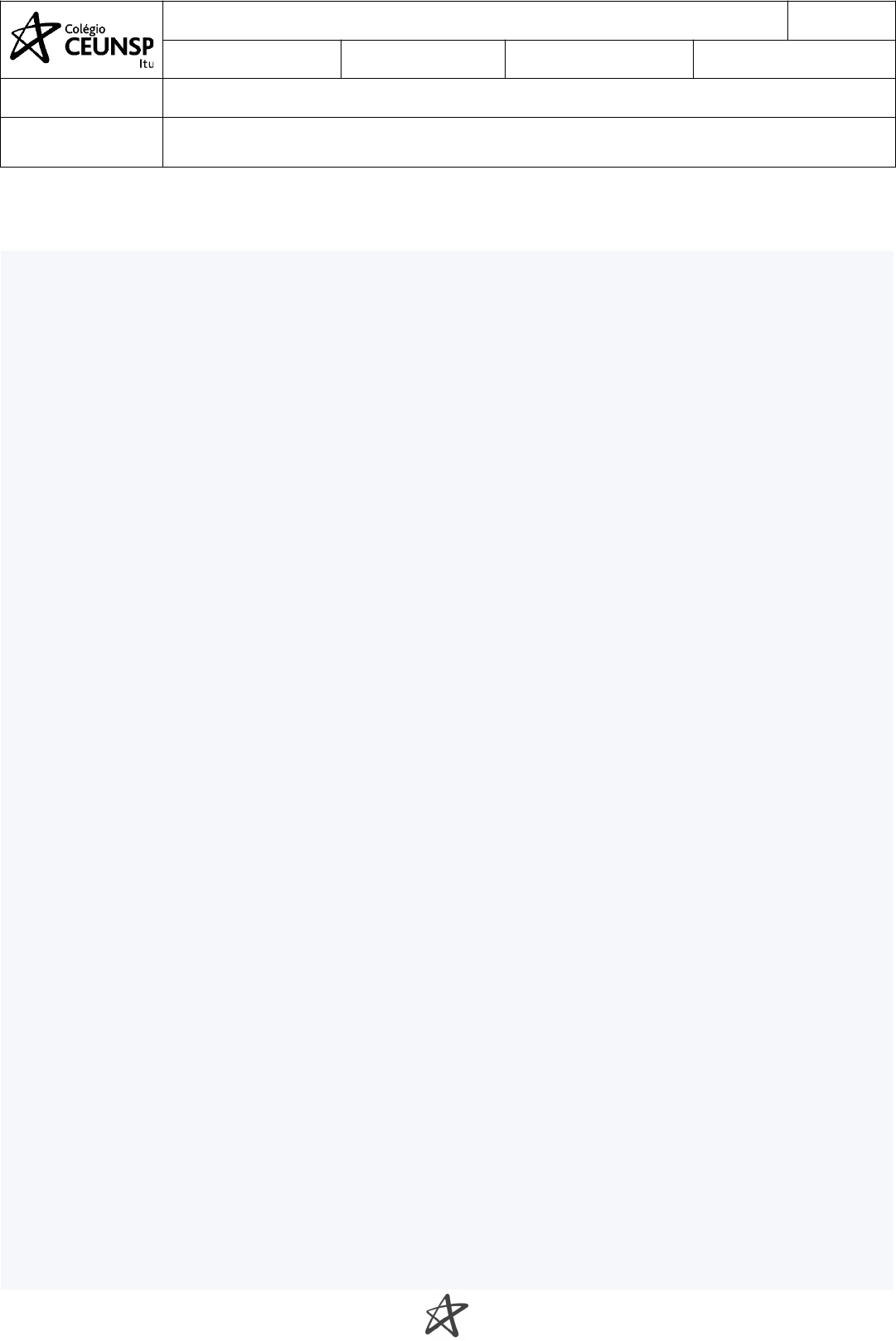ALUNO(A): Nº.: ENSINO MÉDIO SÉRIE: 3ª SÉRIE TURMA: ( ) L ( ) M DATA: ___ / ___ / 2024 1º BIMESTRE PROFESSOR(A): BRUNA CEZAR NOTA: _____ SIMULADO DE LITERATURA Estudos Literários (Enem-Inep) Metáfora Gilberto Gil Uma lata existe para conter algo, Mas quando o poeta diz: “Lata” Pode estar querendo dizer o incontível Uma meta existe para ser um alvo, Mas quando o poeta diz: “Meta” Pode estar querendo dizer o inatingível Por isso não se meta a exigir do poeta Que determine o conteúdo em sua lata Na lata do poeta tudonada cabe, Pois ao poeta cabe fazer Com que na lata venha caber O incabível Deixe a meta do poeta, não discuta Deixe a sua meta fora da disputa Meta dentro e fora, lata absoluta Deixe-a simplesmente metáfora. Disponível em: http://www.letras.terra.com.br. Acesso em: 5 fev. 2009. 46. A metáfora é a figura de linguagem identificada pela comparação subjetiva, pela semelhança ou analogia entre elementos. O texto de Gilberto Gil brinca com a linguagem remetendo-nos a essa conhecida figura. O trecho em que se identifica a metáfora é: a) “Uma lata existe para conter algo”. b) “Mas quando o poeta diz: ‘Lata'”. c) “Uma meta existe para ser um alvo”. d) “Por isso não se meta a exigir do poeta”. e) “Que determine o conteúdo em sua lata”. Leia a tirinha 47. O discurso: “Filho, você é o meu sol!” é um exemplo de figura de palavra, já que consiste na mudança do sentido literal de “sol”. Como essa figura de linguagem é classificada? a) Hipérbole. b) Eufemismo. c) Metáfora. d) Comparação. e) Paradoxo. 48. Identifique a figura de linguagem predominante no quadrinho abaixo. a) Ironia b) Paronomásia c) Hipérbole d) Metáfora e) Pleonasmo 49. Na expressão “dentes da Morte”, ocorre a figura de linguagem conhecida como: a) Pleonasmo b) Paradoxo c) Assíndeto d) Comparação e) Metáfora (Enem) Cidade grande Que beleza, Montes Claros. Como cresceu Montes Claros. Quanta indústria em Montes Claros. Montes Claros cresceu tanto, ficou urbe tão notória, prima-rica do Rio de Janeiro, que já tem cinco favelas por enquanto, e mais promete. (Carlos Drummond de Andrade) 50. Entre os recursos expressivos empregados no texto, destaca-se a a) metalinguagem, que consiste em fazer a linguagem referir-se à própria linguagem. b) intertextualidade, na qual o texto retoma e reelabora outros textos. c) ironia, que consiste em se dizer o contrário do que se pensa, com intenção crítica. d) denotação, caracterizada pelo uso das palavras em seu sentido próprio e objetivo. e) prosopopeia, que consiste em personificar coisas inanimadas, atribuindo-lhes vida. Boa Sorte! GABARITO 46-E 47-C 48-A 49-E 50-C image1.png image2.jpg image3.jpeg image4.gif image5.png