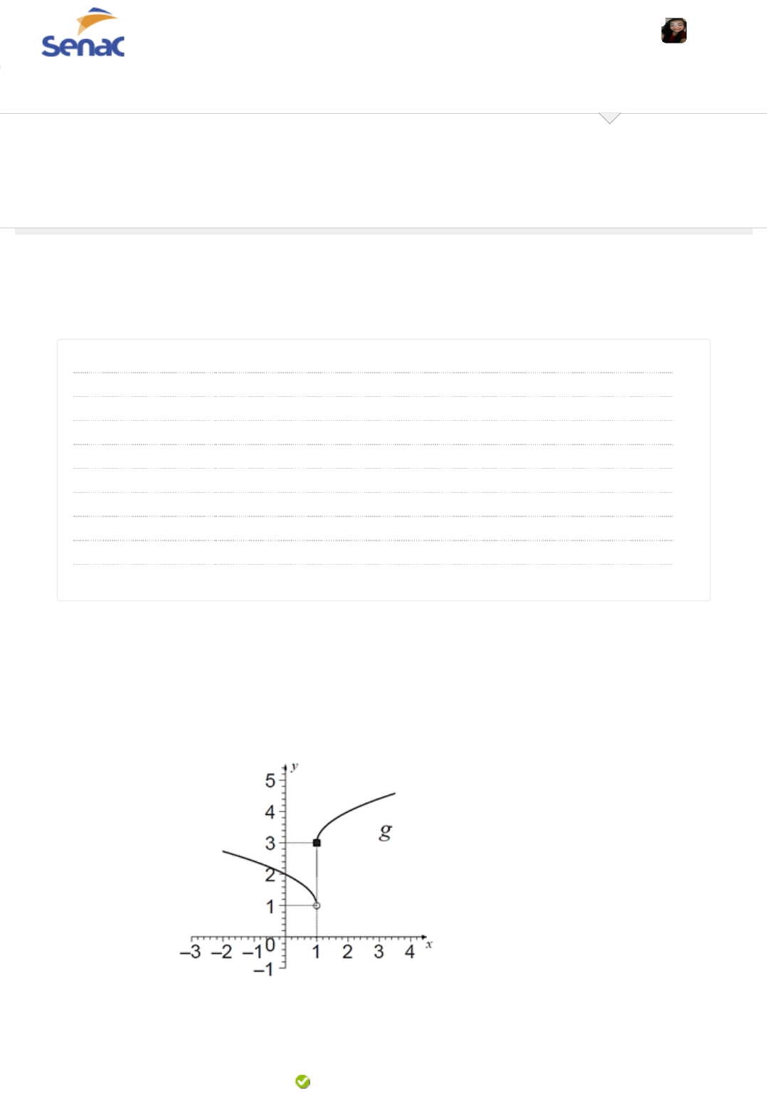 15/06/2024, 17:36 Revisar envio do teste: Clique aqui para iniciar o Quiz &ndash... https://senacsp.blackboard.com/webapps/assessment/review/review.jsp?attempt_id=_38317590_1&course_id=_241528_1&content_id=_109397… 1/9 Revisar envio do teste: Clique aqui para iniciar o Quiz EPRCAS1DA_2401-2401-701905 2401-CÁLCULO DIFERENCIAL E INTEGRAL I Quiz REVISAR ENVIO DO TESTE: CLIQUE AQUI PARA INICIAR O QUIZ Usuário JESSICA GOMES DOS SANTOS FERREIRA Curso 2401-CÁLCULO DIFERENCIAL E INTEGRAL I Teste Clique aqui para iniciar o Quiz Iniciado 15/06/24 16:54 Enviado 15/06/24 17:32 Data de vencimento 19/06/24 23:59 Status Completada Resultado da tentativa 9 em 10 pontos Tempo decorrido 37 minutos Resultados exibidos Todas as respostas, Respostas enviadas, Respostas corretas, Comentários Pergunta 1 Funções definidas por partes apresentam mais de uma expressão algébrica para representar a dependência da variável dentro do intervalo de domínio da função. Considere o gráfico da função g(x) apresentado abaixo: Analisando-se o gráfico da função g(x), podemos concluir que: Resposta Selecionada: b. lim x →1 + g (x ) = g ( 1) = 3 Sala de Aula Tutoriais 1 em 1 pontos JESSICA GOMES DOS SANTOS FERREIRA 1 https://senacsp.blackboard.com/webapps/blackboard/execute/courseMain?course_id=_241528_1 https://senacsp.blackboard.com/webapps/blackboard/content/listContent.jsp?course_id=_241528_1&content_id=_10939725_1&mode=reset https://www.ead.senac.br/ https://senacsp.blackboard.com/webapps/portal/execute/tabs/tabAction?tab_tab_group_id=_260_1 https://senacsp.blackboard.com/webapps/portal/execute/tabs/tabAction?tab_tab_group_id=_210_1 https://senacsp.blackboard.com/webapps/login/?action=logout 15/06/2024, 17:36 Revisar envio do teste: Clique aqui para iniciar o Quiz &ndash... https://senacsp.blackboard.com/webapps/assessment/review/review.jsp?attempt_id=_38317590_1&course_id=_241528_1&content_id=_109397… 2/9 Respostas: a. lim x →1 + g (x ) = g ( 1) = 1 b. lim x →1 + g (x ) = g ( 1) = 3 c. lim x →1 + g (x ) = 1, mas a função g não está definida para x= 1. d. lim x →1 + g (x ) = 3, mas a função g não está definida para x= 1. e. lim x →1 + g (x ) = 1 não existe. Comentário da resposta: Justificativa: A função g(1) não é contínua em x=1, pois os limites laterais são diferentes para este valor de x. A função é definida em x=1 e assume o valor 3, que é igual ao limite lateral desta função quando x se aproxima de 1 pela direita (valores de x maiores que 3). Pergunta 2 Limites e derivadas são ferramentas matemáticas importantes no estudo do comportamento de funções. Por exemplo, estimativas de valores de custo e lucro em empresas considerando-se longos períodos, para avaliar se haverá estabilização, crescimento ou decrescimento, ou a determinação de valores máximo e mínimos em intervalos específicos, podem ser realizadas com a adequada utilização de limites e derivadas. Com relação ao cálculo de limites e derivadas, considere as seguintes afirmações: I. O lim x →1 x 2− 1 x − 1 é igual a 1 II . Se f (x ) = x + x 2, então f ' (x ) = 1 2 x + 2x III. Se f (x ) = (cosx ) 2, então f ' (x ) = − 2( senx ) (cosx ) Está correto o que se afirma em: Resposta Selecionada: d. II e III, apenas. Respostas: a. I , apenas. b. II, apenas. c. III, apenas. 1 em 1 pontos 15/06/2024, 17:36 Revisar envio do teste: Clique aqui para iniciar o Quiz &ndash... https://senacsp.blackboard.com/webapps/assessment/review/review.jsp?attempt_id=_38317590_1&course_id=_241528_1&content_id=_109397… 3/9 d. II e III, apenas. e. I e III apenas. Comentário da resposta: Justificativa: Na afirmativa I, o limite da função racional existe e pode ser obtido dividindo o numerador e denominador por x-1, removendo-se a descontinuidade e calculando-se o limite por substituição direta, obtendo-se um valor diferente do apresentado, ou seja, esta afirmação não é verdadeira. Na afirmativa II, a função é constituída pela soma de duas funções potência, portanto a derivada da soma é igual a soma das derivadas. Na afirmativa III, temos uma função composta, logo a derivada desta função deve ser calculada utilizando-se a regra da cadeia, observando-se também que se f(x)=cos(x) temos que f’(x)= -sen(x). Pergunta 3 O termo depreciação é utilizado para denominar processos de desvalorização de bens e produtos. Por exemplo, carros tem seu preço reduzido quando modelos mais atuais e com mais recursos são lançados ou quando o carro já possui um determinado tempo de uso. Um analista de uma revendedora de carros usados estima que o valor de venda, em reais, de um determinado modelo de automóvel seja dado pela função p(x)=98000. ⎛ ⎜ ⎜ ⎜ ⎜ ⎜ ⎝ ⎞ ⎟ ⎟ ⎟ ⎟ ⎟ ⎠ 1 − x −2 2 (x −4) , onde x representa o tempo em anos de uso deste automóvel. Qual será o valor deste automóvel após quatro anos de uso? Resposta Selecionada: c. R$85.750,00 Respostas: a. R$12.250,00 b. R$94.500,00 c. R$85.750,00 d. R$59.500,00 e. R$77.000,00 Comentário da resposta: Considere uma função h(x)=k[1-m.f(x)], sendo k e m duas constantes reais e f(x) uma função em x. Então, pelas propriedades dos limites, temos: lim x →a h (x ) = lim x →a k[1 − m · f (x ) ]=k ⎡ ⎢ ⎢ ⎢ ⎢ ⎢ ⎢ ⎣ ⎤ ⎥ ⎥ ⎥ ⎥ ⎥ ⎥ ⎦ 1 − m · ⎛ ⎜ ⎜ ⎝ ⎞ ⎟ ⎟ ⎠ lim x →a f (x ) Para a função f(x) dada, que envolve termos com raiz quadrada e indeterminação do tipo 0/0, é possível multiplicar e dividir f(x) pelo conjugado do termo da raiz, removendo-se a indeterminação e permitindo-se o cálculo do limite. 1 em 1 pontos 15/06/2024, 17:36 Revisar envio do teste: Clique aqui para iniciar o Quiz &ndash... https://senacsp.blackboard.com/webapps/assessment/review/review.jsp?attempt_id=_38317590_1&course_id=_241528_1&content_id=_109397… 4/9 lim x →a x − a x − a = lim x →a x − a x − a · x + a x + a = lim x →a ( )x 2− ( )a 2 (x − a) ( )x + a = 