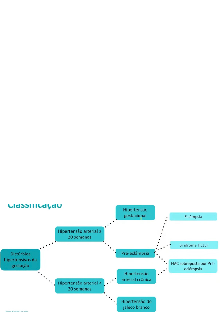 GO II Hipertensão e gravidez • Epidemiologia - Primeira causa de morte materna no Brasil e segunda causa no mundo - Afeta 10% das gestantes - Complicações maternas e fetais - Medidas preventivas e tratamento precoce: diminuem a morbimortalidade materno-fetal Complicações maternas - Insuficiência renal - Acidente vascular cerebral (principal causa de morte) - Insuficiência cardíaca - Edema agudo de pulmão - Coagulopatia - Insuficiência hepática Complicações fetais - Insuficiência placentária - Prematuridade eletiva - Restrição de crescimento fetal - Sofrimento fetal crônico e agudo • Classificação • Hipertensão gestacional e pré- eclâmpsia - Aumento dos níveis pressóricos ≥ 20 semanas e que desaparece 12 semanas pós-parto • Etiopatogenia da pré-eclâmpsia Teorias relacionadas à etiologia da pré- eclâmpsia: - Deficiência de invasão trofoblástica - Fatores imunológicos - Disfunção endotelial e alterações inflamatórias - Fatores nutricionais - Estresse Deficiência de invasão trofoblástica - Placentação normal: na primeira onda de invasão trofoblástica, a placenta atinge os vasos da decídua; na segunda onda de invasão trofoblástica, a placenta atinge a camada muscular média das arteríolas espiraladas do endométrio, isso faz com que diminua a resistência vascular e aumente o fluxo placentário - Placentação deficiente: artérias espiraladas não se modificam; camada muscular média com diâmetro menor e alta resistência; redução do fluxo sanguíneo do espaço interviloso; alteração da perfusão placentária, isso leva a uma lesão endotelial, que leva a vasoespasmo, aumento da permeabilidade capilar e ativação da coagulação/o Fatores Imunológicos - Excesso de carga antigênica fetal e ausência de antígenos bloqueadores - Isso pode levar a ativação da imunidade inata e das citocinas pró- inflamatórias - Pode ocorrer aumento dos fatores antiangiogênicos (fator solúvel tipo tirosina quinase-sFLt-1 e endoglina) - E também, diminuição dos fatores angiogênicos (fator de crescimento placentário – PIGF e fator de crescimento endotelial – VEGFs) Disfunção endotelial e alterações inflamatórias - Lesão endotelial: diminui prostaglandinas vasodilatadoras (prostaciclinas – PGl2) - Ativação da coagulação: aumenta prostaglandinas vasoconstritoras (tromboxano – TXA2) - Com esses dois fatores, ocorre um aumento da relação TXA2/PGl2, que aumenta sensibilidade de infusão da angiotensina II e de endotelinas, levando a vasoconstrição Fatores genéticos e ambientais - Filhas de mãe com pré-eclâmpsia 20- 40% de chance - Baixa ingestão de cálcio - Doenças prévias associadas (obesidade, diabetes, doença renal e cardiovascular) - Estresse • Fisiopatologia da pré-eclâmpsia - Lesão endotelial > aumento da permeabilidade vascular > extravasamento do plasma materno para o meio extravascular > edema, hemoconcentração e proteinúria > aumento da viscosidade sanguínea > trombose e isquemia de órgãos • Predição da pré-eclâmpsia - Fatores de risco maternos: 1 fatores de risco alto OU 2 fatores de risco moderado - Marcadores bioquímicos (PLGF e PAPP- A): quanto menor a concentração, maior o risco de pré-eclâmpsia - Biofísicos (artéria uterina): quanto maior for o IP da artéria uterina, maior o risco de pré-eclâmpsia - Concentração de PLGF e PPAP-A + IP da artéria uterina + parâmetros maternos: no primeiro trimestre – identifica 93% das pacientes que desenvolverão pré- eclâmpsia precoce, mas com 79% de falso positivo • Prevenção da pré-eclâmpsia Todas as gestantes: - Exercícios físicos 140min/semana - Suplementação de pelo menos 500mg cálcio/dia se baixa ingesta (<600mg/dia) Gestante de alto risco para PE (1 fator de risco alto ou 2 fatores de risco moderado ou rastreamento combinado positivo): - Suspender AAS se diagnóstico de PE - Aspirina baixa dose à noite (100- 150mg) – início a partir de 12 semanas (preferencial antes de 16/20 semanas) até 36 semanas - Suplementação de cálcio (1,5 a 2g/dia com as refeições) – gestante com baixa ingesta dietética de cálcio (1˚ trim até o fim da gestação) Não reduz risco de PE: - Repouso - Restrição de sal na dieta - Vitamina C - Vitamina E - Vitamina D - Omega-3 - Ácido fólico - Enoxaparina • Diagnóstico - Aumento PA ≥ 20 semanas - Suspeitar de PE ou hipertensão gestacional - Avaliar presença de sinais/sintomas de gravidade - Diagnóstico de forma clínica da PE Hipertensão arterial na gestação - PAS ≥ 140 ou PAD ≥ 90 em duas ocasiões, com intervalo de 4 horas OU - PAS ≥ 160 ou PAD ≥110 confirmada após 15 minutos Proteinúria Proteinúria de 24h ≥ 300mg OU Relação proteína/creatinina urinária ≥ 0,3 OU Relação albumina/creatinina ≥ 8mg/mmol OU Amostra isolada de urina ≥ +1 ou 30mg/dL de proteína Exames para investigação de PE - Proteinúria 24h ou relação proteína/creatinina - Creatinina - Hemograma completo - DHL ou haptoglobina - Transaminases - Bilirrubinas - Dopplervelocimetria obstétrica Sintomas que indicam gravidade - Cefaleia - Epigastralgia - Dor em hipocôndrio direito - Oligúria - Alterações visuais - Alteração do estado mental - Convulsões • Diagnóstico de Hipertensão Gestacional - Hipertensão arterial (≥140/90mmHg) ≥ 20 semanas, que normaliza após o puerpério E - Ausência de proteinúria E - Ausência de disfunção de órgãos-alvo Classificação - Hipertensão gestacional leve: PA maior que 140/90 e menor que 160/110 mmHg - Hipertensão gestacional grave: PA ≥ 160/110 mmHg • Diagnóstico de Pré-Eclâmpsia - Hipertensão arterial (≥ 140/90 mmHg) ≥ 20 semanas E - Proteinúria OU - Lesão de órgãos-alvo materno OU - Disfunção uteroplacentária Quadro clínico clássico - Hipertensão arterial - Edema - Proteinúria Classificação - Pré-eclâmpsia com sinais de gravidade: hipertensão arterial grave (PAS ≥ 160 e PAD ≥ 