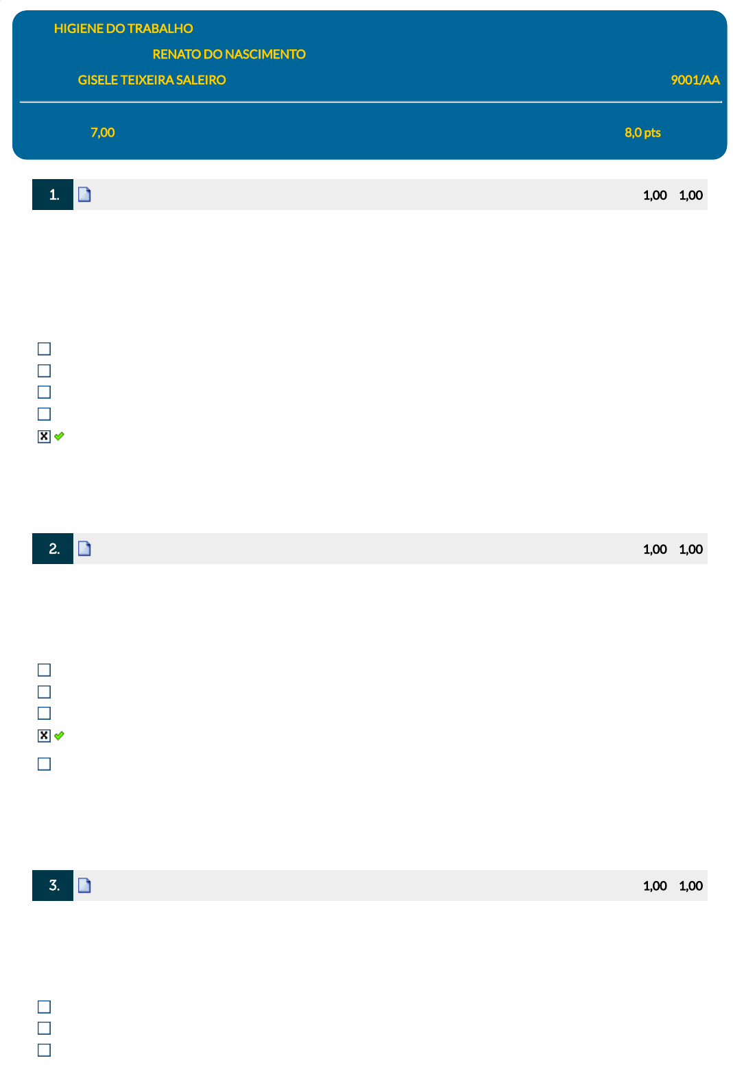 Disc.: HIGIENE DO TRABALHO Aluno: 202204407477 - RENATO DO NASCIMENTO Professor: GISELE TEIXEIRA SALEIRO Turma: 9001/AA Avaliação: 7,00 Nota Trab.: Nota Partic.: Nota SIA: 8,0 pts 1. Ref.: 7658249 Pontos: 1,00 / 1,00 As pressões anormais que apresentam níveis de pressão atmosférica abaixo do padrão (1 ATM) são classi�cadas como hipobáricas (trabalhos realizados a grande altitude) e as que apresentam níveis de pressão atmosférica acima do padrão (1 ATM), são classi�cadas como hiperbáricas (trabalhos realizados sob ar comprimido ou submersos). Vários são os efeitos da pressão positiva (mergulho, tubulão pneumático e recompressão terapêutica), tanto na fase de compressão como na fase de descompressão. Assinale a alternativa que lista, exclusivamente, os efeitos relacionados à fase de descompressão: Lesões cerebrais e intoxicação por gás carbônico Intoxicação aguda por oxigênio e lesões cerebrais Dores articulares e intoxicação aguda por oxigênio Dores articulares e intoxicação por gás carbônico Lesões cerebrais e dores articulares Respondido em 18/04/2024 19:52:02 2. Ref.: 7658286 Pontos: 1,00 / 1,00 A exposição ao infravermelho resulta de várias fontes naturais e arti�ciais. A emissão espectral dessas fontes pode ser limitada a um único comprimento de onda (no caso do laser) ou pode ser distribuída em uma ampla banda de comprimentos de onda. Como sabemos, são várias as medidas de controle adotadas, dependendo da situação. Assinale a a�rmativa que apresenta uma medida de controle do risco pertinente à radiação infravermelho. Fechamento parcial da fonte e de algumas vias de radiação. Controle administrativo e a liberação de acesso a qualquer fonte. Controle administrativo e a restrição de acesso a qualquer fonte. Usar proteção ocular disponível na forma de óculos ou visores adequados ou roupas de proteção. Eliminação da energia da fonte ou redução do tempo de trabalho (pausa no trabalho para se recuperar do estresse por calor), ou ambos, pode ser uma medida possível para proteger o trabalhador. Respondido em 18/04/2024 19:55:44 3. Ref.: 7658633 Pontos: 1,00 / 1,00 O ruído afeta o organismo de muitas maneiras, causando prejuízos não apenas ao funcionamento do sistema auditivo; também compromete as atividades física, �siológica e mental do indivíduo a ele exposto. Para um melhor entendimento a classi�cação dos efeitos nocivos do ruído são caracterizados em termos auditivos e não auditivos. Assinale a a�rmativa que apresenta um efeito nocivo ao sistema auditivo. Transtorno Digestivo. Transtorno Neurológico. Transtornos Comportamentais. javascript:alert('C%C3%B3digo da quest%C3%A3o: 7658249.'); javascript:alert('C%C3%B3digo da quest%C3%A3o: 7658249.'); javascript:alert('C%C3%B3digo da quest%C3%A3o: 7658286.'); javascript:alert('C%C3%B3digo da quest%C3%A3o: 7658286.'); javascript:alert('C%C3%B3digo da quest%C3%A3o: 7658633.'); javascript:alert('C%C3%B3digo da quest%C3%A3o: 7658633.'); Perda do Sono. Fadiga Auditiva. Respondido em 18/04/2024 20:17:44 4. Ref.: 7658553 Pontos: 1,00 / 1,00 Assinale a a�rmativa correta. As medidas corretivas visam a reduzir os níveis de exposição às vibrações, devendo ser adotadas, tendo por base, as recomendações estabelecidas no critério de julgamento e tomada de decisão. Entre as diversas medidas corretivas podemos citar: Redução do tempo de exposição diária. Troca de componentes gastos ou defeituosos, somente em último caso. Evitar por completo a troca de componentes novos. Manutenção do processo ou da operação de trabalho. Manutenção eventual das ferramentas. Respondido em 18/04/2024 20:16:35 5. Ref.: 7658986 Pontos: 1,00 / 1,00 Dentre os efeitos à saúde relacionados à umidade, podemos indicar: Afecções do trato respiratório Conjuntivite Enregelamento dos membros Necroses Doenças reumáticas Respondido em 18/04/2024 19:58:14 6. Ref.: 7658538 Pontos: 1,00 / 1,00 A peça facial �ltrante ou PFF é um respirador cujo �ltro é própria peça facial. Existem limitações de uso para todos os modelos de PFF. Assinale a a�rmativa que apresenta corretamente uma dessas limitações de uso. Quando a concentração do contaminante for inferior ao valor imediatamente perigosos à vida e à saúde - IPVS. Em atmosferas com concentração (em volume) de oxigênio abaixo de 16%, em ambientes fechados e sem ventilação, ou onde a concentração de oxigênio pode ser menor que 19,5% em volume, ou acima de 24%. Em atmosferas com concentração (em volume) de oxigênio abaixo de 18%, em ambientes fechados e sem ventilação, ou onde, a concentração de oxigênio pode ser menor que 19,5% em volume, ou acima de 23%. Exclusivamente para proteção contra gases e/ou vapores e pintura com aplicação por spray com tinta à base de solvente. Em atmosferas não explosivas Respondido em 18/04/2024 19:59:04 7. Ref.: 7659142 Pontos: 1,00 / 1,00 javascript:alert('C%C3%B3digo da quest%C3%A3o: 7658553.'); javascript:alert('C%C3%B3digo da quest%C3%A3o: 7658553.'); javascript:alert('C%C3%B3digo da quest%C3%A3o: 7658986.'); javascript:alert('C%C3%B3digo da quest%C3%A3o: 7658986.'); javascript:alert('C%C3%B3digo da quest%C3%A3o: 7658538.'); javascript:alert('C%C3%B3digo da quest%C3%A3o: 7658538.'); javascript:alert('C%C3%B3digo da quest%C3%A3o: 7659142.'); javascript:alert('C%C3%B3digo da quest%C3%A3o: 7659142.'); Sobre os respiradores com �ltros químicos, aponte a opção correta sobre a recomendação do tempo exato de substituição desses �ltros: Reutilizar os respiradores de fuga por mais de duas vezes após o primeiro uso. Minutos ou meses em função de concentração, número de agentes presentes, umidade, nível de esforço e qualidade do carvão Reutilizar os respiradores de fuga por mais de uma vez após o primeiro uso. Seis meses após a abertura da embalagem original com uso de algumas semanas. Seis meses após a abertura da embalagem original c