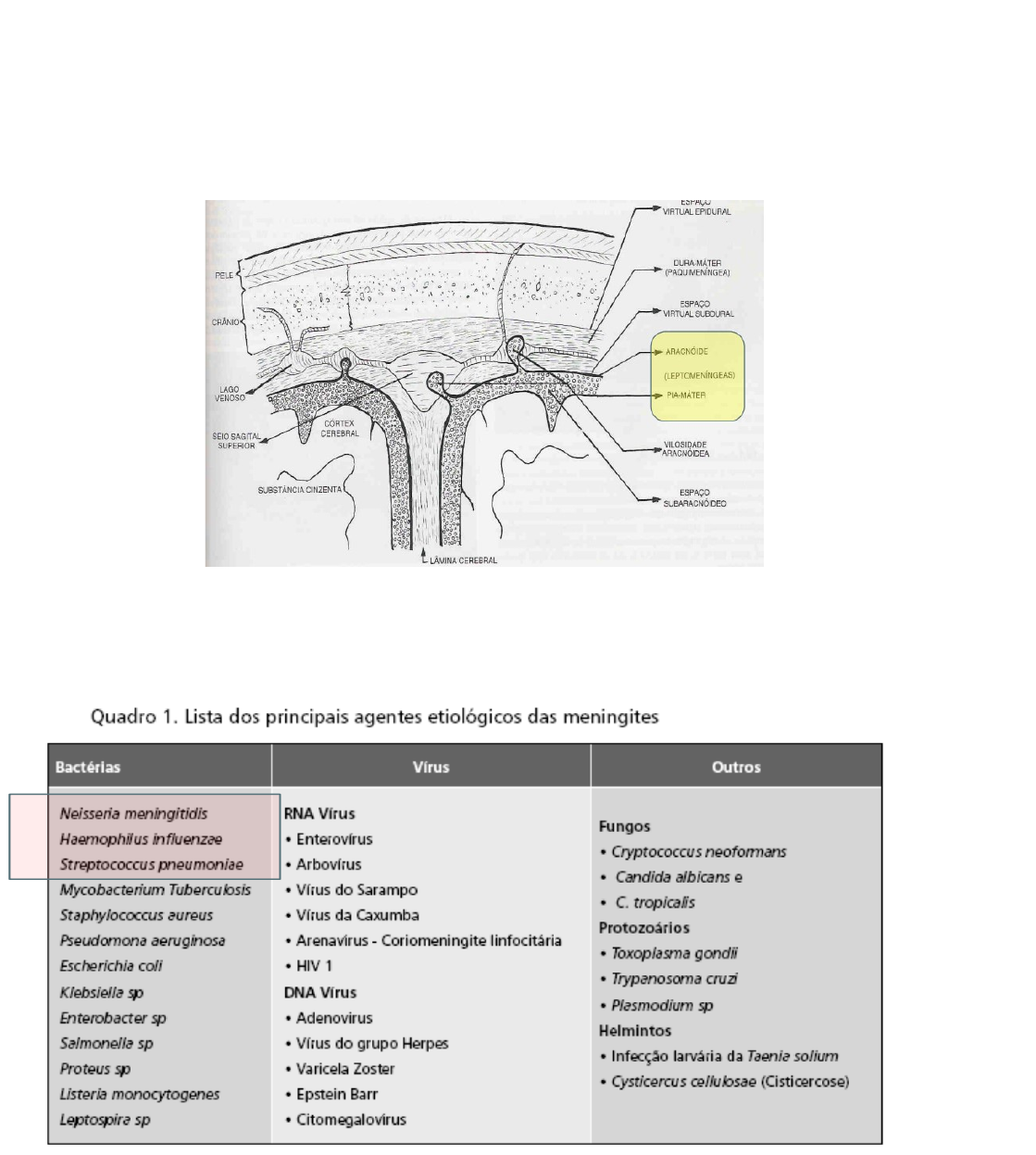 MENINGITES: Processo inflamatório das membranas leptomeníngeas que envolvem o encéfalo e a medula espinhal com aumento da contagem de células brancas no líquor Inflamação: espaço subaracnóide+ membranas leptomeníngeas (pia-aracnóide) → reação purulenta + leucocitose (proteínas) detectados no líquor ETIOLOGIAS: ➔ NEISSERIA MENINGITIDIS ➔ HAEMOPHILUS INFLUENZAE ➔ STREPTOCCUS PNEUMINIAE FISIOPATOLOGIA: A infecção pode atingir a leptomeninge por 3 mecanismos básicos: 1) Via hematogênica: primária ou secundária ao foco de infecção à distância (infecção de pele (acne), pulmão, coração, trato intestinal e geniturinário) 2) Infecção adjacente às meninges: faringite, sinusite, otite média. 3) Solução de continuidade: traumatismo craniano, infecção dos ossos, vasos sanguíneos Fatores de virulência: Pneumococo, Hemofilus e menigococo: proteases (clivam IgA – que faz a opsorização do patógeno) e cápsula OBS: no SNC, a imunidade humoral é deficiente Gabriela Helena Stahlhofer 1. Evento Inicial: colonização das vias aéreas superiores por germes patogênicos. 2. Virulência do microorganismo e fatores de defesa do hospedeiro pode ocorrer invasão do epitélio pelo agente e disseminação pela corrente sanguínea. 3. No líquor a proliferação bacteriana é favorecida devido à quase ausência de imunoglobulinas e do sistema complemento 4. A lise bacteriana e a posterior liberação de elementos da parede celular induzem inflamação intensa das meninges devido produção de citocinas (TNF-α e IL-1). 5. Citocinas levam a um aumento da permeabilidade capilar → edema cerebral do tipo vasogênico. Permite o extravasamento de proteínas e leucócitos para o líquor 6. Exsudato → bloquear a reabsorção liquórica hidrocefalia e edema cerebral (intersticial) → Há acometimento de vasos cerebrais áreas isquêmicas do parênquima cerebral → edema citotóxico. 7. Pode haver acometimento de vasos sanguíneos por contiguidade podendo ocasionar trombose ou abscessos. MENINGITE VIRAL X BACTERIANA Dificuldade em não conseguir estabelecer o diagnóstico etiológico de meningite muitas vezes é decorrente da utilização prévia de antibiótico → Esterilização do líquor pode ocorrer rapidamente após o início parenteral de antibióticos, com completa esterilização do meningococo em 2 horas e do pneumococo em 4 horas LCR NORMAL Celularidade 0 – 4 Polimorfonucleares 0 Linfomononucleares 100% Proteínas 40 Glicose >40 (2/3 da glicemia) Bacterioscopia Negativa Cultura Negativa MENINGITE VIRAL: Maior causa de meningite asséptica evidencia clínica + laboratorial de inflamação meníngea – pleocitose (celularidade) linfomonocitária e com culturas NEGATIVAS. Causa mais comum = ENTEROVÍRUS (80%) Enterovirus: echovírus, poliovírus, coxsakie Herpes simples 1 e 2: varicela-zoster, EBV, Adenovirus, caxumba, HIV Clinica: Geralmente é súbito Febre (76% a 100%) Rigidez de nuca Cefaléia Fotofobia também é comum em pacientes mais velhos. Sintomas inespecíficos e sinais incluem vômitos, anorexia, erupção cutânea, diarréia, tosse, quadro respiratório superior (especialmente faringite), e mialgias. Outros: Exantemas - Miopericardite – Conjuntivite DIAGNÓSTICO LIQUOR Pleocitose do LCR é quase sempre presentes. A contagem de células é normalmente de 100 a 500/mm³ Os neutrófilos podem dominar o perfil de LCR, embora essa situação rapidamente dá lugar a uma predominância linfocitária durante as primeiras 6 a 48 horas Testes de amplificação de ácidos nucleicos - PCR RT-PCR tem sido testado na prática clínica por diversos pesquisadores e descobriu-se mais sensível que a cultura para a detecção de enterovírus, a sensibilidade variou de 86% a 100% e especificidade de 92% para 100 % TRATAMENTO: Normalmente de suporte. Reposição hidroeletrolítica Controle das convulsões (quando presente). Meningite herpética: Aciclovir EV Isolamento Respiratório em caso de meningite por caxumba MENINGITE TUBERCULOSA O complexo Mycobacterium tuberculosis é constituído de várias espécies: M. Tuberculosis M. bovis M. africanum. Considerações: Pacientes apresentam um outro local de infecção. 25% dos casos podem não ter evidência de infecção. Em mais de 50% dos casos está associada a tuberculose miliar. Áreas de alta prevalência: comum em crianças de 0-4 anos . (vacina BCG previne) Áreas de menor frequência – acomete mais os adultos. QUADRO: Se apresenta com um início gradual durantes algumas semanas Inicialmente mal-estar, apatia e anorexia, evoluindo, em algumas semanas, para fotofobia, rigidez de nuca e comprometimento da consciência. É uma das complicações mais graves da tuberculose. Quadro clínico é, comumente, de início insidioso – embora alguns casos possam ter um início abrupto, marcado pelo surgimento de convulsões – e dividido em três estágios. 1º: de 1 a 2 semanas, com sintomas inespecíficos tais como: febre, mialgias, sonolência, apatia, irritabilidade, cefaléia, anorexia, vômitos, dor abdominal e mudanças súbitas do humor 2º: persistem os sintomas sistêmicos e surgem sinais de lesão de nervos cranianos, exteriorizando-se por paresias e plegias, estrabismo, ptose palpebral, irritação meníngea e hipertensão intracraniana. Podem surgir sinais de encefalite, com tremores periféricos, distúrbios da fala, trejeitos e movimentos atetóides das extremidades. 3º: déficit neurológico focal, opistótono, rigidez de nuca, alterações do ritmo cardíaco e da respiração e graus variados de perturbação da consciência, incluindo o coma DIAGNÓSTICO: Na suspeita, está indicada a radiografia de tórax (imagem sugestiva de TB em metade dos casos). O exame de neuroimagem (TC ou ressonância magnética) com contraste deve ser o primeiro exame a ser realizado. Os três achados de imagem mais comuns são: hidrocefalia, espessamento meníngeo basal e infartos do parênquima cerebral. A punç