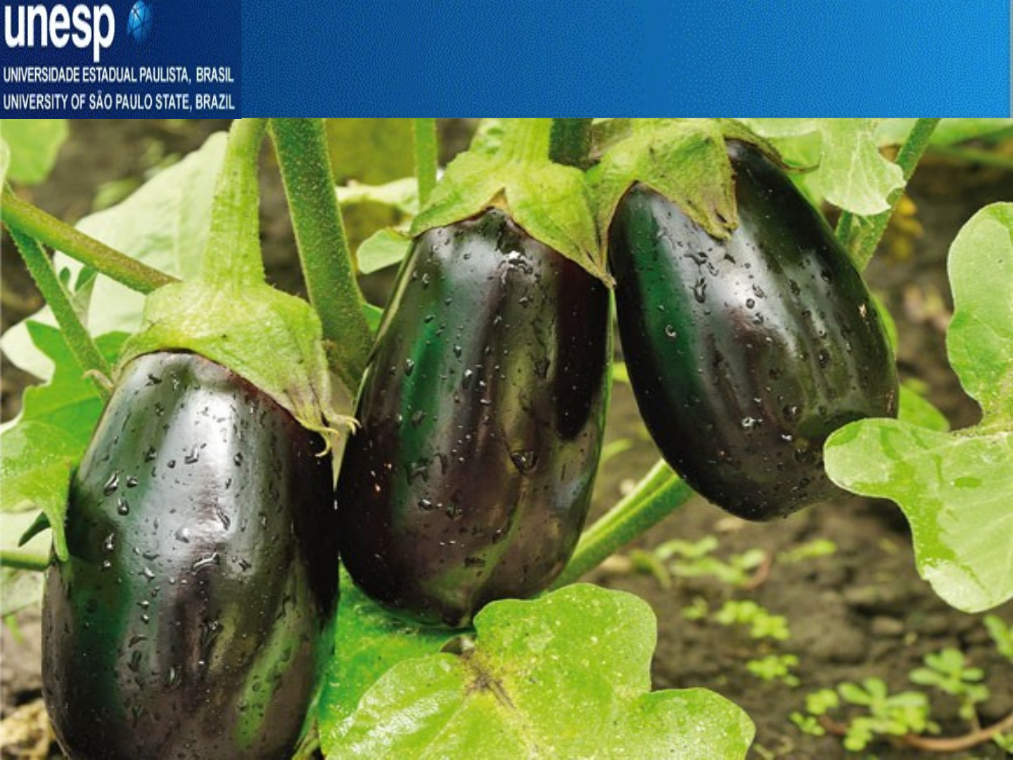 Manejo de Pragas da Berinjela Discentes: Adriano Francis Dorigan DEFERS Universidade Estadual Paulista Campus de Ilha Solteira, Ilha Solteira, SP, Brasil Docente: Prof. Dr. Alcebíades Ribeiro Campos Cultura da Berinjela - Introdução Classificação Botânica: Família – Solanaceae Genêro – Solanum Espécie – Solanum melongena L. Clima: Tropical e Subtropical T média diurna: 25-350C T média noturna: 20-270C Centro de Origem: Regiões tropicais do Oriente Índia, Birmânia e China A berinjela, botanicamente classificada como Solanum melongena L., pertence à família Solanaceae, assim como o tomate, pimenta, pimentão, batata e jiló. Foi introduzida à dieta brasileira por emigrantes árabes (portugueses colonização), sendo consumida principalmente nos estados de São Paulo, Rio de Janeiro e Paraná. 2 Cultura da Berinjela - Introdução Maiores Produtores: São Paulo, seguido de Minas Gerais e da região Sul. Produção/Produtividade: 15Kg de frutos por planta e atingir a 100t/há. Estabelecimentos Produção (t) Valor da Produção R$ Brasil 78217 77682 48125 Norte 334 485 394 Nordeste 1434 3292 7674 Sudeste 3792 61969 32657 Sul 1564 9277 5002 Centro-Oeste 809 3195 2417 Fonte: IBGE, Censo Agropecuário 2006. Maiores Produtores: Cultivada em maior escala nos estados de São Paulo, seguido de Minas Gerais e da região Sul do país. 3 A cultura é relativamente resistente a Pragas. Presença de inimigos naturais. Piretróides apenas no final do ciclo, devido a hormoligose. Cultura da Berinjela - Introdução Benefícios para a Saúde: Tratamento de asma Diabetes Cólera Bronquite Controle colesterol no sangue Boa fonte de sais minerais, vitaminas e o valor nutricional comparado ao tomate. Cultura da Berinjela - Introdução Ácaros Ácaro Rajado (Tetranychus urticae) Ácaro Vermelho (Tetranychus evansi) Ácaro Vermelho (Tetranychus ludeni) Ácaro branco (Polyphagotarsonemus latus) Ácaro do bronzeamento (Aculops lycopersici) Lagartas Lagarta rosca (Agrotis ípsilon) Broca pequena (Neoleucinodes elegantalis) Broca grande (Helicoverpa zea) Lagarta-das-solanáceas (Mechanitis lysimnia) Mosca Branca Mosca Branca (Bemisia tabaci e Bemisia argentifolii) Pragas Principais da Berinjela Pragas da Berinjela: Ácaros Principais pragas da berinjela !!! A B C D Bioecologia: Ciclo: 10 à 14 dias Comprimento: 0,25 a 0,75 mm Condições favoráveis: Alta (T) e baixa (UR) Localização/oviposição: Parte inferior da folha. Pragas da Berinjela: Ácaros Principal praga Os ácaros principais pragas são as da berinjela. Em geral, altas populações estão associadas a altas temperaturas, baixa umidade relativa do ar e uso exagerado de inseticidas, que eliminam os seus inimigos naturais Por serem disseminados principalmente pelo vento, é muito importante a destruição dos restos culturais 8 Redução da área foliar e fotossíntese Causam necrose Queda das folhas e morte da planta Os frutos tornam-se pequenos e ondulados, e a casca apresenta áreas ásperas e claras. Pragas da Berinjela: Ácaros Sintomas gerais do ataque de ácaros Família Tetranychidae Ácaro Rajado (Tetranychus urticae) Ácaro Vermelho (Tetranychus evansi) Ácaro Vermelho (Tetranychus ludeni) Pragas da Berinjela: Ácaros Acaro vermelho: Tetranychus evansi, Tetranychus ludeni: Apresenta uma coloração vermelha muito intensa e Encontrados na face inferior das folhas. Ácaro Rajado : Tetranychus urticae: Apresenta duas manchas pretas em seu dorso e pode apresentar coloração branca, verde, alaranjada e vermelha e sua Localização: face inferior das folhas . 10 Aparecimento de teias envolvendo as folhas. Clorose generalizada nas folhas, elevada queda de folhas e morte de plantas. Ácaros: Família Tetranychidae Injúrias No início do ataque, produzem manchas cloróticas nas folhas do terço inferior da planta. Altas populações, que normalmente ocorrem no final do ciclo da planta, resultam na formação de teias nas folhas superiores da planta. 11 Ácaros: Família Tetranychidae Família Tarsonemidae Ácaro branco (Polyphagotarsonemus latus) Pragas da Berinjela: Ácaros Polyphagotarsonemus latus . Localização: parte apical das plantas, nos brotos terminais. Os adultos apresentam forma cilíndrica e cor branca ou amarelada. Danos: As folhas ficam coriáceas e com bordos recurvados ventralmente.Folhas de coloração bronzeada. 13 Enrolamento das bordas das folhas do ponteiro. Folhas espessas, coriáceas e quebradiças ao toque. Família Tarsonemidae Injúrias Produz enrolamento das bordas das folhas do ponteiro ou do terço superior das plantas. A sua atividade interfere na expansão foliar, tornando as folhas espessas, coriáceas e quebradiças ao toque. 14 Família Eriofiidae Ácaro do bronzeamento (Aculops lycopersici) Pragas da Berinjela: Ácaros A berinjela é o seu melhor hospedeiro. Coloniza a base da haste principal e as folhas do terço inferior, bronzeamento das folhas. Inflorescência: Injúrias nos cálices das flores e deformação dos frutos ainda em formação. Injúrias Família Eriofiidae Produz enrolamento das bordas das folhas do ponteiro ou do terço superior das plantas. A sua atividade interfere na expansão foliar, tornando as folhas espessas, coriáceas e quebradiças ao toque. Os principais são quando o ataque ocorre na inflorescências, tais como: danos nos cálices das flores e deformação dos frutos ainda em formação e nos formados; lesões irreversíveis que aumentam com o desenvolvimento do fruto. 16 Polo 500 SC a base de diafentiurom (feniltiouréia) na dose de 800 mL/ha. Sulficamp a base de enxofre (inorgânico) na dose de 400 g/100 L. Abamectin Nortox a base de abamectina na dose de 50-100 mL/100L. Vertimec a base de abamectina na dose de 50-100 ml/100L. Tedion a base de tetradifona na dose de 300 ml/100L. Grimectin a base de abamectina na dose de 50-90 mL/100L. Pragas da Berinjela: Ácaros Inseticidas indicados para controle Todas os ácaros citados acima tem a maior concentração de 