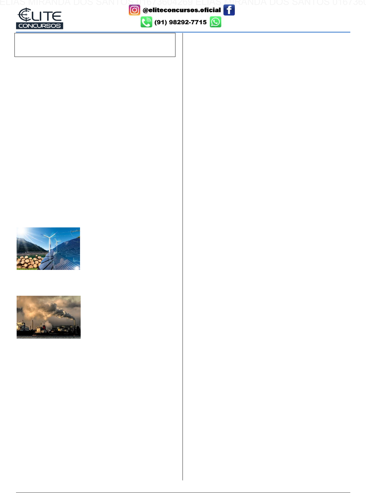 1 Elite Concursos Sua mudança de vida começa AQUI !!! PM/PA SOLDADO Soldado PM/PA Atualidades Data: 29/08/2023 Prof.: José Luiz Aula 01 USINAS DE BELO MONTE E TUCURUÍ Fontes de Energia Desde o início da civilização o homem sempre buscou formas de obter energia como forma de garantir conforto e o desenvolvimento das atividades econômicas. Com o decorrer da história da humanidade ficou evidente que a energia muscular utilizada pelos homens possuía uma capacidade limitada e, com isso, era necessário buscar outras fontes de energia. Uma das primeiras fontes de energia foi a lenha que era utilizada para proteção, fornecer calor, além de cozinhar os alimentos. Com o decorrer do progresso da civilização as fontes de energia foram se modernizando até terem sido utilizadas nas Revoluções Industriais quando passaram a ter uma grande capacidade de alterar o meio ambiente. Nesse sentido, as fontes de energia atuais são classificadas em duas grandes categorias: as renováveis e as não renováveis. A) Renováveis: são aquelas que utilizam recursos cujo ciclo de renovação possui um curto período de tempo. Isso quer dizer que, no tempo de vida de um ser humano, esses recursos podem ser repostos na natureza. Ex.: álcool, biodiesel e as usinas hidrelétricas. b) Não renováveis: são aquelas que se baseiam em recursos que têm seu ciclo de reposição na natureza muito longo- geralmente milhões de anos- se comparado ao tempo de vida humano. Esse é o caso dos combustíveis fósseis. Ex.: petróleo, gás natural e o carvão. Este material irá abarcar o uso da fonte de energia renovável da usina hidrelétrica especificamente o caso da U.H. de Belo Monte localizada no Rio Xingu próxima ao município de Altamira. Por que utilizar a energia hidroelétrica? Como ela funciona? As usinas hidrelétricas são fontes de energias renováveis, ou seja, elas podem ser respostas na natureza no tempo de vida humana, além da energia elétrica gerada por ela ser considerada limpa. Ademais, as usinas hidrelétricas não lançam para atmosfera gases nocivos para atmosfera. As águas utilizadas para girarem as turbinas de uma usina podem ser novamente aproveitadas em outras atividades como: irrigação, consumo humano, atividades industriais. Isso acontece porque não aconteceu nenhum tipo de poluição na água, em síntese, a qualidade continua a mesmo antes de entrar em uma usina. Nessas usinas, a água do rio é represada por meio de uma barragem de concreto, para então cair de uma grande altura sobre imensas turbinas que, ao girar, produzem energia elétrica. Dessa maneira, não é qualquer rio que possui capacidade para comportar uma usina hidrelétrica, visto que ele precisa ser de planalto, em virtude das grandes quedas d’água. Além disso, existe um modelo de usina hidrelétrica a qual não precisava inundar uma grande área a chamada: usina hidrelétrica a fio d’água, sendo assim, não precisa manter um grande estoque de água acumulado na barragem. Essa tecnologia foi utilizada para a construção da Usina Hidrelétrica de Belo Monte. No entanto, é importante salientar que mesmo as usinas a fio d’água podem utilizar reservatórios de água como é o caso da casa de força principal da U.H. de Belo Monte a qual foi responsável por inundar uma área de cerca de 500 km². No setor elétrico brasileiro, a principal fonte utilizada é a energia hidráulica, correspondendo a 65,2% da matriz elétrica, conforme o Balanço Energético Nacional realizado em 2018. O POTENCIAL HIDRELÉTRICO BRASILEIRO O Brasil possui uma grande capacidade de geração de energia hidroelétrica, em virtude de que grande parte dos seus rios são planálticos, além de caudalosos. As regiões sul e sudeste do país possuem uma grande concentração de usinas hidrelétricas, portanto, muitos rios estão “saturados”, conforme é exemplificado na figura 1, e não conseguem comportar mais usinas. Nessa perspectiva, o Governo Federal voltou seus olhos para Amazônia, uma vez que o país possui uma grande capacidade de transmissão de energia, em síntese, uma usina na Amazônia teria a capacidade abastecer as outras regiões do país. VANTAGENS E DESVANTAGENS DA ENERGIA HIDRELÉTRICA: a) Vantagens: • Utiliza a água como fonte de energia renovável a curto prazo. • Não emite poluentes para a atmosfera porque dispensa a combustão de combustíveis como nas termelétricas. • Tem um baixo custo de manutenção, pois necessita apenas da água dos rios. b) Desvantagens: • Alto custo de instalação porque necessita a aquisição de equipamentos sofisticados e a utilização de grandes áreas para a formação do lago de barragem. • Não pode ser implantada em qualquer lugar, pois exige condições naturais favoráveis. • Provoca grandes impactos socioambientais na área de influência. Figura 1: Usinas hidrelétricas no Brasil, em 2009. ELIAS MIRANDA DOS SANTOS 01673604269 ELIAS MIRANDA DOS SANTOS 01673604269 ELIAS MIRANDA DOS SANTOS 01673604269 ELIAS MIRANDA DOS SANTOS 01673604269 ELIAS MIRANDA DOS SANTOS 01673604269 ELIAS MIRANDA DOS SANTOS 01673604269 ELIAS MIRANDA DOS SANTOS 01673604269 ELIAS MIRANDA DOS SANTOS 01673604269 ELIAS MIRANDA DOS SANTOS 01673604269 ELIAS MIRANDA DOS SANTOS 01673604269 Windows 10 Realce Windows 10 Realce Windows 10 Realce Windows 10 Realce sao poluentes Windows 10 Realce Windows 10 Realce Windows 10 Realce Windows 10 Realce Windows 10 Realce Windows 10 Realce Windows 10 Realce Windows 10 Realce Windows 10 Realce Windows 10 Realce Windows 10 Realce 2 Elite Concursos Sua mudança de vida começa AQUI !!! PM/PA SOLDADO Fonte: ANA 2009. USINA HIDRELÉTRICA DE BELO MONTE Características gerais: A U.H. de Belo fica localizada no Rio Xingu, próxima ao município de Altamira, sendo assim, quando tratarmos das vantagens e desvantagens da construção dessa usina estaremos falando dos seus impactos sobre o município de Altamira que é o mais próximo do projeto. A usina f