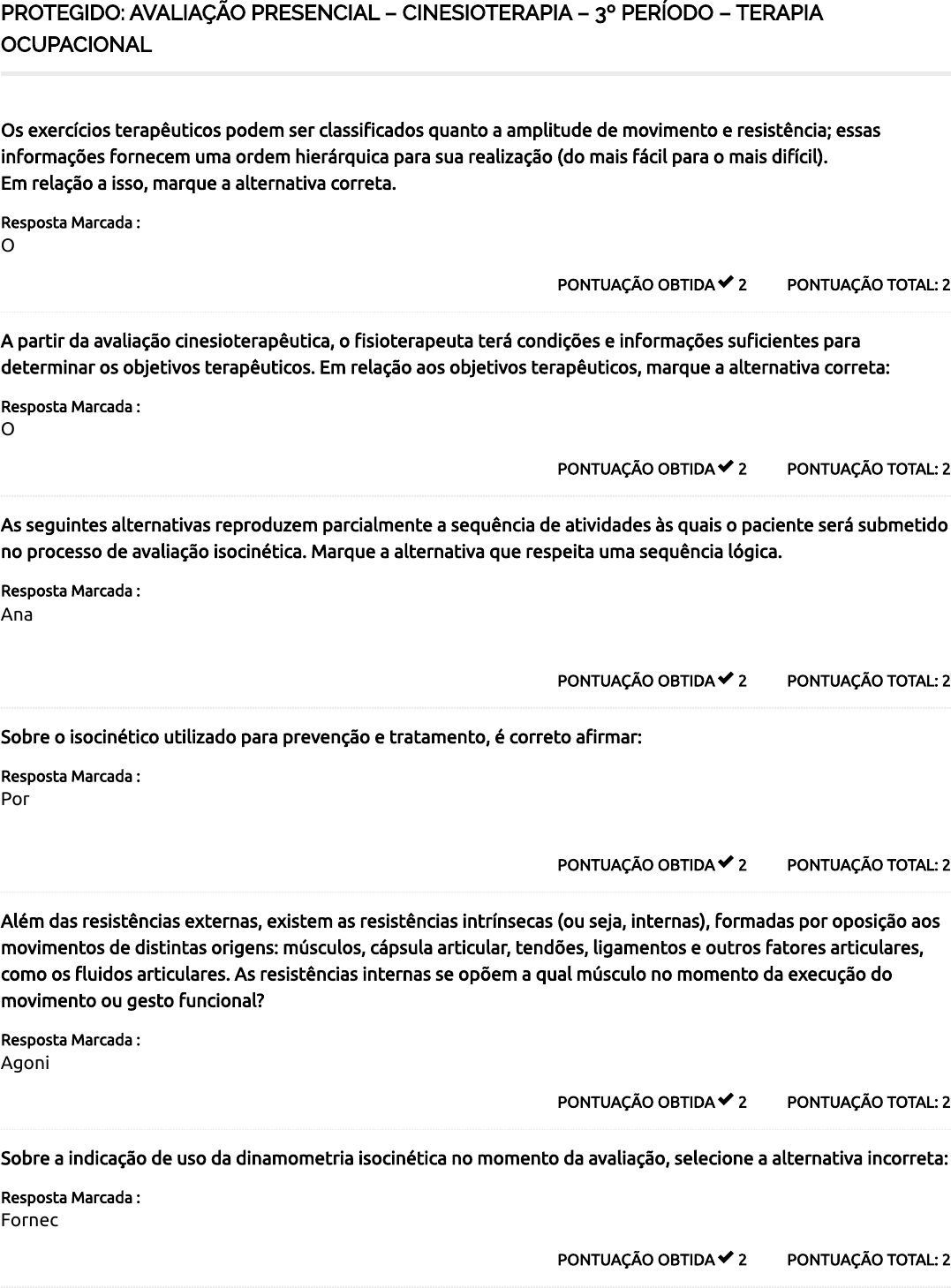 PROTEGIDO: AVALIAÇÃO PRESENCIAL – CINESIOTERAPIA – 3º PERÍODO – TERAPIA OCUPACIONAL PONTUAÇÃO TOTAL: 2PONTUAÇÃO OBTIDA 2 Os exercícios terapêuticos podem ser classi�cados quanto a amplitude de movimento e resistência; essas informações fornecem uma ordem hierárquica para sua realização (do mais fácil para o mais difícil). Em relação a isso, marque a alternativa correta. Resposta Marcada : Os exercícios resistidos podem ser, em ordem, por contração isométrica, concêntrica e excêntrica. PONTUAÇÃO TOTAL: 2PONTUAÇÃO OBTIDA 2 A partir da avaliação cinesioterapêutica, o �sioterapeuta terá condições e informações su�cientes para determinar os objetivos terapêuticos. Em relação aos objetivos terapêuticos, marque a alternativa correta: Resposta Marcada : O objetivo a longo prazo será o principal guia dos demais objetivos, isto é, de curto e médio prazo. PONTUAÇÃO TOTAL: 2PONTUAÇÃO OBTIDA 2 As seguintes alternativas reproduzem parcialmente a sequência de atividades às quais o paciente será submetido no processo de avaliação isocinética. Marque a alternativa que respeita uma sequência lógica. Resposta Marcada : Anamnese, aquecimento orgânico geral, preparação do paciente no aparelho, aquecimento especí�co, avaliação propriamente dita. PONTUAÇÃO TOTAL: 2PONTUAÇÃO OBTIDA 2 Sobre o isocinético utilizado para prevenção e tratamento, é correto a�rmar: Resposta Marcada : Por meio da utilização do isocinético para fornecer feedback cinestésico, ocorre melhora na coordenação do gesto. PONTUAÇÃO TOTAL: 2PONTUAÇÃO OBTIDA 2 Além das resistências externas, existem as resistências intrínsecas (ou seja, internas), formadas por oposição aos movimentos de distintas origens: músculos, cápsula articular, tendões, ligamentos e outros fatores articulares, como os �uidos articulares. As resistências internas se opõem a qual músculo no momento da execução do movimento ou gesto funcional? Resposta Marcada : Agonista. PONTUAÇÃO TOTAL: 2PONTUAÇÃO OBTIDA 2 Sobre a indicação de uso da dinamometria isocinética no momento da avaliação, selecione a alternativa incorreta: Resposta Marcada : Fornecer feedback cinestésico. PONTUAÇÃO TOTAL: 2PONTUAÇÃO OBTIDA 2 A história do paciente, relatada durante a avaliação cinesioterapêutica, tem uma função essencial para o sucesso da intervenção �sioterapêutica que será planejada na sequência. Em relação à história do paciente, marque a alternativa correta: Resposta Marcada : Nesse momento da avaliação, o �sioterapeuta deve obter o máximo de informações possíveis que possam estar relacionadas com as queixas do paciente. PONTUAÇÃO TOTAL: 2PONTUAÇÃO OBTIDA 2 A mecanoterapia e a cinesioterapia são áreas da �sioterapia que se complementam. A mecanoterapia otimiza a cinesioterapia. Nesse sentido, entre outras coisas, os dispositivos mecanoterapêuticos proporcionam: Resposta Marcada : mobilização de tecidos moles e tracionamento de segmentos articulares. PONTUAÇÃO TOTAL: 2PONTUAÇÃO OBTIDA 2 A avaliação cinesioterapêutica é o primeiro contato do �sioterapeuta com o paciente e serve como uma forma efetiva de entender as necessidades do paciente e determinar as ações e os recursos escolhidos para cumprir os objetivos terapêuticos. Em relação à avaliação cinesioterapêutica, marque a alternativa correta: Resposta Marcada : A avaliação permitirá identi�car dé�cits importantes que estejam relacionados com a disfunção e, a partir disso, planejar a intervenção �sioterapêutica. PONTUAÇÃO TOTAL: 2PONTUAÇÃO OBTIDA 2 Um paciente chegou a sua clínica de �sioterapia com diagnóstico clínico de paraparesia do membro superior esquerdo. Ao avaliar o paciente você constatou entre outras coisas que ele apresenta um score 1 (escala MRC- original) para a força muscular do bíceps braquial do lado esquerdo. Diante dos seus objetivos e condutas �sioterapêuticas e dos achados de sua avaliação cinético-funcional que tipo de exercício você prescreveria para este paciente com foco no incremento da força muscular do bíceps braquial e na manutenção da amplitude total do movimento de�e-extensão de cotovelo? Resposta Marcada : Exercício ativo-assistido PONTUAÇÃO TOTAL: 2PONTUAÇÃO OBTIDA 2 Você recebe em seu consultório um paciente com uma afecção no joelho esquerdo, após uma avaliação cinético- funcional completa, você decide que irá iniciar o tratamento com mobilizações passivas. Inicialmente, você realiza o movimento para a �exão de joelho e conduz o movimento no plano sagital, seguindo o eixo da �exo extensão, respeitando a rotação interna do joelho. Esse tipo de mobilização é classi�cada como? Resposta Marcada : Mobilização analítica simples. PONTUAÇÃO TOTAL: 2PONTUAÇÃO OBTIDA 2 Os exercícios passivos trabalham dentro de qual amplitude de movimento (ADM)? Resposta Marcada : ADM-passiva. PONTUAÇÃO TOTAL: 2PONTUAÇÃO OBTIDA 0 A intervenção cinesioterapêutica compreende a avaliação, a determinação dos objetivos, a execução das condutas terapêuticas e a reavaliação do paciente, pensando no momento da alta do tratamento �sioterapêutico. Em relação à intervenção cinesioterapêutica, marque a alternativa correta: Resposta Marcada : A avaliação cinesioterapêutica não in�uencia no sucesso da reabilitação física, mas os objetivos terapêuticos sim. PONTUAÇÃO TOTAL: 2PONTUAÇÃO OBTIDA 0 Em relação à cinesioterapia, podemos dizer que o movimento realizado ativamente, de forma voluntária ou re�exa, dentro da amplitude de movimento livre, por meio da contração muscular, é que tipo de movimento? Resposta Marcada : Movimento passivo. PONTUAÇÃO TOTAL: 2PONTUAÇÃO OBTIDA 2 O exercício terapêutico, quando prescrito de maneira assertiva, pode ser utilizado para recuperar, manter e fazer progredir o estado cinético-funcional do paciente, po