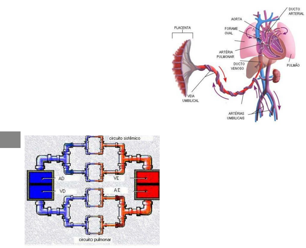 294 – A S S I S T Ê N C I A AO R E C É M - N A S C I D O D E R I S CO | 4 ª E D I Ç ÃO - 2 0 2 1 – 9.1. ARRITMIAS CARDÍACAS/INSUFICIÊNCIA CARDÍACA CONGESTIVA/ CARDIOPATIAS CONGÊNITAS Elysio Moraes Garcia O coração do recém-nascido O coração do recém-nascido apresenta algumas peculiaridades anátomo-fisiológicas, que diferem do coração da criança maior, cujo conhecimento é útil para a compreensão das alterações cardíacas que podem ocorrer nesta fase da vida. Tentaremos sumarizar estes conceitos enfocando o essencial para o entendimento do presente capítulo. Introdução A embriogênese do coração estará completa a partir da quarta semana do desenvolvimento fetal, quando todas as estruturas cardíacas estarão formadas como no adulto. Durante o restante da gestação, o cora- ção do feto crescerá pelo ganho de massa. Desta forma, o primeiro mês de gestação é a fase na qual os agentes teratogênicos têm maior importância na gênese das cardiopatias estruturais. O coração é um órgão vital que podemos representar esquemati- camente como duas bombas hidráulicas funcionando em série (figura 1). O lado direito, átrio e ventrículo direito, recebendo o sangue venoso das veias cavas e direcionando para os pulmões através da artéria pulmonar; e o lado esquerdo, átrio e ventrículo esquerdo, recebendo o sangue, oxi- genado nos pulmões, pelas quatro veias pulmonares e encaminhando-o para distribuição no organismo através da artéria aorta. Figura 1 – Representação esquemática do coração como duas bombas hidráulicas Circulação fetal No feto, a placenta é o órgão responsável pela oxigenação sanguí- nea, e como os pulmões não estão funcionando, o sangue fetal deverá percorrer um trajeto diferente, com alguns desvios necessários (Moore, 2012). O sangue oxigenado na placenta passa pela veia umbilical em di- reção à veia cava inferior, sendo grande parte desviado do sistema porta através do ducto venoso (primeiro desvio). Ao chegar ao átrio direito, a maior parte é direcionada ao forame oval (segundo desvio), átrio esquer- do, ventrículo esquerdo e aorta. A outra parte irá misturar-se ao sangue proveniente da veia cava superior, seguindo para o ventrículo direito, artéria pulmonar e pelo ducto arterial (terceiro desvio), atingindo a aorta descendente. Este trajeto privilegia o pólo cefálico fetal com um sangue mais saturado de oxigênio. Figura 2 – Representação esquemática da circulação fetal Transição da circulação fetal para a do recém-nascido Ao nascimento, com a interrupção do fluxo da veia umbilical e a expansão dos pulmões, ocorre queda da pressão arterial pulmonar e aumento do fluxo pulmonar com consequente incremento do retorno de sangue ao átrio esquerdo através das veias pulmonares. O aumento da pressão no AE levará ao fechamento fisiológico do forame oval. O fecha- mento anatômico ocorrerá posteriormente, com a fusão da membrana do forame oval à parede do átrio esquerdo, o que pode ocorrer meses após o nascimento. Paralelamente, o aumento da saturação de oxigênio no sangue e a ação de algumas substâncias vasoconstritoras (Gournay, 2011) estimula- rão a contração e o fechamento do canal arterial, que ocorrerá durante a primeira semana de vida. Os mecanismos responsáveis pela manutenção do canal arterial aberto serão discutidos posteriormente. Diferenças entre o coração do recém-nascido e das crianças maiores Macroscopicamente comparando o coração do recém-nascido com o de uma criança com mais de 1 ano de vida, observa-se um maior volume do átrio direito e uma hipertrofia relativa das paredes do ventrículo direito, que ocorre devido às características da circulação fetal. No feto, tanto o ventrículo esquerdo quanto o direito estão em con- tato direto com a aorta torácica, ambos trabalhando contra a pressão sistê- mica, ocasionando uma simetria das paredes e cavidades destas câmaras. O átrio direito é o responsável pela distribuição de todo o volume sanguíneo das duas circulações. Para o ventrículo direito, através da valva tricúspide, e para o ventrículo esquerdo, através do forame oval, átrio es- querdo e valva mitral. Este fato explica a sobrecarga volumétrica do átrio direito observada em recém-nascidos. Há, também, diferenças microscópicas. Durante a vida fetal, o coração ganha massa muscular, principalmente devido à multiplicação celular com aumento do número de miócitos (fase hiperplásica). Com a proximidade do termo, há uma tendência à redução da atividade mitótica, com o ganho de massa ocorrendo também por crescimento celular (hi- pertrofia). Nos primeiros 5 dias de vida, observa-se crescimento tanto por hiperplasia quanto hipertrofia celular (fase intermediária). A partir do 14º dia de vida, instala-se a fase definitiva (fase hipertrófica), quando o coração – CAPÍTUL 9 | 9.1. ARRITMIAS CARDÍACAS/INSUFICIÊNCIA CARDÍACA CONGESTIVA/ CARDIOPATIAS CONGÊNITAS – 295 só crescerá por aumento do tamanho dos miócitos, não ocorrendo mais multiplicação celular (Santana, 2000). Atividade elétrica do coração As células cardíacas têm a capacidade de gerar atividade elétrica através da despolarização ocasionada pelo movimento de íons por meio das membranas celulares. Alguns grupos de células possuem características que as possibili- tam comandar a geração e a propagação do impulso elétrico, e compõem um tecido especializado de geração e condução elétrica. São eles: o nó sinoatrial, localizado na região póstero-superior do átrio direito, próximo à entrada da veia cava superior; as fibras internodais; o nó atrioventricular, localizado próximo à valva tricúspide; o feixe atrioventricular, com seus ramos direito e esquerdo; e as fibras de Purkinje nos ventrículos (figura 3). O impulso elétrico origina-se no nó sinoatrial (NSA), dirige-se ao nó atrioventricular (