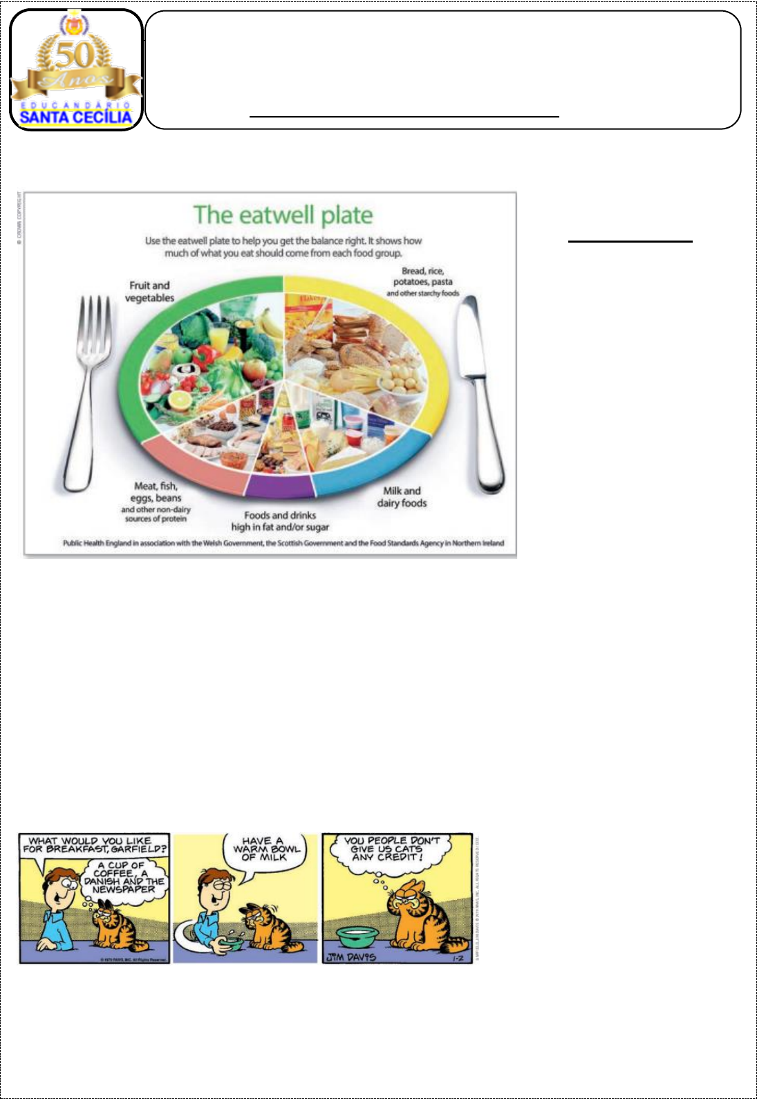 “Uma escola para você gostar” 1- Analyze the following infographic to answer the following questions: VOCABULARY: eatwell: comer bem balance: equilíbrio shows: mostrar each: cada should: deveria non-dairy: não lácteo sources: fontes high: ricos/alto fat: gordura dairy: laticínio a) Why do the “slices” of the Eatwell plate vary in size? Check (✓) the best alternative. ( ) To visually inform the details of healthy eating in a concise way. ( ) To present specific information about healthy foods in each of the “slices”. ( ) To visually inform the proportion of foods for a healthy diet. b) Underline the correct options to complete these sentences about the Eatwell plate. • The Eatwell plate has five / six “slices”. • Each “slice” of the plate represents a food item / group. • The Eatwell plate helps you eat a balanced / an unbalanced diet. • Eating well means having different / similar food items in the correct proportions. • Choosing foods proportionally from only one of / each of the “slices” makes you healthy. 2) Read the comic strip and write F for false and T for true: [ ] Garfield will eat newspaper for breakfast. [ ] Jon is wondering what he wants for lunch. [ ] Garfield is frustrated with the situation. [ ] The cup of coffee is Garfield's real breakfast. 3) Write in English two healthy foods to eat for breakfast. ______________________________________________________________________________________ Aluno(a): __________________________________________________________ Data: 21/05/2024 Turma: 8°ano III Prof.ª: Ana Beatriz Ribeiro Prova de Língua Inglesa – 1° ETAPA / NOTA: “Uma escola para você gostar” 4) Which alternative corresponds to the transformation of the sentence “They don’t have the usual signs” into the Simple Future? (A) They won’t have the usual signs. (B) They will have the usual signs. (C) They have the usual signs. (D) They having the usual signs. 5) What is an alternative to correctly complete the sentence “I’m sure she ___________ me” no Simple Future? (A) recognizes. (B) will recognized. (C) recognize. (D) will recognize. 6) The interrogative form of "Bob and Lilly aren’t going to come with us" is: (A) Will Bob and Lilly come with us? (B) Are Bob and Lilly going to come with us? (C) Do Bob and Lilly come with us? (D) Is Bob going to come with Lilly? 7) Read the table below and answer the questions: →The use of affix below is: CORRECT ( ) INCORRECT ( ) → The term “-un” is: PREFIX ( ) SUFIX ( ) → The affix "un" has the meaning of: ( ) NEGATION ( )EXCESS ( )AGINST 8) "I'll Be There for You" is a song by the band “The Rembrandts”. Read the following excerpt and answer the questions: a) What is the possible translation for “I’ll be there for you”? _________________________________________________________ b) The term -’ll is the abbreviation of which word? _________________________________________________________ c) The tense used in the sentence is? ________________________________________________________ d) Put the sentence "I'll be there for you" to its negative form: ______________________________________________________________________________________ e) Now, Put the sentence "I'll be there for you" in its interrogative form: ______________________________________________________________________________________ Uncomfortable / desconfortável (Comfortable) Uncommon / incomum (Common) Uncertain / incerto (Certain)