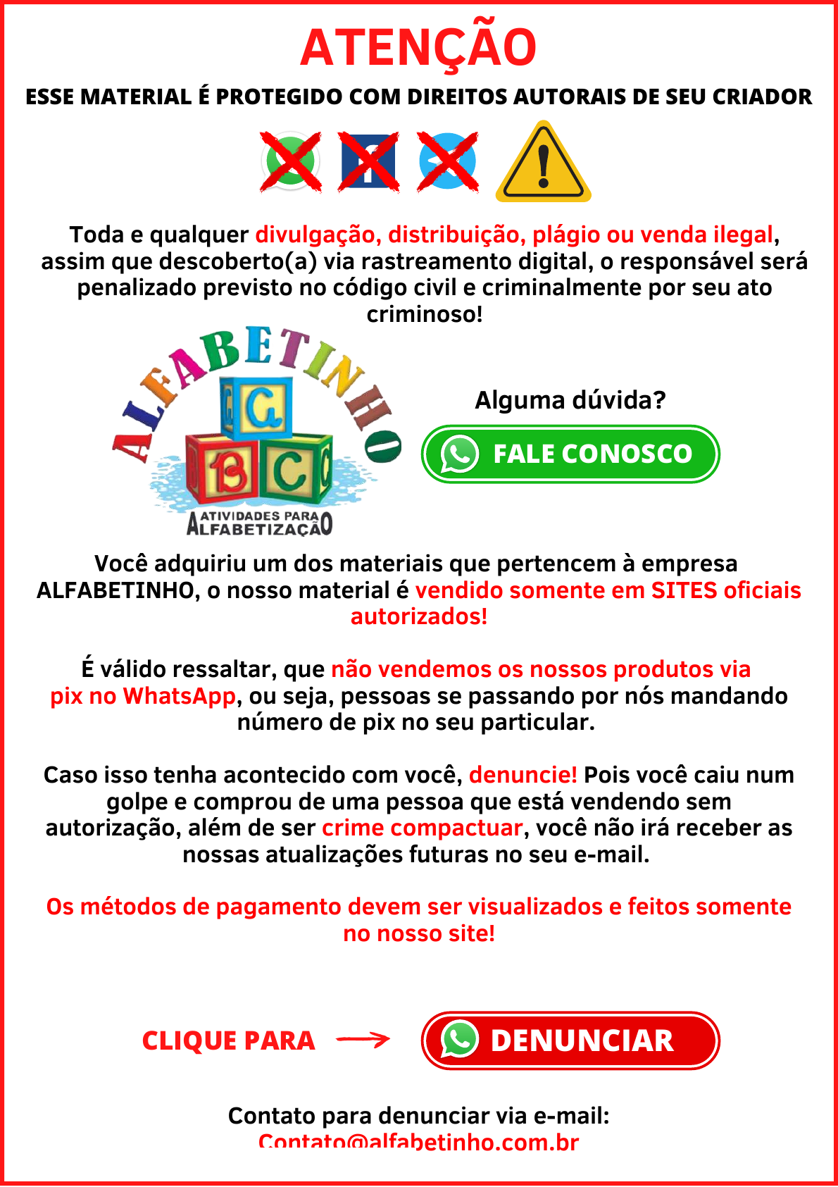 ESSE MATERIAL É PROTEGIDO COM DIREITOS AUTORAIS DE SEU CRIADOR Toda e qualquer divulgação, distribuição, plágio ou venda ilegal, assim que descoberto(a) via rastreamento digital, o responsável será penalizado previsto no código civil e criminalmente por seu ato criminoso! CLIQUE PARA Você adquiriu um dos materiais que pertencem à empresa ALFABETINHO, o nosso material é vendido somente em SITES oficiais autorizados! É válido ressaltar, que não vendemos os nossos produtos via pix no WhatsApp, ou seja, pessoas se passando por nós mandando número de pix no seu particular. Caso isso tenha acontecido com você, denuncie! Pois você caiu num golpe e comprou de uma pessoa que está vendendo sem autorização, além de ser crime compactuar, você não irá receber as nossas atualizações futuras no seu e-mail. Os métodos de pagamento devem ser visualizados e feitos somente no nosso site! ATENÇÃO Contato para denunciar via e-mail: Contato@alfabetinho.com.br DENUNCIAR FALE CONOSCO Alguma dúvida? Conteúdo licenciado para Kenny Vilar da Silva - 012.992.052-59 https://api.whatsapp.com/send?phone=554497031816&text=Ol%C3%A1!%20Gostaria%20de%20conversar%20um%20assunto. https://api.whatsapp.com/send?phone=554497031816&text=Ol%C3%A1%2C%20poderia%20me%20ajudar%3F%20 @alfabetinho_ Primeiramente gostariamos de agradecer a sua confiança em nosso trabalho. Obrigado! PARABÉNS PELA COMPRA! Poste uma imagem de alguma folha que você irá usar dos Planejamentos e marque a gente no seu stories do Instagram e ganhe gratuitamente +100 atividades de alfabetização marque @alfabetinho_ Quer ganhar um presente exclusivo gratuitamente? Conteúdo licenciado para Kenny Vilar da Silva - 012.992.052-59 https://www.instagram.com/alfabetinho_/ https://www.instagram.com/alfabetinho_/ PROFISSIONAIS QUE ATUAM MAIS DE 15 ANOS NA ÁREA! QUALIDADE E SUPORTE PARA CLIENTES Boas vindas! CONHEÇA OS AUTORES REDE PEDAGÓGICA DE PROFESSORES ESPECIALIZADOS AMOR A EDUCAÇÃO INFANTIL E MATERIAIS EXCLUSIVOS! alfabetinho_ abcdaeducacaomais Conteúdo licenciado para Kenny Vilar da Silva - 012.992.052-59 https://www.instagram.com/alfabetinho_/ https://www.instagram.com/alfabetinho_/ https://www.instagram.com/abcdaeducacaomais/ https://www.instagram.com/abcdaeducacaomais/ PARA IMPRIMIR EPARA IMPRIMIR E CONFECCIONARCONFECCIONAR COGUMELOCOGUMELO DAS SÍLABASDAS SÍLABAS JOGOS PEDAGÓGICOSJOGOS PEDAGÓGICOS APOSTILA DEAPOSTILA DE Conteúdo licenciado para Kenny Vilar da Silva - 012.992.052-59 Conteúdo licenciado para Kenny Vilar da Silva - 012.992.052-59 Conteúdo licenciado para Kenny Vilar da Silva - 012.992.052-59 Conteúdo licenciado para Kenny Vilar da Silva - 012.992.052-59 Conteúdo licenciado para Kenny Vilar da Silva - 012.992.052-59 BOLINHAS DO COGUMELO PARA REALIZAR A ATIVIDADE ANTERIOR Conteúdo licenciado para Kenny Vilar da Silva - 012.992.052-59 AVISO DE DIREITOS AUTORAIS ATT: EQUIPE JURÍDICA ALFABETINHO Todo o material desta apostila (incluindo textos e imagens) estão protegidos por direitos autorais de seu criador: ALFABETINHO, sendo proibido toda e qualquer forma de plágio, cópia, venda ilegal, compartilhamento ou qualquer outra forma de uso, não autorizada expressamente, seja ela onerosa ou não, sujeitando- se o transgressor, as penalidades previstas civil e criminalmente. O delito de violação de direito autoral está previsto no artigo 184 do Código Penal, que descreve a conduta criminosa como sendo o ato de infringir direitos inerentes ao autor, ou com eles relacionados. Um exemplo muito corriqueiro são as falsificações, ou os chamados produtos piratas, que são copiados e vendidos sem autorização de quem os idealizou. Toda e qualquer divulgação, distribuição, plágio ou venda ilegal, assim que descoberto(a) o responsável será penalizado previsto no código civil e criminalmente por seu ato criminoso! Conteúdo licenciado para Kenny Vilar da Silva - 012.992.052-59 http://www.planalto.gov.br/ccivil_03/leis/l9610.htm