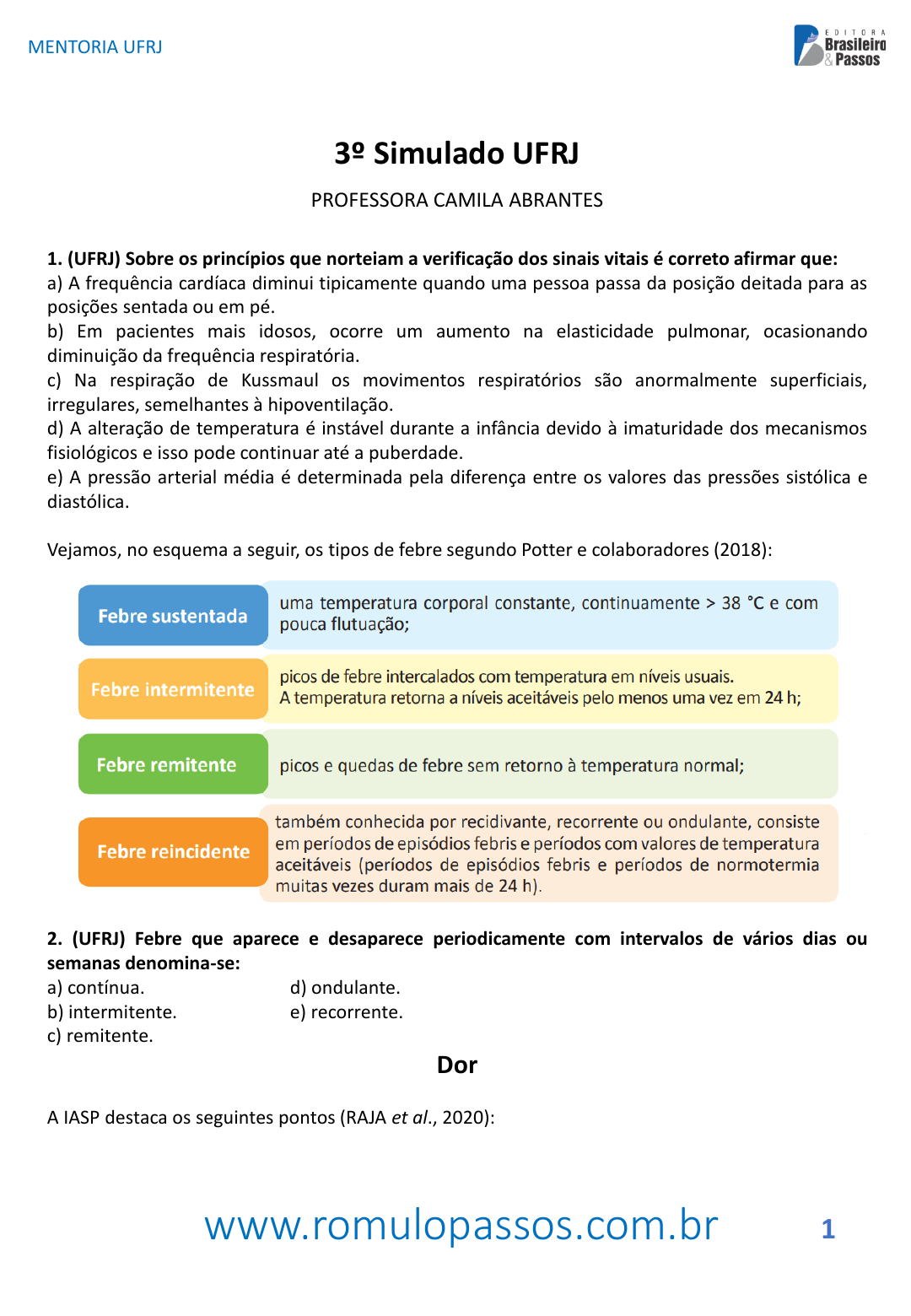 www.romulopassos.com.br MENTORIA UFRJ 1 3º Simulado UFRJ PROFESSORA CAMILA ABRANTES 1. (UFRJ) Sobre os princípios que norteiam a verificação dos sinais vitais é correto afirmar que: a) A frequência cardíaca diminui tipicamente quando uma pessoa passa da posição deitada para as posições sentada ou em pé. b) Em pacientes mais idosos, ocorre um aumento na elasticidade pulmonar, ocasionando diminuição da frequência respiratória. c) Na respiração de Kussmaul os movimentos respiratórios são anormalmente superficiais, irregulares, semelhantes à hipoventilação. d) A alteração de temperatura é instável durante a infância devido à imaturidade dos mecanismos fisiológicos e isso pode continuar até a puberdade. e) A pressão arterial média é determinada pela diferença entre os valores das pressões sistólica e diastólica. Vejamos, no esquema a seguir, os tipos de febre segundo Potter e colaboradores (2018): 2. (UFRJ) Febre que aparece e desaparece periodicamente com intervalos de vários dias ou semanas denomina-se: a) contínua. d) ondulante. b) intermitente. e) recorrente. c) remitente. Dor A IASP destaca os seguintes pontos (RAJA et al., 2020): RITA DE CASSIA BRAGA GOMES - 05921855758 www.romulopassos.com.br MENTORIA UFRJ 2 3. (UFRJ) A avaliação da dor e o registro sistemático e periódico de sua intensidade é tarefa essencial para acompanhar a evolução dos pacientes e orientar o tratamento analgésico. A enfermagem, neste sentido, deve avaliar a dor no mesmo momento em que avalia a pressão arterial, a frequência cardíaca, a frequência respiratória e a temperatura, incluindo-a como quinto sinal vital. Leia as afirmativas abaixo e assinale a que está correta. a) O autorrelato da dor é a melhor ferramenta de avaliação para a medida de sua presença e intensidade. b) A dor em pacientes incapazes de se comunicar apresenta menor risco de ser subtrada principalmente se estiverem sedados. c) As experiências anteriores de dor deixam os pacientes menos ansiosos e mais capazes de avaliar a sua dor. d) Avaliar e reavaliar a dor a cada novo relato do paciente tende a causar estresse e ansiedade. e) A dor não pode ser comprovada e o paciente tende a simular o evento, cabendo à equipe de saúde avaliar sua intensidade. 4. (UFRJ) A colocação de dispositivos intravenosos periféricos constitui um dos procedimentos invasivos mais comuns que a equipe de enfermagem realiza no ambiente hospitalar. Existem riscos para os pacientes relacionados a este procedimento como a infecção do sítio de inserção do cateter ou a infecção primária da corrente sanguínea. Em relação à infecção do sítio da inserção dos dispositivos, os sinais flogísticos que se apresentam são os de: a) rubor, calor, edema e purulência local. b) rubor, calor, edema e dor. c) edema, infiltração, calor e purulência local. d) edema, rubor, hematoma e dor. e) edema, rubor, prurido e dor. RITA DE CASSIA BRAGA GOMES - 05921855758 www.romulopassos.com.br MENTORIA UFRJ 3 5. (UFRJ) Sobre a sondagem vesical é correto afirmar que: a) O sistema de drenagem fechado destina-se a favorecer a desconexão segura, reduzindo o risco de contaminação. b) A área perineal deve ser lavada com água e sabão pelo menos duas vezes ao dia evitando-se um movimento para fora e para trás do cateter. c) A sonda de luz dupla permite a irrigação continua da bexiga com solução estéril após cirurgia prostática transuretral. d) As sondas prejudicam as defesas naturais ao obstruir os ductos periuretrais no trato urinário superior e fornecer uma via artificial para a bexiga. e) A bolsa coletora deve ser mantida numa posição de aclive em relação ao nível da bexiga. Escala de Braden 6. (UFRJ) O envelhecimento determina alterações fisiológicas na estrutura da pele, as quais podem contribuir com riscos externos para o aparecimento de úlceras por pressão, portanto, o técnico de enfermagem, bem como toda a equipe de saúde, deve conhecer as diferentes subescalas que compõem a escala de Braden, uma das principais escalas de avaliação de risco para úlcera por pressão utilizada no Brasil. Assinale a alternativa que as compreendem: a) percepção sensitiva, umidade, atividade, motilidade, nutrição e fricção. b) percepção sensorial, umidade, atividade, mobilidade, nutrição e fricção/cisalhamento. c) percepção sensorial, umidade, inatividade, mobilidade, nutrição e cisalhamento. d) percepção sensorial, umidade, atividade, motilidade, nutrição e fricção/cisalhamento. e) percepção sensitiva, umidade, atividade, mobilidade, nutrição e cisalhamento. RITA DE CASSIA BRAGA GOMES - 05921855758 www.romulopassos.com.br MENTORIA UFRJ 4 Critérios para uma cobertura eficaz 7. (UFRJ) De acordo com as pesquisas em tratamento de feridas e segundo WINTER (1962), o meio mais favorável às condições de cicatrização de uma ferida e que determina menos dor é o: a) úmido. b) básico. c) ácido. d) neutro. e) seco. INTERVENÇÕES PREVENTIVAS RENAIS Organização Pan-Americana da Saúde, 2010 Para o indivíduo com diabete é recomendado um controle rigoroso da glicemia, com valores alvo de glicemia de jejum entre 80-120mg/dl e hemoglobina glicada (A1c) < 7%. A presença de microalbuminúria com ou sem hipertensão deve ser tratada com um iECA (captopril, enalapril). Prevenir a agudização da insuficiência renal em populações de risco é importante, pois modifica de modo favorável a evolução natural da DRC. Para isso se recomenda: ▪ Prevenir distúrbios hemodinâmicos: evitar desidratação (diarréia, vômitos, diminuição da ingestão líquida, uso excessivo de laxantes e diuréticos) e hipotensão arterial; ▪ Evitar o uso de agentes nefrotóxicos especialmente antibióticos aminoglicosídeos (gentamicina, garamicina, amicacina) e anti-inflamatórios não esteroides de qualquer espécie; ▪ Prescrever antibióticos com cautela em pacientes portadores de insuficiência renal,