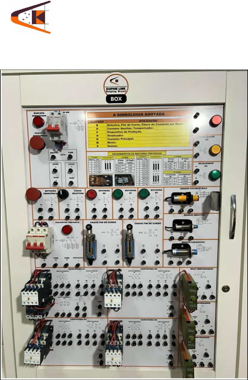 OBRA KOLPING DO BRASIL Escola Técnica Profissionalizante Sophie Link CARDENO DE ATIVIDADE PRÁTICA ELETRICIDADE APLICADA OBRA KOLPING DO BRASIL Escola Técnica Profissionalizante Sophie Link RESUMO O que se apresenta, neste material é uma série de experiência práticas que visam enriquecer o conteúdo teórico administrado nos cursos voltados às áreas que operam com eletricidade. As experiências e diagramas foram confeccionados de maneira que estudantes possam tirar o máximo de aproveito de estrutura dos laboratórios para fins didáticos, além é claro, de contribuir para aprendizagem significativa. Dentre todas as tarefas sugeridas, há um apanhado de diagramas e esquemas que abordam desde a mais simples maneira de ligar e manipular os circuitos elétricos que até esquemas mais elaborados. A sequência na qual as tarefas são apresentadas obedece a uma ordem que visa oportunizar um gradual aumento das habilidades técnicas, e acima de tudo ao raciocínio lógico relacionado ao uso de eletricidade, de forma a permitir que o usuário da bancada possa desenvolver novos projetos a partir daqueles que já utilizou ou até mesmo construir novas formas de utilizar o que aqui foi tratado. OBRA KOLPING DO BRASIL Escola Técnica Profissionalizante Sophie Link INTRODUÇÃO É com grande satisfação que a Escola Técnica Profissionalizante SOPHIE LINK preparou este material para você! Todo o conteúdo que você está recebendo foi construído de maneira a oportunizar a aprendizado prático e permitir a observação dos efeitos criados pelos fenômenos eletromagnéticos ou puramente elétricos que ocorrem isoladamente ou devido a um conjunto de acionamentos capazes de promover um objetivo maior. Dentro de instante você vai acessar a série de experimentos que poderão ser realizados por você e que permitirão a observação das possibilidades que se mostram a você a partir da introdução teórica tratada pelo professor. As montagens práticas possíveis de serem efetuadas compreendem desde a mais simples montagens especificas e mais elaborados. O que a SOPHIE LINK espera é que com uso deste material você possa tirar o máximo de proveito da bancada didática que está a sua disposição. Seguindo com atenção as etapas propostas pelos experimentos, a utilização dos circuitos elétricos aos poucos se revelará a você e a partir daí você dará significado às mais diferenciadas maneiras de propor soluções utilizando o acionamento elétrico como seu aliado. Bons estudos! OBRA KOLPING DO BRASIL Escola Técnica Profissionalizante Sophie Link ATIVIDADE 01 SISTEMA PARTIDA DIRETA SIMPLES SEM REVERÇÃO Material Utilizado: 1 Botoeira B0 (cor Vermelha) 1 Botoeira B1 (cor Verde) 1 Contatora (K1) 1 Relé Térmico de Sobrecarga (F4) 1 Disjuntor Bifásico (Q0) 1 Disjuntor Trifásico (Q1) 1 Motor Elétrico Trifásico. Etapas de realização: a) Identificar os componentes de acordo com a simbologia adotada; b) Efetuar a montagem de acordo com o diagrama de comando 1. c) Chamar o professor para ligar a alimentação da bancada; d) Ligar o disjuntor monofásico. e) Ao pressione a botoeira B1 a contatora K1 deve ligar. f) Para desligar a contatora K1 pressione B0. g) Se tudo funcionou corretamente parabéns, desliga tudo e comesse a fazer a diagrama de força 1. h) Caso que não funcionou corretamente repita as operações do início (a). i) Chamar o professor para ligar a alimentação da bancada; j) Ao pressione a botoeira B1 a contatora K1 e motor deverá ligar. k) Para desligar a contatora K1 e o motor elétrico pressione B0. l) Faça as analise junto com o professor e respondas as perguntas dessa etapa. Perguntas a) Neste sistema, a corrente de partida do motor é de: _____________________________________________________________________ _____________________________________________________________________ b) Existem limites de potência para o sistema partida direta para cada tensão de rede, conforme determinação da concessionária local, sendo na maioria dos casos de: _____________________________________________________________________ _____________________________________________________________________ c) Neste sistema, a corrente a vazio do motor é de: _____________________________________________________________________ _____________________________________________________________________ Observação: _____________________________________________________________________ _____________________________________________________________________ _____________________________________________________________________ _____________________________________________________________________ A A B B C C D D E E F F G G H H 1 1 2 2 3 3 4 4 5 5 Data: Nome: Assinaturas: Desenhado: Verificado: Entidade: Título: Data: Num: Arquivo: 220V AC L1 L2 L3 PE DIAGRAMA DE FORÇA 1 Q1 1 3 5 2 4 6 I> I> I> K1 1 3 5 2 4 6 F4 1 3 5 2 4 6 M1 U1 V1 W1 PE M 3 Q0 1 3 2 4 I> 24VAC L N B1 3 4 B0 1 2 K1 A1 A2 K1 13 14 B0 B1 BOTOEIRA BOTOEIRA Obra Kolping do Brasil Escola Técnica Profissionaliza Sophie Link LAB. ELETRICIDADE INDUSTRIAL DIAGRAMA DE COMANDO 1 L - 24 VAC N - 0 VAC 24 VAC L3 24VAC X1 X2 L1 24VAC X1 X2 L2 24VAC X1 X2 K1 23 24 K1 11 12 F4 95 97 96 98 Opcional OBRA KOLPING DO BRASIL Escola Técnica Profissionalizante Sophie Link ATIVIDADE 02 SISTEMA PARTIDA DIRETA COM REVERÇÃO SIMPLES Material Utilizado: 1 Botoeira B0 (cor Vermelha) 1 Botoeira B1 (cor Verde) 1 Botoeira B2 (cor Verde ou cor Preta) 1 Contatora (K1) 1 Contatora (K2) 1 Relé Térmico de Sobrecarga (F4) 1 Disjuntor Bifásico (Q0) 1 Disjuntor Trifásico (Q1) 1 Motor Elétrico Trifásico. Etapas de realização: a) Identificar os componentes de acordo com a simbologia adotada; b) Efetuar a montagem de acordo com o diagrama de comando 2. c) Chamar o professor para ligar a alimentação da bancada; d) Ligar o disjuntor Bifásico (Q0). e) Ao pressione a botoeira B1 a contatora K1 deve ligar. f) Ao pressione a botoeira B2 a contatora K2 não deve 