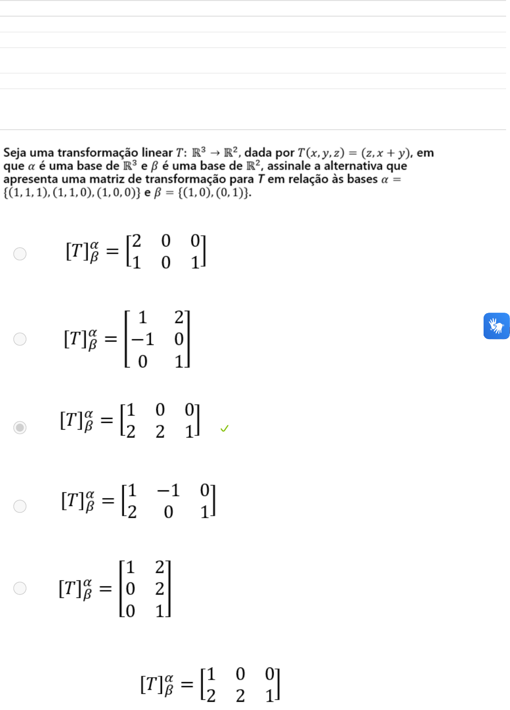 17/06/2024 08:19 Álgebra Linear: Revisão da tentativa https://ava.faculdadefocus.edu.br/mod/quiz/review.php?attempt=543777&cmid=3131 1/11 Iniciado em sábado, 15 jun. 2024, 08:31 Estado Finalizada Concluída em sábado, 15 jun. 2024, 09:57 Tempo empregado 1 hora 25 minutos Avaliar 2,0 de um máximo de 10,0(20%) Questão 1 Correto Atingiu 1,0 de 1,0 a. b. c. . d. e. A resposta correta é: . 17/06/2024 08:19 Álgebra Linear: Revisão da tentativa https://ava.faculdadefocus.edu.br/mod/quiz/review.php?attempt=543777&cmid=3131 2/11 Questão 2 Incorreto Atingiu 0,0 de 1,0 Vimos que as matrizes de mudança de base seguem a seguinte proposição : a. b. c. d. e. A resposta correta é: 17/06/2024 08:19 Álgebra Linear: Revisão da tentativa https://ava.faculdadefocus.edu.br/mod/quiz/review.php?attempt=543777&cmid=3131 3/11 Questão 3 Incorreto Atingiu 0,0 de 1,0 I. T é injetiva e o núcleo de T tem dimensão nula, porque II. T(0)=0. A respeito das asserções, assinale a alternativa correta. a. As asserções I e II são proposições verdadeiras, e a II é uma justificativa da I. b. A asserção I é uma proposição falsa, e a II é uma proposição verdadeira. c. As asserções I e II são proposições verdadeiras, mas a II não é uma justificativa da I. d. A asserção I é uma proposição verdadeira, e a II é uma proposição falsa. e. As asserções I e II são proposições falsas. A resposta correta é: As asserções I e II são proposições verdadeiras, e a II é uma justificativa da I. 17/06/2024 08:19 Álgebra Linear: Revisão da tentativa https://ava.faculdadefocus.edu.br/mod/quiz/review.php?attempt=543777&cmid=3131 4/11 Questão 4 Incorreto Atingiu 0,0 de 1,0 Analise as asserções a seguir: I. Em um espaço vetorial euclidiano com dimensão finita, a matriz de um operador representando uma isometria tem determinante ±1 porque II. Se o determinante do operador for diferente de ±1, ele modifica a norma de vetores e, portanto, muda a distância da origem até o vetor. Assinale a alternativa correta. a. A asserção I é uma proposição verdadeira, e a II é uma proposição falsa. b. As asserções I e II são proposições falsas. c. As asserções I e II são proposições verdadeiras, e a II é uma justificativa da I. d. As asserções I e II são proposições verdadeiras, mas a II não é uma justificativa da I. e. A asserção I é uma proposição falsa, e a II é uma proposição verdadeira. A resposta correta é: As asserções I e II são proposições verdadeiras, e a II é uma justificativa da I. 17/06/2024 08:19 Álgebra Linear: Revisão da tentativa https://ava.faculdadefocus.edu.br/mod/quiz/review.php?attempt=543777&cmid=3131 5/11 Questão 5 Incorreto Atingiu 0,0 de 1,0 A respeito das asserções, assinale a alternativa correta. a. As asserções I e II são proposições falsas e não representam o teorema espectral para as formas bilineares. b. A asserção I é uma proposição falsa, e a II é uma proposição verdadeira a respeito do teorema espectral. c. As asserções I e II são proposições verdadeiras, e a II é um complemento de I para o teorema espectral. d. As asserções I e II são proposições verdadeiras, mas a II não é um complemento de I para o teorema espectral. e. A asserção I é uma proposição verdadeira, e a II é uma proposição falsa como complemento de I para o teorema espectral. A resposta correta é: As asserções I e II são proposições verdadeiras, e a II é um complemento de I para o teorema espectral. 17/06/2024 08:19 Álgebra Linear: Revisão da tentativa https://ava.faculdadefocus.edu.br/mod/quiz/review.php?attempt=543777&cmid=3131 6/11 Questão 6 Correto Atingiu 1,0 de 1,0 Seja a. Apenas a afirmação I está correta. b. Apenas a afirmação III está correta. c. Apenas as afirmações I e II estão corretas. d. Apenas as afirmações I e III estão corretas. e. Apenas a afirmação II está correta. A resposta correta é: Apenas as afirmações I e III estão corretas. 17/06/2024 08:19 Álgebra Linear: Revisão da tentativa https://ava.faculdadefocus.edu.br/mod/quiz/review.php?attempt=543777&cmid=3131 7/11 Questão 7 Incorreto Atingiu 0,0 de 1,0 a. b. c. Não é possível calcular autovalores reais para essa transformação. d. e. A resposta correta é: 17/06/2024 08:19 Álgebra Linear: Revisão da tentativa https://ava.faculdadefocus.edu.br/mod/quiz/review.php?attempt=543777&cmid=3131 8/11 Questão 8 Incorreto Atingiu 0,0 de 1,0 . a. b. c. d. e. 17/06/2024 08:19 Álgebra Linear: Revisão da tentativa https://ava.faculdadefocus.edu.br/mod/quiz/review.php?attempt=543777&cmid=3131 9/11 A resposta correta é: Questão 9 Incorreto Atingiu 0,0 de 1,0 a. b. c. [T] não é diagonalizável, pois [T] possui autovetores linearmente independentes. d. [T] não é diagonalizável, pois [T] possui autovetores linearmente dependentes. e. A resposta correta é: [T] não é diagonalizável, pois [T] possui autovetores linearmente 17/06/2024 08:19 Álgebra Linear: Revisão da tentativa https://ava.faculdadefocus.edu.br/mod/quiz/review.php?attempt=543777&cmid=3131 10/11 p [ ] g , p [ ] p dependentes. Questão 10 Incorreto Atingiu 0,0 de 1,0 . a. b. c. d. e. A resposta correta é: 17/06/2024 08:19 Álgebra Linear: Revisão da tentativa https://ava.faculdadefocus.edu.br/mod/quiz/review.php?attempt=543777&cmid=3131 11/11 Terminar revisão Ambiente Virtual de Aprendizagem | Faculdade Focus atendimento@faculdadefocus.com.br Faculdade Focus Seguir para... Contate o suporte do site Resumo de retenção de dados https://ava.faculdadefocus.edu.br/mod/quiz/view.php?id=3131 https://ava.faculdadefocus.edu.br/ mailto:atendimento@faculdadefocus.com.br https://www.facebook.com/faculdadefocus https://www.linkedin.com/school/faculdadefocus/ https://www.youtube.com/user/FOCUSCONCURSOS https://www.instagram.com/faculdadefocus/ https://ava.faculdadefocus.edu.br/mod/page/view.php?id=3143&forceview=1 https://ava.faculdadefocus.edu.br/mod/url/view.php?i