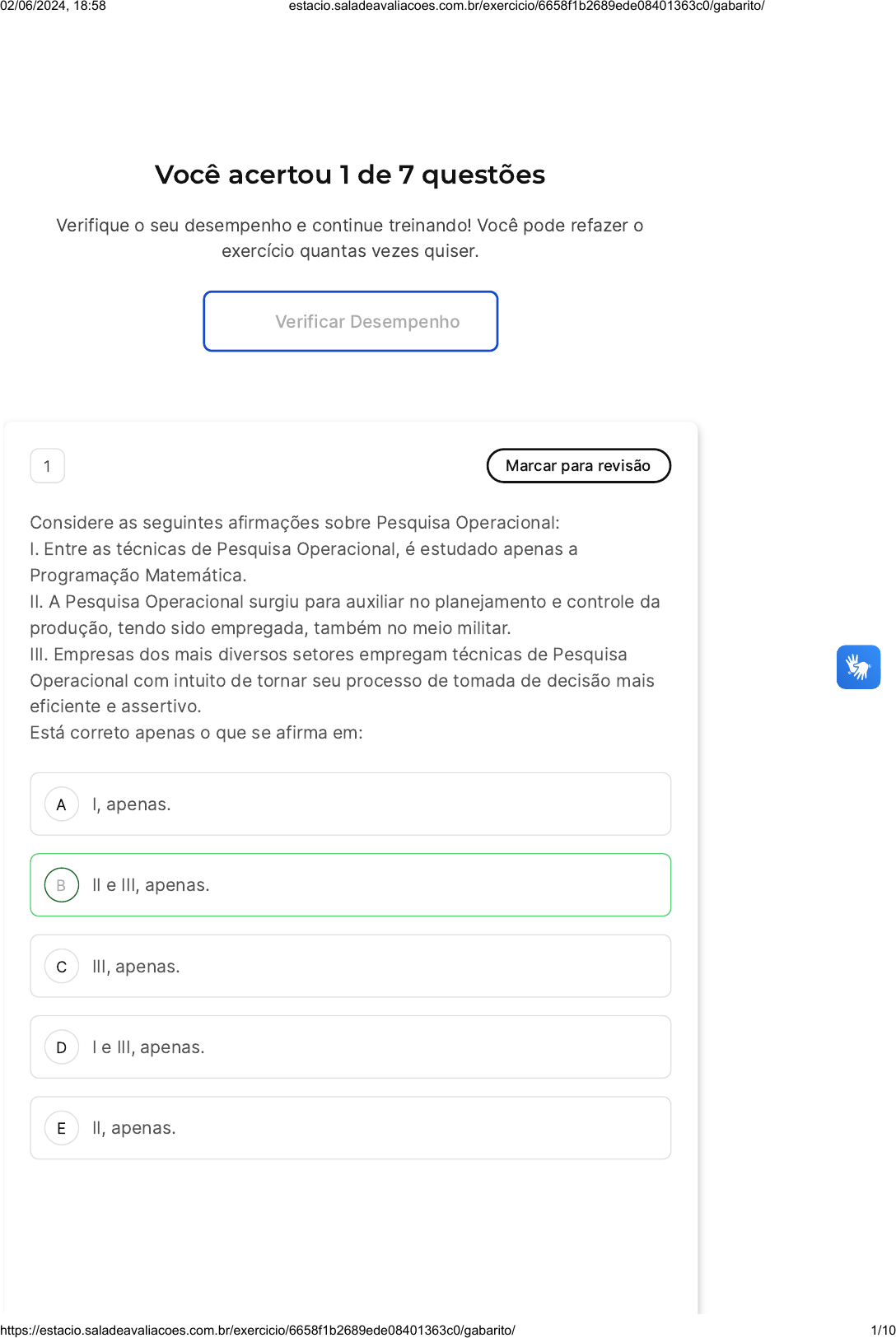 Você acertou 1 de 7 questões Verifique o seu desempenho e continue treinando! Você pode refazer o exercício quantas vezes quiser. Verificar Desempenho A B C D E 1 Marcar para revisão Considere as seguintes afirmações sobre Pesquisa Operacional: I. Entre as técnicas de Pesquisa Operacional, é estudado apenas a Programação Matemática. II. A Pesquisa Operacional surgiu para auxiliar no planejamento e controle da produção, tendo sido empregada, também no meio militar. III. Empresas dos mais diversos setores empregam técnicas de Pesquisa Operacional com intuito de tornar seu processo de tomada de decisão mais eficiente e assertivo. Está correto apenas o que se afirma em: I, apenas. II e III, apenas. III, apenas. I e III, apenas. II, apenas. 02/06/2024, 18:58 estacio.saladeavaliacoes.com.br/exercicio/6658f1b2689ede08401363c0/gabarito/ https://estacio.saladeavaliacoes.com.br/exercicio/6658f1b2689ede08401363c0/gabarito/ 1/10 A B C D E Resposta correta Parabéns, você selecionou a alternativa correta. Confira o gabarito comentado! Gabarito Comentado I. Não é correta, pois a pesquisa operacional estuda várias técnicas além da programação matemática, como simulação, otimização, teoria da decisão e inteligência artificial. II. É correta, pois a pesquisa operacional surgiu mesmo para auxiliar no planejamento e controle da produção e foi aplicada também no meio militar. III. É correta, pois empresas de diversos setores empregam técnicas de pesquisa operacional para tornar seus processos de tomada de decisão mais eficientes e assertivos. 2 Marcar para revisão A pesquisa operacional é uma área que utiliza modelos para auxiliar na tomada de decisões. Qual é o objetivo da pesquisa operacional? Desenvolver modelos matemáticos para resolver problemas reais Resolver problemas reais utilizando técnicas não computacionais. Encontrar a melhor solução para problemas reais, somente através de simulação. Analisar problemas reais utilizando processos decisórios. Analisar problemas reais utilizando técnicas estatísticas Resposta incorreta Opa! A alternativa correta é a letra A. Confira o gabarito comentado! Gabarito Comentado 02/06/2024, 18:58 estacio.saladeavaliacoes.com.br/exercicio/6658f1b2689ede08401363c0/gabarito/ https://estacio.saladeavaliacoes.com.br/exercicio/6658f1b2689ede08401363c0/gabarito/ 2/10 A B C D E O objetivo da pesquisa operacional é desenvolver modelos matemáticos que possam ser aplicados na resolução de problemas reais. 3 Marcar para revisão Uma fazenda produz dois tipos de alimentos, A e B, que são vendidos a R 3,00 por unidade, respectivamente. Para produzir 1 unidade de A, são necessárias 2 horas de trabalho e 1 unidade de matéria-prima, enquanto para produzir 1 unidade de B, são necessárias 1 hora de trabalho e 2 unidades de matéria-prima. A fazenda tem disponíveis 200 horas de trabalho e 150 unidades de matéria-prima. Qual a valor da receita máxima possível, considerando a quantidade de cada produto que a fazenda deve produzir? 2, 00eR R$ 265,00 R$ 300,00 R$ 359,00 R$ 400,00 R$ 459,00 Resposta incorreta Opa! A alternativa correta é a letra A. Confira o gabarito comentado! Gabarito Comentado Para resolver a questão pelo método gráfico, precisamos plotar as restrições do problema e a função objetivo. As restrições são: 2h + m ≤ 200 h � 2m ≤ 150 onde h é o número de horas de trabalho e m é o número de unidades de matéria-prima. Já a função objetivo é: 02/06/2024, 18:58 estacio.saladeavaliacoes.com.br/exercicio/6658f1b2689ede08401363c0/gabarito/ https://estacio.saladeavaliacoes.com.br/exercicio/6658f1b2689ede08401363c0/gabarito/ 3/10 R � 2A � 3B onde A é o número de unidades do produto A e B é o número de unidades do produto B. Vamos agora desenhar os gráficos das restrições: Para a primeira restrição, podemos escolher dois pontos e traçar uma reta que os conecte. Por exemplo: 2h + m ≤ 200 Para h � 0, m � 200� �0, 200� Para m � 0, h � 100� �100, 0� Para a segunda restrição, podemos escolher dois pontos e traçar uma reta que os conecte. Por exemplo: h � 2m ≤ 150 Para h � 0, m � 75� �0, 75� Para m � 0, h � 150� �150, 0� Para a reta do vetor R, basta escolher dois pontos de A e B, por exemplo: R � 2A � 3B �0,0� à R � 2xA � 3xB � 1�0 � 1�0 �0,0� �50,50� à R � 2xA � 3xB � 2�50 � 3�50 �100,150� Podemos plotar as restrições no plano cartesiano e encontrar a região viável: A região viável é a área hachurada, que é delimitada pelas retas. Agora, precisamos avaliar a função objetivo em cada um dos vértices da forma formado pela região viável. Temos: R�0,0� � 0 R�0,75� � 225 R�38,56� � 244 R�83,33� � 265 02/06/2024, 18:58 estacio.saladeavaliacoes.com.br/exercicio/6658f1b2689ede08401363c0/gabarito/ https://estacio.saladeavaliacoes.com.br/exercicio/6658f1b2689ede08401363c0/gabarito/ 4/10 A B C D E R�100,0� � 200 Portanto, a quantidade de cada produto que a fazenda deve produzir para maximizar a receita é de 83 unidades de A e 33 unidades de B, resultando numa receita de R$ 265,00 4 Marcar para revisão Uma empresa produz dois tipos de produtos, A e B, com lucro de R 8,00 por unidade, respectivamente. Sabendo que a produção de A demanda 2 horas de trabalho e 1 hora de máquina, enquanto a produção de B demanda 1 hora de trabalho e 2 horas de máquina, e que a empresa tem disponíveis 100 horas de trabalho e 80 horas de máquina, qual a quantidade de cada produto que a empresa deve produzir para maximizar o lucro? 10, 00eR 20 unidades de A e 40 unidades de B 25 unidades de A e 35 unidades de B 30 unidades de A e 25 unidades de B 35 unidades de A e 25 unidades de B 40 unidades de A e 20 unidades de B Resposta incorreta Opa! A alternativa correta é a letra C. Confira o gabarito comentado! Gabarito Comentado A empresa precisa decidir quantas unidades produzi