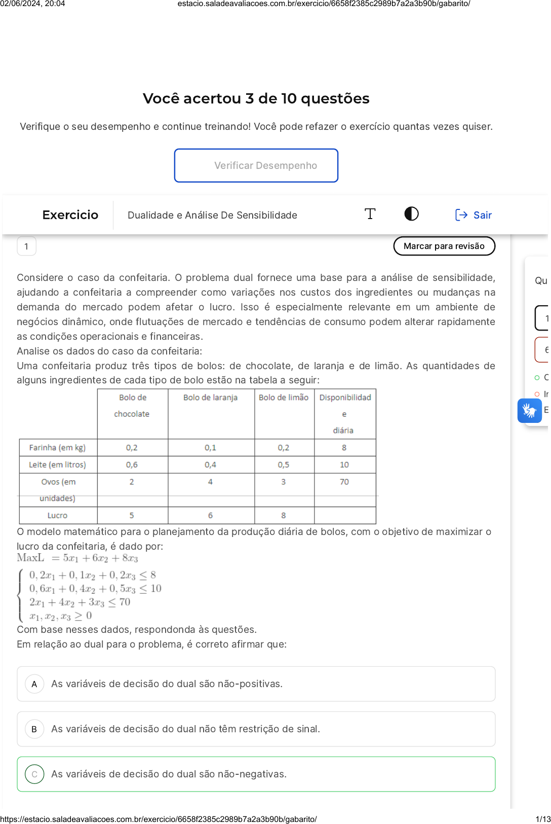 Você acertou 3 de 10 questões Verifique o seu desempenho e continue treinando! Você pode refazer o exercício quantas vezes quiser. Verificar Desempenho A B C 1 Marcar para revisão Considere o caso da confeitaria. O problema dual fornece uma base para a análise de sensibilidade, ajudando a confeitaria a compreender como variações nos custos dos ingredientes ou mudanças na demanda do mercado podem afetar o lucro. Isso é especialmente relevante em um ambiente de negócios dinâmico, onde flutuações de mercado e tendências de consumo podem alterar rapidamente as condições operacionais e financeiras. Analise os dados do caso da confeitaria: Uma confeitaria produz três tipos de bolos: de chocolate, de laranja e de limão. As quantidades de alguns ingredientes de cada tipo de bolo estão na tabela a seguir: O modelo matemático para o planejamento da produção diária de bolos, com o objetivo de maximizar o lucro da confeitaria, é dado por: Com base nesses dados, respondonda às questões. Em relação ao dual para o problema, é correto afirmar que: As variáveis de decisão do dual são não-positivas. As variáveis de decisão do dual não têm restrição de sinal. As variáveis de decisão do dual são não-negativas. Qu C In E 1 6 Exercicio Dualidade e Análise De Sensibilidade Sair 02/06/2024, 20:04 estacio.saladeavaliacoes.com.br/exercicio/6658f2385c2989b7a2a3b90b/gabarito/ https://estacio.saladeavaliacoes.com.br/exercicio/6658f2385c2989b7a2a3b90b/gabarito/ 1/13 D E A B As restrições do dual são do tipo ≤. As restrições do dual são do tipo =. Resposta correta Parabéns, você selecionou a alternativa correta. Confira o gabarito comentado! Gabarito Comentado A resposta correta é: As variáveis de decisão do dual são não-negativas. Como as restrições do primal são de ≤ as variáveis de decisão do dual são não negativas. 2 Marcar para revisão A busca pelo lucro máximo é uma viagem contínua para qualquer confeitaria, representando o objetivo de otimizar todos os aspectos de suas operações — desde a seleção e uso eficiente de ingredientes até a definição de estratégias de preços e marketing. Uma confeitaria produz três tipos de bolos: de chocolate, de laranja e de limão. As quantidades de alguns ingredientes de cada tipo de bolo estão na tabela a seguir O modelo matemático para o planejamento da produção diária de bolos, com o objetivo de maximizar o lucro da confeitaria, é dado por: Com base nesses dados, respondonda às questões. O lucro máximo obtido com a produção dos três tipos de bolo é de $ 160,00. Caso a disponibilidade de leite aumentasse para 11 litros, o lucro máximo da confeitaria: Não sofreria alteração. Passaria a $ 166,00. 02/06/2024, 20:04 estacio.saladeavaliacoes.com.br/exercicio/6658f2385c2989b7a2a3b90b/gabarito/ https://estacio.saladeavaliacoes.com.br/exercicio/6658f2385c2989b7a2a3b90b/gabarito/ 2/13 C D E Passaria a $ 176,00. Passaria a $ 186,00. Passaria a $ 206,00. Resposta incorreta Opa! A alternativa correta é a letra C. Confira o gabarito comentado! Gabarito Comentado A questão poderia ser resolvida por meio do método Simplex ou pelo Solver do Excel. Abaixo podemos ver o resultado encontrado: Portanto, caso a disponibilidade de leite fosse de 11, o resultado seria R$ 176,00 3 Marcar para revisão A seguir, será apresentado um estudo de caso que propõem uma oportunidade de otimização de recursos financeiros enquanto promovem um estilo de vida saudável. Analise o estudo de caso nutricionista e assinale o que se pede. Uma mãe deseja que seus filhos tenham uma alimentação equilibrada e, por isso, consultou uma nutricionista, que lhe recomendou que eles consumam por dia, no mínimo, 10 mg de vitamina A, 70 mg de vitamina C e 250 de vitamina D. Mas essa mãe também está preocupada com os custos. Ela deseja oferecer aos filhos a dieta equilibrada, porém ao menor custo possível. Para ajudar nos cálculos, ela fez uma pesquisa sobre informações nutricionais para diferentes tipos de alimento, conforme apresentado a seguir. Tabela de informações nutricionais em mg Vitamina Leite �L� Carne (kg) Peixe (kg) Salada �100 g) A 2 2 10 20 C 50 20 10 30 D 80 70 10 80 02/06/2024, 20:04 estacio.saladeavaliacoes.com.br/exercicio/6658f2385c2989b7a2a3b90b/gabarito/ https://estacio.saladeavaliacoes.com.br/exercicio/6658f2385c2989b7a2a3b90b/gabarito/ 3/13 A B C D E A mãe também foi ao supermercado e verificou que um litro de leite custa 20,00, um quilo de peixe custa 3,00. O modelo matemático para o planejamento da alimentação das crianças, buscando minimizar o custo, é dado por: Min Z � 2x � 20x � 25x � 3x s. a.: 2x � 2x � 10x � 20x ≥ 10 50x � 20x � 10x � 30x ≥ 70 80x � 70x � 10x � 80x ≥ 250 x , x , x , x ≥ 0 Sendo: x = litros de leite a serem consumidos por dia pelas crianças x = quilos de carne a serem consumidos por dia pelas crianças x = quilos de peixe a serem consumidos por dia pelas crianças x � 100 g de salada a serem consumidos por dia pelas crianças O custo mínimo que a mãe vai ter é de $ 6,46. Caso a recomendação de ingestão mínima de vitamina A passasse para 60 mg por dia, o custo mínimo: 2, 00,umquilodecarnecusta 25, 00, equeparapreparar100gdesaladaelagastaria 1 2 3 4 1 2 3 4 1 2 3 4 1 2 3 4 1 2 3 4 1 2 3 4 Não sofreria alteração. Aumentaria em $ 0,20. Aumentaria em $ 1,20. Aumentaria em $ 2,78. Aumentaria em $ 3,20. Resposta incorreta Opa! A alternativa correta é a letra D. Confira o gabarito comentado! Gabarito Comentado A resposta certa é: Aumentaria em 2,78. 2, 78.CombasenasoluçãodoSolverabaixo, chegamosaconclusãodequeocustoaumentaemR 02/06/2024, 20:04 estacio.saladeavaliacoes.com.br/exercicio/6658f2385c2989b7a2a3b90b/gabarito/ https://estacio.saladeavaliacoes.com.br/exercicio/6658f2385c2989b7a2a3b90b/gabarito/ 4/13 A B C D E 4 Marcar para revisão No cenário de uma confeitaria que busca otimizar sua produção diária