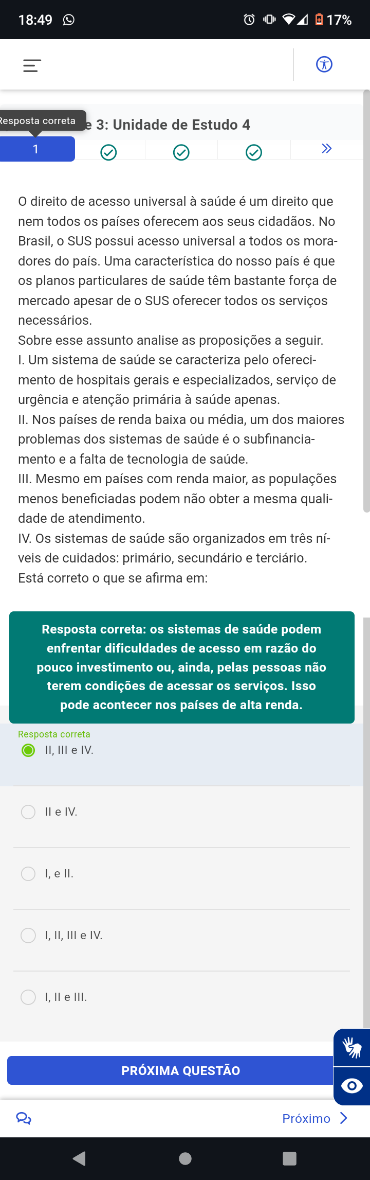 O direito de acesso universal à saúde é um direito que nem todos os países oferecem aos seus. No Brasil, o SUS possui acesso universal a todos os moradores do país. Uma característica do nosso país é que os planos particulares de saúde têm bastante força de mercado apesar de o SUS oferecer todos os serviços necessários. Sobre esse assunto analise as proposições a seguir. Está correto o que se afirma em: I. Um sistema de saúde se caracteriza pelo oferecimento de hospitais gerais e especializados, serviço de urgência e atenção primária à saúde apenas. II. Nos países de renda baixa ou média, um dos maiores problemas dos sistemas de saúde é o subfinanciamento e a falta de tecnologia de saúde. III. Mesmo em países com renda maior, as populações menos beneficiadas podem não obter a mesma qualidade de atendimento. IV. Os sistemas de saúde são organizados em três níveis de cuidados: primário, secundário e terciário. Resposta correta: II, III e IV. Resposta correta: I, II. Resposta correta: I, III.