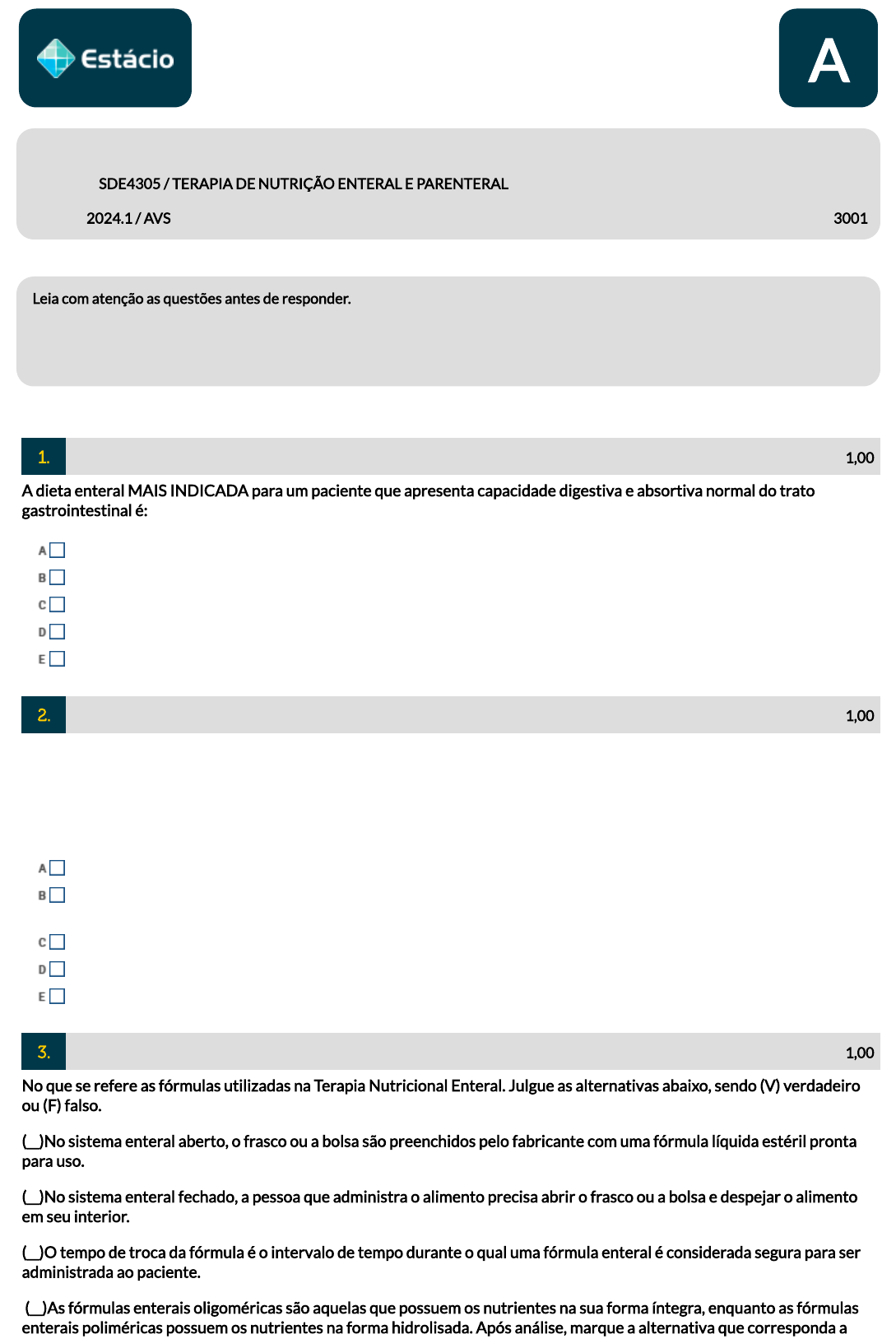 7031829820 A 17/06/2024 19:07 Nome: Matrícula: ________________ Disciplina: SDE4305 / TERAPIA DE NUTRIÇÃO ENTERAL E PARENTERAL Data: ___ /___ /______ Período: 2024.1 / AVS Turma: 3001 Leia com atenção as questões antes de responder. É proibido o uso de equipamentos eletrônicos portáteis e consulta a materiais de qualquer natureza durante a realização da prova. Boa prova. 1. _______ de 1,00 A dieta enteral MAIS INDICADA para um paciente que apresenta capacidade digestiva e absortiva normal do trato gastrointestinal é: Dieta enteral especializada. Dieta enteral polimérica. Dieta parenteral Dieta enteral elementar. Dieta enteral semi-elementar. 2. _______ de 1,00 Paciente de 28 anos foi internado num hospital público devido a um Infarto Agudo do Miocárdio. Sendo levado para UTI do Hospital. Após 24 horas o médico resolve que deve alimentar o paciente. A Equipe Multidisciplinar de Terapia Nutricional é chamada para ver qual tipo de nutrição poderia ser ministrada. Assim um conceito básico que iria ajuda-los era o conceito de Nutrição Enteral e Nutrição Parenteral. Qual diferença básica entre a nutrição enteral e parenteral? (Autoria: Geam Carle Mendes dos Santos) A Nutrição Enteral é administrado através do estômago; parenteral através do intestino delgado. A Nutrição Parenteral é administrado via trato gastrointestinal; enteral através de um local fora do trato gastrointestinal. A Nutrição Enteral é administrado através do trato gastrointestinal; parenteral através da via intravenosa. A nutrição Enteral é administrado através de um vaso sanguíneo e nutrição parenteral pela boca. A Nutrição Enteral é administrado através de uma veia e a nutrição parenteral através do ílio. 3. _______ de 1,00 No que se refere as fórmulas utilizadas na Terapia Nutricional Enteral. Julgue as alternativas abaixo, sendo (V) verdadeiro ou (F) falso. (__)No sistema enteral aberto, o frasco ou a bolsa são preenchidos pelo fabricante com uma fórmula líquida estéril pronta para uso. (__)No sistema enteral fechado, a pessoa que administra o alimento precisa abrir o frasco ou a bolsa e despejar o alimento em seu interior. (__)O tempo de troca da fórmula é o intervalo de tempo durante o qual uma fórmula enteral é considerada segura para ser administrada ao paciente. (__)As fórmulas enterais oligoméricas são aquelas que possuem os nutrientes na sua forma íntegra, enquanto as fórmulas enterais poliméricas possuem os nutrientes na forma hidrolisada. Após análise, marque a alternativa que corresponda a sequência CORRETA. F, F, F, F. F, F, V, F. V, V, V, V. F, F, F, V. F, F, V, V. 4. _______ de 1,00 A Nutrição enteral precoce é de suma importância para a recuperação do estado nutricional do paciente. Assinale a alternativa correta com relação à Nutrição enteral precoce. (Autoria: Geam Carles Mendes dos Santos) As sociedades internacionais que trabalham com nutrição enteral divergem sobre o período que caracteriza a precocidade da nutrição. As Diretrizes Brasileiras normalmente recomenda que seja nas primeiras 72 horas do tratamento. A Nutrição Enteral Precoce mantém a integridade estrutural, mantendo altura vilosidade e suporte da massa de IgA secretora dos imunócitos (células B e células plasmáticas) que compõe o tecido linfoide associado ao intestino (GALT). A Terapia Nutricional Enteral precoce melhora a resposta metabólica, contudo não parece ter in�uência sobre a resposta imune do paciente. O início precoce da alimentação via oral ou enteral favorece a manutenção da mucosa intestinal, mas tem pouco efeito sobre a redução de complicações relacionadas a ferida operatória e cicatrização, complicações sépticas, perda de peso e melhorar o balanço nitrogenado no pós-operatório. A Terapia Nutricional Enteral precoce está relacionada a aumento nas complicações gastrintestinais, incluindo fístula ou deiscência anastomótica, o que con�rma um receio muito comum entre os cirurgiões, e que acaba di�cultando seu uso rotineiro. 5. _______ de 1,00 As dietas utilizadas na terapia nutricional enteral podem ser categorizadas quanto a forma de preparo da seguinte maneira: dieta industrializada e probióticos suplementos hiperproteicos e dieta artesanal emulsão lipídica e aminoácidos dieta caseira ou artesanal e dieta industrializada dieta artesanal e emulsão lipídica 6. _______ de 1,00 Desde 1980, as dietas enterais tiveram grande evolução. A tecnologia auxiliou para que as formulações enterais tivessem várias utilidades. Os requisitos nutricionais, o estado clínico subjacente e a função dos órgãos do trato gastrointestinal são componentes essenciais ao selecionar fórmula de nutrição enteral adequada. A seleção de fórmula requer compreensão dos componentes da fórmula individual e julgamento clínico em relação à e�cácia, tolerância, e promoção de resultados clínicos positivos. Assim, quanto à complexidade dos nutrientes e à osmolaridade das fórmulas para Terapia Nutricional analise as opções abaixo (Prova adaptada de: Geam Carles Mendes dos Santos). I- Pacientes com diarréia frequente e de difícil controle e/ou distensão abdominal podem ser bene�ciar de fórmulas oligoméricas. II- Fórmulas hipertônicas são mais bem toleradas no estômago, mas o intestino pode tolerar se a oferta for lenta ou com BI (Bomba de Infusão) III- Pacientes com atro�a intestinal, intestino curto e desnutrição grave podem se bene�ciar de fórmulas oligoméricas. IV- Os nutriente intáctos, como proteína e carboidratos, são menos tolerados pelo paicente, pois, elevam a osmolaridade da dieta. Assinale a alternativa que apresenta a alternativa correta: I, II e III estão corretas. Todas estão corretas. Apenas I e III estão corretas. Apenas II e III estão corretas. Apenas I e II estão corretas. 7. _______ de 1,00 Não é uma prescrição correta de dieta enteral para paciente o