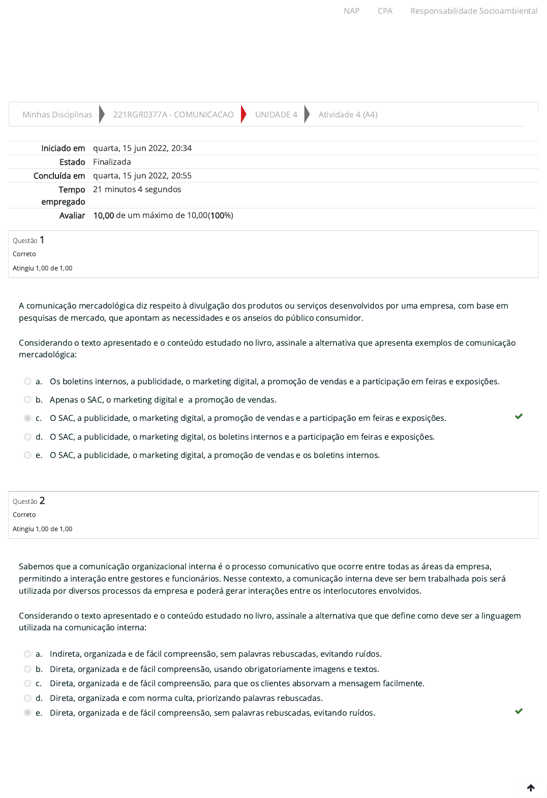Minhas Disciplinas 221RGR0377A - COMUNICACAO UNIDADE 4 Atividade 4 (A4) Iniciado em quarta, 15 jun 2022, 20:34 Estado Finalizada Concluída em quarta, 15 jun 2022, 20:55 Tempo empregado 21 minutos 4 segundos Avaliar 10,00 de um máximo de 10,00(100%) Questão 1 Correto Atingiu 1,00 de 1,00 Questão 2 Correto Atingiu 1,00 de 1,00 A comunicação mercadológica diz respeito à divulgação dos produtos ou serviços desenvolvidos por uma empresa, com base em pesquisas de mercado, que apontam as necessidades e os anseios do público consumidor. Considerando o texto apresentado e o conteúdo estudado no livro, assinale a alternativa que apresenta exemplos de comunicação mercadológica: a. Os boletins internos, a publicidade, o marketing digital, a promoção de vendas e a participação em feiras e exposições. b. Apenas o SAC, o marketing digital e a promoção de vendas. c. O SAC, a publicidade, o marketing digital, a promoção de vendas e a participação em feiras e exposições. d. O SAC, a publicidade, o marketing digital, os boletins internos e a participação em feiras e exposições. e. O SAC, a publicidade, o marketing digital, a promoção de vendas e os boletins internos. Sabemos que a comunicação organizacional interna é o processo comunicativo que ocorre entre todas as áreas da empresa, permitindo a interação entre gestores e funcionários. Nesse contexto, a comunicação interna deve ser bem trabalhada pois será utilizada por diversos processos da empresa e poderá gerar interações entre os interlocutores envolvidos. Considerando o texto apresentado e o conteúdo estudado no livro, assinale a alternativa que que de�ne como deve ser a linguagem utilizada na comunicação interna: a. Indireta, organizada e de fácil compreensão, sem palavras rebuscadas, evitando ruídos. b. Direta, organizada e de fácil compreensão, usando obrigatoriamente imagens e textos. c. Direta, organizada e de fácil compreensão, para que os clientes absorvam a mensagem facilmente. d. Direta, organizada e com norma culta, priorizando palavras rebuscadas. e. Direta, organizada e de fácil compreensão, sem palavras rebuscadas, evitando ruídos. NAP CPA Responsabilidade Socioambiental https://ambienteacademico.com.br/my/ https://ambienteacademico.com.br/course/view.php?id=12244 https://ambienteacademico.com.br/course/view.php?id=12244§ion=5 https://ambienteacademico.com.br/mod/quiz/view.php?id=339816 https://codely-fmu-content.s3.amazonaws.com/Moodle/NAP/inicial/nap/fmu/index.html https://codely-fmu-content.s3.amazonaws.com/Moodle/CPA/landing_CPA/index.html https://portal.fmu.br/sustentabilidade Questão 3 Correto Atingiu 1,00 de 1,00 Questão 4 Correto Atingiu 1,00 de 1,00 No contexto empresarial, a comunicação (oral ou escrita) é necessária para que rumos e posicionamentos sejam estabelecidos. Neste contexto, é importante entendermos sobre a cultura organizacional da empresa e sobre os atores envolvidos no processo de comunicação. Considerando o texto apresentado e o conteúdo estudado no livro, analise as asserções a seguir no que diz respeito aos atores envolvidos na comunicação de uma empresa: I. Colaboradores. II. Clientes. III. Fornecedores. IV. Concorrentes. É correto apenas o que se afirma em: a. I, III e IV. b. I e II. c. I, II e IV. d. I, II e III. e. II, III e IV. De acordo com Chiavenato (2006, p. 142), "[...] a comunicação é a troca de informações entre indivíduos. Signi�ca tornar comum uma mensagem ou informação. Constitui um dos processos fundamentais da experiência humana e da organização social". Em outras palavras, é com a comunicação entre os indivíduos que a sociedade se organiza. A comunicação constitui, portanto, um processo indispensável também para as organizações. Fonte: CHIAVENATO, I. Administração de recursos humanos: fundamentos básicos. 6 ed. São Paulo: Atlas, 2006. Considerando o texto apresentado e o conteúdo estudado no livro, assinale a alternativa que justi�ca porque a comunicação é indispensável para as organizações: a. Porque os clientes precisam estar em contato direto com os colaboradores de uma organização. b. Porque uma organização precisa se relacionar com seus concorrentes para estar interada sobre o mercado. c. Porque os colaboradores em cargo de gestão precisam se relacionar entre si e atribuir sentido ao que falam e escrevem. d. Porque os colaboradores precisam se relacionar entre si e atribuir sentido ao que falam e escrevem. e. Porque os colaboradores precisam se relacionar com seus familiares, mesmo estando no ambiente de trabalho. NAP CPA Responsabilidade Socioambiental https://codely-fmu-content.s3.amazonaws.com/Moodle/NAP/inicial/nap/fmu/index.html https://codely-fmu-content.s3.amazonaws.com/Moodle/CPA/landing_CPA/index.html https://portal.fmu.br/sustentabilidade Questão 5 Correto Atingiu 1,00 de 1,00 Questão 6 Correto Atingiu 1,00 de 1,00 Questão 7 Correto Atingiu 1,00 de 1,00 Com a comunicação institucional, as organizações têm a possibilidade de se desenvolverem e se consolidarem no mercado, além de engajar o público. No entanto, elas precisam ser coerentes com os princípios fundamentais que guiam suas ações. Considerando o texto apresentado e o conteúdo estudado no livro, assinale a alternativa que apresenta os princípios fundamentais de uma empresa: a. Missão, clientes e valores. b. Missão, visão e valores. c. Clientes, visão e valores. d. Missão, visão e clientes. e. Concorrentes, clientes e valores. É perceptível a presença das linguagens na composição da identidade das organizações, o que ressalta ainda mais a importância da comunicação para a cultura corporativa. Ou seja, a comunicação é tida como um fator determinante para a cultura organizacional. Considerando o texto apresentado e o conteúdo estudado no livro, assinale a alternativa que apresenta os tipos de linguagem presentes na comunicação corporativa: a. Linguagem verbal e Linguagem