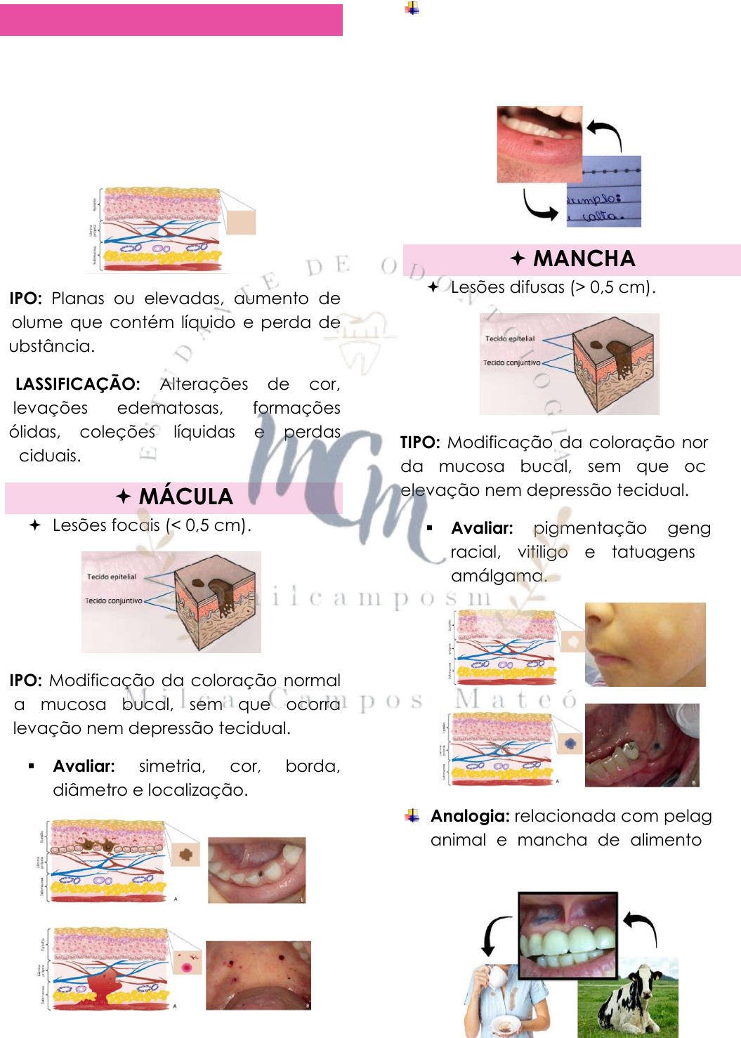 Milca Campos Mateó – SEMIOLOGIA E ESTOMATOLOGIA 1 LESÕES DA MUCOSA ORAL São modificações do tecido normal causadas por processos inflamatórios, degenerativos, circulatórios, neoplásicos, transtornos do metabolismo ou defeitos de formação. TIPO: Planas ou elevadas, aumento de volume que contém líquido e perda de substância. CLASSIFICAÇÃO: Alterações de cor, elevações edematosas, formações sólidas, coleções líquidas e perdas teciduais. MÁCULA Lesões focais (< 0,5 cm). TIPO: Modificação da coloração normal da mucosa bucal, sem que ocorra elevação nem depressão tecidual. ▪ Avaliar: simetria, cor, borda, diâmetro e localização. Analogia: pontos feitos a caneta em um papel. Não há elevação nem depressão, apenas alteração na cor do papel. MANCHA Lesões difusas (> 0,5 cm). TIPO: Modificação da coloração normal da mucosa bucal, sem que ocorra elevação nem depressão tecidual. ▪ Avaliar: pigmentação gengival racial, vitiligo e tatuagens por amálgama. Analogia: relacionada com pelagem animal e mancha de alimento em roupa. Milca Campos Mateó – SEMIOLOGIA E ESTOMATOLOGIA 2 ELEVAÇÕES EDEMATOSAS (FORMAÇÕES SÓLIDAS) CLASSIFICAÇÃO: alteração de cor e/ou que representam crescimentos sólidos. São lesões causadas por edema na lâmina própria ou submucosa. Exemplo: Urticária (angioedema labial). PLACA TIPO: Lesão plana, linear, elevada em relação ao tecido normal, altura menor que base, tamanhos variados, consistência equivalente ao tecido da base. CLASSIFICAÇÃO: Elevações de baixa altura do tecido normal da mucosa, alteração da cor (de rosa avermelhado para um tom esbranquiçado), a superfície pode apresentar aspecto rugoso, liso, ondulada, verrugosa, ou todos eles. RELACIONADA: Leucoplasia, Líquen Plano, Carcinomas Epidermóides, Candidíase Pseudomembranosa, Ceratose Friccional, Sífilis Secundária e Mordiscamento Crônico. ▪ Avaliar: número, superfície, cor e localização. Analogia: passar uma quantidade de cola branca na pele e esperar secar, formando uma película mais elevada que a pele. Eritroplasia: placas vermelhas, podem indicar lesão pré- cancerígenas. Leucoplasia: placas brancas, podem indicar lesões pré- cancerígenas. PÁPULA TIPO: Lesões superficiais, bem delimitadas, consistência firme ou amolecida, únicas ou múltiplas, vários formatos, facilmente detectável, coloração variada. CLASSIFICAÇÃO: pequenas dimensões (< 0,5 cm), coloração rósea, avermelhada, acastanhada ou amarelada, elevação circunscrita e sólida provocada por infiltração da camada superficial da Milca Campos Mateó – SEMIOLOGIA E ESTOMATOLOGIA 3 derme e pela hiperplasia dos seus elementos estruturais. Analogia: associar a pápula com a pele do sapo, que tem o aspecto de pequenas pápulas sólidas. NÓDULOS TIPO: Lesões circunscritas e elevadas, isolados, agrupados ou aderidos, consistência firme, elástica ou mole, facilmente detectáveis à palpação, formado de tecido epitelial, conjuntivo ou misto CLASSIFICAÇÃO: Elevação de consistência fibrosa ou sólida, superficial ou profunda (> 0,5 cm e < 3 cm), mesma cor da mucosa, branca, amarela, vermelha ou arroxeada, pode se desenvolver em diferentes órgãos no corpo. ▪ Avaliar: consistência, base, cor, áreas vermelhas ou ulceradas. Analogia: com bolas de gude que são sólidas e de tamanho mediano. TUMOR TIPO: Massa sólida de tecido (> 3 cm) que se estende em profundidade. RELACIONADA: Neoplasias, processos de crescimento tecidual não-neoplásico e sinal cardinal de inflamação. Analogia: comparados a icebergs uma vez que muitas vezes se estendem em profundidade, sendo possível ver na superfície apenas uma pequena porção do seu tamanho, como nas neoplasias. ELEVAÇÕES EDEMATOSAS (FORMAÇÕES LÍQUIDAS) Lesão com conteúdo líquido, bem delimitadas e elevadas. VESÍCULAS TIPO: Elevação com conteúdo líquido no interior do epitélio ou abaixo (< 3 mm). Milca Campos Mateó – SEMIOLOGIA E ESTOMATOLOGIA 4 CLASSIFICAÇÃO: Ocorre rompimento e posterior ulceração e formação de crosta, observada como herpes recorrente e varicela (catapora). ▪ Avaliar: número, localização, ocorrência prévia, lesões semelhantes em outras áreas do corpo e trauma prévio. Analogia: comparar a lesão localizada na região acima do lábio superior do paciente ilustrando sua semelhança à framboesa. BOLHAS TIPO: Líquido que se forma sob uma camada fina de pele morta, mistura de água e proteínas, que exsuda do tecido danificado. CLASSIFICAÇÃO: Resposta a uma lesão específica, como queimadura ou uma irritação, envolvem apenas a camada superior da pele e surgem como parte de uma doença sistêmica que podem começar nas camadas mais profundas da pele e áreas extensas. ▪ Avaliar: número, localização, ocorrência prévia, lesões semelhantes em outras áreas do corpo e trauma prévio. Analogia: com a superfície do pastel frito. PÚSTULA TIPO: Vesícula ou bolha com conteúdo purulento. CLASSIFICAÇÃO: Elevação que contém exsudado purulento, com menos de 1 cm. Analogia: comparando a pequenas uvas que ao serem apertadas se rompem. Milca Campos Mateó – SEMIOLOGIA E ESTOMATOLOGIA 5 HEMATOMA TIPO: Fenômeno hemorrágico com morfologia de uma cavidade com sangue no interior. CLASSIFICAÇÃO: Lesão secundária ao extravasamento de sangue no tecido conjuntivo, após trauma, podendo apresentar vários tamanhos. Analogia: comparado a uma mancha de machucado. ABSCESSO TIPO: Lesão purulenta dentro de uma cavidade tecidual, flutuante, circunscrita ou não, com tamanhos variáveis, localizado na lâmina própria, submucosa ou subcutânea. CLASSIFICAÇÃO: Um cisto de tamanho variável que abriga em seu interior pus e outros resíduos da atividade do corpo humano. Analogia: um abcesso e sua comparação a um Petit-Gateau. CISTO TIPO: Cápsula de tecido conjuntivo revestido internamente por epitélio e contendo no seu interior líquido, revestidas de