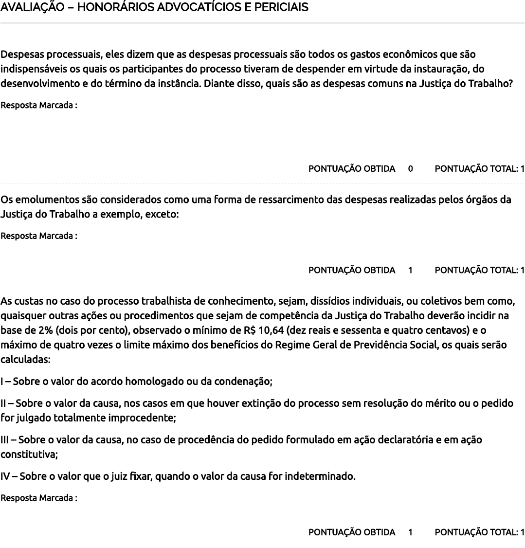 AVALIAÇÃO – HONORÁRIOS ADVOCATÍCIOS E PERICIAIS PONTUAÇÃO TOTAL: 1PONTUAÇÃO OBTIDA 0 Despesas processuais, eles dizem que as despesas processuais são todos os gastos econômicos que são indispensáveis os quais os participantes do processo tiveram de despender em virtude da instauração, do desenvolvimento e do término da instância. Diante disso, quais são as despesas comuns na Justiça do Trabalho? Resposta Marcada : Custas; honorários do perito; do assistente técnico e do advogado; os emolumentos; as diárias de testemunhas; as multas impostas pelo juiz e todos os demais gastos realizados pelos participantes da relação processual; honorários dos assistentes técnicos. PONTUAÇÃO TOTAL: 1PONTUAÇÃO OBTIDA 1 Os emolumentos são considerados como uma forma de ressarcimento das despesas realizadas pelos órgãos da Justiça do Trabalho a exemplo, exceto: Resposta Marcada : Assistentes técnicos. PONTUAÇÃO TOTAL: 1PONTUAÇÃO OBTIDA 1 As custas no caso do processo trabalhista de conhecimento, sejam, dissídios individuais, ou coletivos bem como, quaisquer outras ações ou procedimentos que sejam de competência da Justiça do Trabalho deverão incidir na base de 2% (dois por cento), observado o mínimo de R$ 10,64 (dez reais e sessenta e quatro centavos) e o máximo de quatro vezes o limite máximo dos benefícios do Regime Geral de Previdência Social, os quais serão calculadas: I – Sobre o valor do acordo homologado ou da condenação; II – Sobre o valor da causa, nos casos em que houver extinção do processo sem resolução do mérito ou o pedido for julgado totalmente improcedente; III – Sobre o valor da causa, no caso de procedência do pedido formulado em ação declaratória e em ação constitutiva; IV – Sobre o valor que o juiz �xar, quando o valor da causa for indeterminado. Resposta Marcada : Todas as alternativas estão corretas. PONTUAÇÃO TOTAL: 1PONTUAÇÃO OBTIDA 1 A respeito do processo de execução das custas processuais diz o art. 789-A da CLT que no processo de execução são devidas custas, sempre de responsabilidade do executado e pagas ao �nal, as custas devidas no processo de execução: I – Autos de arrematação, de adjudicação e de remição. II – Atos dos o�ciais de justiça, por diligência certi�cada: em zona urbana. III – Agravo de instrumento. IV – Agravo de petição. V – Embargos à execução. Resposta Marcada : Todas as alternativas estão corretas. PONTUAÇÃO TOTAL: 1PONTUAÇÃO OBTIDA 1 São isentos do pagamento de quaisquer das despesas processuais são isentos do pagamento de quaisquer despesas processuais, exceto: Resposta Marcada : Todas as pessoas. PONTUAÇÃO TOTAL: 1PONTUAÇÃO OBTIDA 1 Quanto ao benefício da Justiça Gratuita o art. 5º, inciso XXXV da CF/88, culminado com o art. 99 do CPC de acordo com o que se expõe: I – O pedido de gratuidade da justiça pode ser formulado na petição inicial, na contestação, na petição para ingresso de terceiro no processo ou em recurso: II – O juiz somente poderá indeferir o pedido se houver nos autos elementos que evidenciem a falta dos pressupostos legais para a concessão de gratuidade, devendo, antes de indeferir o pedido, determinar à parte a comprovação do preenchimento dos referidos pressupostos (CPC, art. 99, § 2s); III – Presume-se verdadeira a alegação de insu�ciência deduzida exclusivamente por pessoa natural (CPC, art. 99, § 3a); IV – A assistência do requerente por advogado particular não impede a concessão de gratuidade da justiça (CPC, art. 99, § 4s). Neste caso, o recurso que verse exclusivamente sobre valor de honorários de sucumbência �xados em favor do advogado de bene�ciário estará sujeito a preparo, salvo se o próprio advogado demonstrar que tem direito à gratuidade (CPC, art. 99, § 5s); V – O direito à gratuidade da justiça não é pessoal, se estendendo a litisconsorte ou a sucessor do bene�ciário, salvo requerimento e deferimento expressos (CPC, art. 99, § 6s); VI – Não havendo a concessão de gratuidade da justiça em recurso, o recorrente estará dispensado de comprovar o recolhimento do preparo, incumbindo ao relator, neste caso, apreciar o requerimento e, se indeferi-lo, �xar prazo para realização do recolhimento. Resposta Marcada : Apenas as alternativas I, II, III, e IV estão corretas e a V e VI estão incorretas. 8 / 10 PONTUAÇÃO TOTAL: 1PONTUAÇÃO OBTIDA 0 Quanto ao pagamento dos honorários periciais, marque a alternativa correta: Resposta Marcada : A responsabilidade pelo pagamento dos honorários periciais é da parte que requereu a perícia, ainda que bene�ciária da justiça gratuita. PONTUAÇÃO TOTAL: 1PONTUAÇÃO OBTIDA 1 O art. 85 prevê então em quais situações, serão devidos os honorários advocatícios cumulativamente, são eles: Resposta Marcada : Todas as alternativas estão corretas. PONTUAÇÃO TOTAL: 1PONTUAÇÃO OBTIDA 1 Os honorários devem ser �xados pelo juiz, caso a decisão transitada em julgado seja omissa quanto ao direito aos honorários ou ao seu valor: Resposta Marcada : É cabível ação autônoma para sua de�nição e cobrança. PONTUAÇÃO TOTAL: 1PONTUAÇÃO OBTIDA 1 Os honorários na Justiça do Trabalho são arbitrados, exceto: Resposta Marcada : Honorários não assistenciais. Total