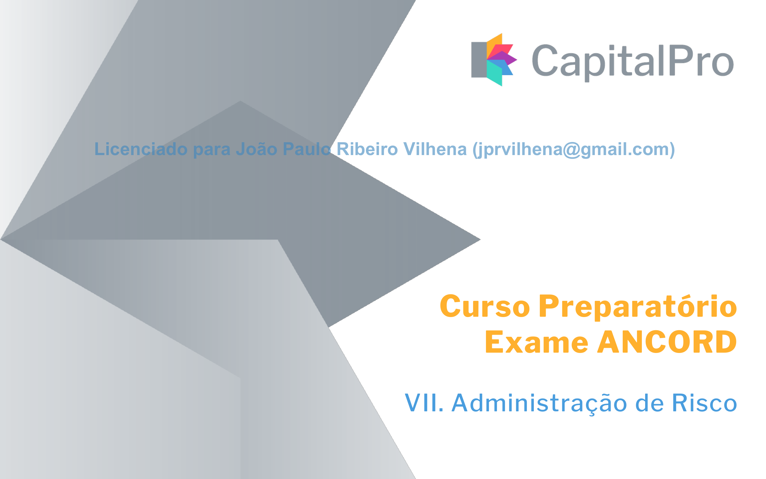 Curso Preparatório Exame ANCORD VII. Administração de Risco Licenciado para João Paulo Ribeiro Vilhena (jprvilhena@gmail.com) © Material de propriedade da CapitalPro – Instituto Capital de Qualificação Profissional Slide 2 1. Conceito e Tipos de Risco Risco: probabilidade de um dano se concretizar Em geral, tem relação direta com a rentabilidade de um investimento: quanto maior o risco, maior o retorno Rentabilidade absoluta x Rentabilidade relativa (índice de referência) Rentabilidade observada (relacionada ao passado) x Rentabilidade esperada (representa uma expectativa de retorno) Licenciado para João Paulo Ribeiro Vilhena (jprvilhena@gmail.com) © Material de propriedade da CapitalPro – Instituto Capital de Qualificação Profissional Slide 3 1. Conceito e Tipos de Risco (cont.) Tipos de risco Risco de crédito: possíveis perdas pelo não pagamento (total ou parcial) por parte do devedor (aplicações em ações não possuem esse risco) Risco de liquidez: dificuldade em negociar um ativo pelo preço “justo” e no momento desejado; é a facilidade de converter um ativo em dinheiro Risco de mercado: potencial oscilação dos valores de um ativo em um período de tempo; relação com a volatilidade Risco operacional: perdas financeiras decorrentes de falhas ou inadequação de pessoas, processos e sistemas Licenciado para João Paulo Ribeiro Vilhena (jprvilhena@gmail.com) © Material de propriedade da CapitalPro – Instituto Capital de Qualificação Profissional Slide 4 Na Prática! (VII) 1. Em geral, investimentos com maiores retornos apresentam (a) Menores prazos de vencimento. (b) Maior liquidez. (c) Maiores riscos. (d) Menores valores de aplicação. Resposta correta: (c). O risco de um investimento normalmente tem relação com seu retorno, sendo que quanto maior o risco, maior o retorno. Licenciado para João Paulo Ribeiro Vilhena (jprvilhena@gmail.com) © Material de propriedade da CapitalPro – Instituto Capital de Qualificação Profissional Slide 5 Na Prática! (VII) 2. O risco de liquidez presente nos títulos é o decorrente de (a) Muitos compradores para o título, e que não querem pagar o preço justo. (b) Poucos compradores para o título, e que não querem pagar o preço justo. (c) Possibilidade de o emissor do título não cumprir suas obrigações. (d) Variações de preço que ocorrem ao longo do tempo. Resposta correta: (b). O risco de liquidez está relacionado à dificuldade em negociar um título no momento e pelo preço desejados. Licenciado para João Paulo Ribeiro Vilhena (jprvilhena@gmail.com) © Material de propriedade da CapitalPro – Instituto Capital de Qualificação Profissional Slide 6 Na Prática! (VII) 3. Quanto menor o prazo de um título de renda fixa (a) Seu risco de mercado tenderá a ser menor. (b) Seu risco de crédito tenderá a ser maior. (c) Sua liquidez tenderá a ser maior. (d) Sua rentabilidade esperada tenderá a ser maior. Resposta correta: (a). O risco de mercado de um título está relacionado à oscilação dos seus valores em um período de tempo. Quanto menor esse período, menor tende a ser o potencial de oscilação dos valores. Licenciado para João Paulo Ribeiro Vilhena (jprvilhena@gmail.com) © Material de propriedade da CapitalPro – Instituto Capital de Qualificação Profissional Slide 7 2. Diversificação de Carteiras Diversificação: técnica de administração de risco que oferece o potencial de redução de riscos por meio da alocação de investimentos entre vários instrumentos, setores ou categorias Risco sistemático (não diversificável): risco que tem sua origem em fatores comuns a todo o mercado (ou a um segmento do mercado) Risco não-sistemático (diversificável ou específico): risco que tem sua origem em características específicas do ativo A diversificação de uma carteira reduz apenas o risco não-sistemático Licenciado para João Paulo Ribeiro Vilhena (jprvilhena@gmail.com) © Material de propriedade da CapitalPro – Instituto Capital de Qualificação Profissional Slide 8 2. Diversificação de Carteiras (cont.) Risco total da carteira Risco não- sistemático Risco sistemático (risco de mercado) 1 ativo 20 ativos Número de ativos Licenciado para João Paulo Ribeiro Vilhena (jprvilhena@gmail.com) © Material de propriedade da CapitalPro – Instituto Capital de Qualificação Profissional Slide 9 Na Prática! (VII) 4. A diversificação de uma carteira permite (a) A eliminação total dos riscos. (b) A obtenção de maiores retornos. (c) A eliminação do risco sistemático. (d) Uma melhor relação entre risco e retorno. Resposta correta: (d). A diversificação de uma carteira permite que os riscos sejam reduzidos devido à alocação dos recursos em aplicações diversas. Licenciado para João Paulo Ribeiro Vilhena (jprvilhena@gmail.com) © Material de propriedade da CapitalPro – Instituto Capital de Qualificação Profissional Slide 10 Na Prática! (VII) 5. O risco total de um ativo (a) Depende do risco não sistemático, que é igual para todas as empresas. (b) Depende do risco não sistemático, que está ligado a fatores específicos da empresa. (c) Depende do risco sistemático, que está ligado a fatores específicos da empresa. (d) Depende do risco não sistemático, que está ligado a fatores gerais do mercado e da economia. Resposta correta: (b). O risco não sistemático, ou específico, tem origem em características específicas do ativo. Licenciado para João Paulo Ribeiro Vilhena (jprvilhena@gmail.com) © Material de propriedade da CapitalPro – Instituto Capital de Qualificação Profissional Slide 11 3. Conceito e Características do VAR VAR (Value at Risk ou Valor em Risco): técnica estatística utilizada para medir o nível de risco financeiro em uma firma ou em uma carteira de ativos, por um período de tempo específico, dado um nível de confiança Exemplo: pode-se afirmar que o VAR de determinada carteira, para um dia e com 95% de confiança