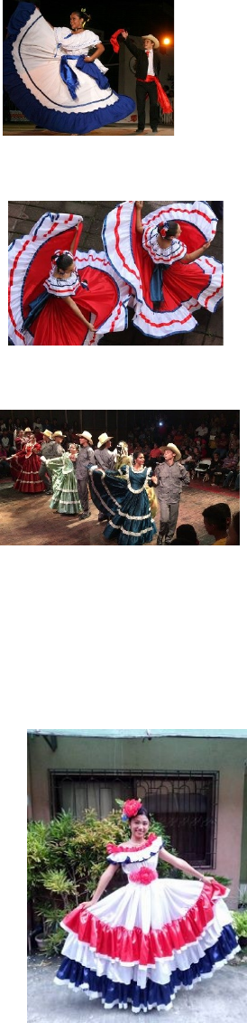 Danças típicas de costa rica Punto Guanacasteco: Manoel e Heloisa · Origem: Guanacaste, região norte da Costa Rica. · Características: Dança de cortejo que retrata uma história de amor. É conhecida por seus movimentos elegantes e graciosos. · Instrumentos: Marimba (instrumento de percussão), guitarras, violinos e às vezes acordeões. Tambito: · Origem: Espanhola, com influências indígenas e africanas. · Características: Dança folclórica animada, geralmente dançada em pares. É marcada por sapateados e movimentos rápidos dos pés. · Instrumentos: Guitarras, marimba, acordeão, tambores. · Mazurca Criolla: · Origem: Influências europeias, especialmente da mazurca polonesa. · Características: Dança de salão adaptada ao estilo folclórico costarriquenho. Tem um ritmo moderado e é dançada em pares. · Instrumentos: Instrumentos de corda (violino, guitarra), acordeão. Valéria e Rhayka Os trajes típicos da Costa Rica são uma parte integral das suas danças e tradições culturais, refletindo a diversidade e a história da nação. Aqui estão alguns detalhes sobre os trajes típicos utilizados nas danças tradicionais costarriquenhas: Traje Feminino: · Saia: Longa, ampla e colorida, com babados e fitas. · Blusa: Branca, com mangas curtas ou longas e detalhes coloridos. · Acessórios: Flores no cabelo, brincos grandes, colares de contas. · Sapatos: Confortáveis para dançar. Traje Masculino: · Camisa: Branca ou colorida, de manga longa com bordados. · Calças: Compridas, geralmente brancas ou de cores vivas. · Acessórios: Chapéu de palha, lenço colorido ao redor do pescoço. · Sapatos: Confortáveis para dança image1.jpeg image2.jpeg image3.jpeg image4.jpg