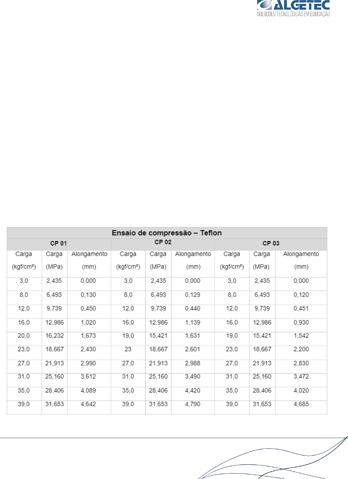 LABORATÓRIO DE ESTRUTURAS ENSAIO DE COMPRESSÃO 1 ALGETEC – SOLUÇÕES TECNOLÓGICAS EM EDUCAÇÃO CEP: 40260-215 Fone: 71 3272-3504 E-mail: contato@algetec.com.br | Site: www.algetec.com.br Bruno Dutra da Silva AVALIAÇÃO DOS RESULTADOS Ensaio de Compressão 1. Crie uma tabela semelhante à apresentada abaixo para cada um dos materiais. Anote os valores da carga e alongamento sofrido pelo corpo, para intervalos de 5 kgf/cm². Note que a carga é dada pelo manômetro em kgf/cm² e a unidade requerida para a análise dos dados é MPa. Converta os valores obtidos no experimento utilizando a relação abaixo. 1kgf/cm² = 0.098067 Mpa mailto:contato@algetec.com.br http://www.algetec.com.br/ LABORATÓRIO DE ESTRUTURAS ENSAIO DE COMPRESSÃO CEP: 40260-215 Fone: 71 3272-3504 E-mail: contato@algetec.com.br | Site: www.algetec.com.br mailto:contato@algetec.com.br http://www.algetec.com.br/ LABORATÓRIO DE ESTRUTURAS ENSAIO DE COMPRESSÃO CEP: 40260-215 Fone: 71 3272-3504 E-mail: contato@algetec.com.br | Site: www.algetec.com.br mailto:contato@algetec.com.br http://www.algetec.com.br/ LABORATÓRIO DE ESTRUTURAS ENSAIO DE COMPRESSÃO CEP: 40260-215 Fone: 71 3272-3504 E-mail: contato@algetec.com.br | Site: www.algetec.com.br mailto:contato@algetec.com.br http://www.algetec.com.br/ LABORATÓRIO DE ESTRUTURAS ENSAIO DE COMPRESSÃO CEP: 40260-215 Fone: 71 3272-3504 E-mail: contato@algetec.com.br | Site: www.algetec.com.br ALGETEC – SOLUÇÕES TECNOLÓGICAS EM EDUCAÇÃO 8 2. Utilizando os dados das tabelas criadas, construa o gráfico “Tensão (MPa) x Deformação” para o material ensaiado mailto:contato@algetec.com.br http://www.algetec.com.br/ LABORATÓRIO DE ESTRUTURAS ENSAIO DE COMPRESSÃO CEP: 40260-215 Fone: 71 3272-3504 E-mail: contato@algetec.com.br | Site: www.algetec.com.br 3. Com base nos gráficos construídos, realize os cálculos do módulo de elasticidade e tensão de compressão para os materiais ensaiados. mailto:contato@algetec.com.br http://www.algetec.com.br/ LABORATÓRIO DE ESTRUTURAS ENSAIO DE COMPRESSÃO CEP: 40260-215 Fone: 71 3272-3504 E-mail: contato@algetec.com.br | Site: www.algetec.com.br AVALIAÇÃO DOS RESULTADOS Ensaio de Torção 1. Crie uma tabela semelhante à apresentada abaixo para cada um dos materiais. Anote os valores do momento para cada variação de ângulo apresentada pelos corpos de prova. 2. Utilizando os dados das tabelas acima e as equações apresentadas no sumário teórico, calcule os valores de tensão e de deformação cisalhantes nos corpos de prova. Crie uma tabela semelhante à Tabela 2 para cada um dos materiais ensaiados e anote os valores calculados. mailto:contato@algetec.com.br http://www.algetec.com.br/ LABORATÓRIO DE ESTRUTURAS ENSAIO DE COMPRESSÃO CEP: 40260-215 Fone: 71 3272-3504 E-mail: contato@algetec.com.br | Site: www.algetec.com.br 3. Utilizando os dados das tabelas acima, construa o gráfico “Tensão (MPa) x Deformação (ɣ)” para cada material ensaiado. mailto:contato@algetec.com.br http://www.algetec.com.br/ LABORATÓRIO DE ESTRUTURAS ENSAIO DE COMPRESSÃO CEP: 40260-215 Fone: 71 3272-3504 E-mail: contato@algetec.com.br | Site: www.algetec.com.br Grafico 2 – Ferro Fundido 4. Com base nos gráficos construídos, determine os valores do módulo de elasticidade, limite de escoamento e o limite de resistência à torção de cada material ensaiado. mailto:contato@algetec.com.br http://www.algetec.com.br/ LABORATÓRIO DE ESTRUTURAS ENSAIO DE COMPRESSÃO CEP: 40260-215 Fone: 71 3272-3504 E-mail: contato@algetec.com.br | Site: www.algetec.com.br mailto:contato@algetec.com.br http://www.algetec.com.br/