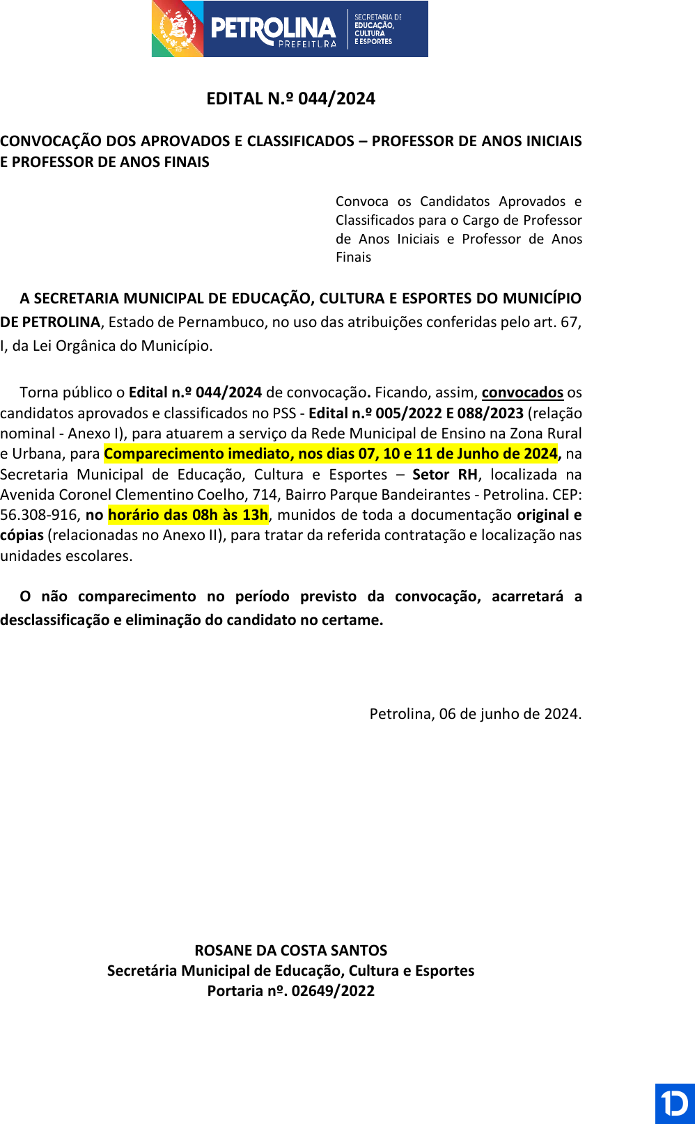 EDITAL N.º 044/2024 CONVOCAÇÃO DOS APROVADOS E CLASSIFICADOS – PROFESSOR DE ANOS INICIAIS E PROFESSOR DE ANOS FINAIS Convoca os Candidatos Aprovados e Classificados para o Cargo de Professor de Anos Iniciais e Professor de Anos Finais A SECRETARIA MUNICIPAL DE EDUCAÇÃO, CULTURA E ESPORTES DO MUNICÍPIO DE PETROLINA, Estado de Pernambuco, no uso das atribuições conferidas pelo art. 67, I, da Lei Orgânica do Município. Torna público o Edital n.º 044/2024 de convocação. Ficando, assim, convocados os candidatos aprovados e classificados no PSS - Edital n.º 005/2022 E 088/2023 (relação nominal - Anexo I), para atuarem a serviço da Rede Municipal de Ensino na Zona Rural e Urbana, para Comparecimento imediato, nos dias 07, 10 e 11 de Junho de 2024, na Secretaria Municipal de Educação, Cultura e Esportes – Setor RH, localizada na Avenida Coronel Clementino Coelho, 714, Bairro Parque Bandeirantes - Petrolina. CEP: 56.308-916, no horário das 08h às 13h, munidos de toda a documentação original e cópias (relacionadas no Anexo II), para tratar da referida contratação e localização nas unidades escolares. O não comparecimento no período previsto da convocação, acarretará a desclassificação e eliminação do candidato no certame. Petrolina, 06 de junho de 2024. ROSANE DA COSTA SANTOS Secretária Municipal de Educação, Cultura e Esportes Portaria nº. 02649/2022 A ss in ad o po r 1 pe ss oa : R O S A N E D A C O S T A S A N T O S P ar a ve rif ic ar a v al id ad e da s as si na tu ra s, a ce ss e ht tp s: //p et ro lin a. 1d oc .c om .b r/ ve rif ic ac ao /5 F 7E -8 90 7- 5C 14 -3 5C 2 e in fo rm e o có di go 5 F 7E -8 90 7- 5C 14 -3 5C 2 ANEXO I - CONVOCAÇÃO DOS APROVADOS E CLASSIFICADOS PROFESSOR DE ANOS INICIAIS - IRRIGADO I - EDITAL N° 088/2023 N FUNÇÃO NOME CLASS 1 Prof. Subst. Ensino Fundamental - Anos Iniciais - Irrigado I - AC+CR FRANCINETE SOUZA SANTOS DA SILVA 13º 2 Prof. Subst. Ensino Fundamental - Anos Iniciais - Irrigado I - AC+CR IANDRA COELHO NEGREIRO 14º 3 Prof. Subst. Ensino Fundamental - Anos Iniciais - Irrigado I - AC+CR JULIANA VIEIRA DE ALENCAR RIBEIRO 15º 4 Prof. Subst. Ensino Fundamental - Anos Iniciais - Irrigado I - AC+CR FRANCIENE ARAQUAM DE SOUZA SILVA 16º 5 Prof. Subst. Ensino Fundamental - Anos Iniciais - Irrigado I - AC+CR NAIANY MISAELA GOMES DA SILVA 17º PROFESSOR DE ANOS INICIAIS - IRRIGADO II - EDITAL N° 088/2023 N FUNÇÃO NOME CLASS 1 Prof. Subst. Ensino Fundamental - Anos Iniciais - Irrigado II - AC+CR FLAVIANA LIMA DE CASTRO 11º 2 Prof. Subst. Ensino Fundamental - Anos Iniciais - Irrigado II - AC+CR FABILENY NUNES DA SILVA AGUIA 12º 3 Prof. Subst. Ensino Fundamental - Anos Iniciais - Irrigado II - AC+CR ANDREA MONIELE OLIVEIRA DA SILVA 13º 4 Prof. Subst. Ensino Fundamental - Anos Iniciais - Irrigado II - AC+CR KAROLINE SILVA SANTOS 14º PROFESSOR DE ANOS INICIAIS - SEDE - EDITAL N° 005/2022 N FUNÇÃO NOME CLASS 1 Prof.Ensino Fundamental - Anos Iniciais - Sede - CR VIIRGINIA KATIANE MORAIS PEREIRA 238º 2 Prof.Ensino Fundamental - Anos Iniciais - Sede - CR ALDA NUNES SILVA DE ALENCAR 239º 3 Prof.Ensino Fundamental - Anos Iniciais - Sede - CR IARA JAQUELINE DOS SANTOS 240º 4 Prof.Ensino Fundamental - Anos Iniciais - Sede - CR CLECIANE DOS SANTOS 241º 5 Prof.Ensino Fundamental - Anos Iniciais - Sede - CR LUCIANA RODRIGUES DA CUNHA 242º 6 Prof.Ensino Fundamental - Anos Iniciais - Sede - CR FERNANDA CARDOSO VIANA COELHO 243º 7 Prof.Ensino Fundamental - Anos Iniciais - Sede - CR GISLENE RODRIGUES SOARES 244º 8 Prof.Ensino Fundamental - Anos Iniciais - Sede - CR SIMONE MARIA LUSTOSA LOPES 245º A ss in ad o po r 1 pe ss oa : R O S A N E D A C O S T A S A N T O S P ar a ve rif ic ar a v al id ad e da s as si na tu ra s, a ce ss e ht tp s: //p et ro lin a. 1d oc .c om .b r/ ve rif ic ac ao /5 F 7E -8 90 7- 5C 14 -3 5C 2 e in fo rm e o có di go 5 F 7E -8 90 7- 5C 14 -3 5C 2 9 Prof.Ensino Fundamental - Anos Iniciais - Sede - CR MARIA CLAUDIA DE SOUZA 246º 10 Prof.Ensino Fundamental - Anos Iniciais - Sede - CR SOCORRO DANIELLE LUSTOSA FURTADO 247º 11 Prof.Ensino Fundamental - Anos Iniciais - Sede - CR PATRICIA COSME DA SILVA 248º 12 Prof.Ensino Fundamental - Anos Iniciais - Sede - CR ELZA MARIA DE ANDRADE COUTINHO 249º PROFESSOR DE ANOS INICIAIS - SEDE - EDITAL N° 088/2023 N FUNÇÃO NOME CLASS 1 Prof. Subst. Ensino Fundamental - Anos Iniciais - Sede - CR LUCILENE VIEIRA DA SILVA 1º 2 Prof. Subst. Ensino Fundamental - Anos Iniciais - Sede - CR MARIA APARECIDA RODRIGUES DE OLIVEIRA 2º 3 Prof. Subst. Ensino Fundamental - Anos Iniciais - Sede - CR YANCA VITORIA ANTUNES DE SOUZA 3º 4 Prof. Subst. Ensino Fundamental - Anos Iniciais - Sede - CR IANNE LETICIA DOS SANTOS COELHO 4º 5 Prof. Subst. Ensino Fundamental - Anos Iniciais - Sede - CR WIVIANA RICHELMA DE SOUZA LEITE 5º 6 Prof. Subst. Ensino Fundamental - Anos Iniciais - Sede - CR ADRIANA GOMES DOS SANTOS 6º 7 Prof. Subst. Ensino Fundamental - Anos Iniciais - Sede - CR NUBIA DE SOUSA LEITE 7º 8 Prof. Subst. Ensino Fundamental - Anos Iniciais - Sede - CR ROSANGELA PEREIRA GOMES 8º 9 Prof. Subst. Ensino Fundamental - Anos Iniciais - Sede - CR GRACIELA CIMA FERREIRA DOS SANTOS 9º 10 Prof. Subst. Ensino Fundamental - Anos Iniciais - Sede - CR ADOLF NASCIMENTO BEZERRA DA SILVA 10º 11 Prof. Subst. Ensino Fundamental - Anos Iniciais - Sede - CR HELLEN JULIANE LIVIO MENEZES 11º 12 Prof. Subst. Ensino Fundamental - Anos Iniciais - Sede - CR VERENA LUENA DOS SANTOS RODRIGUES 12º 13 Prof. Subst. Ensino Fundamental - Anos Iniciais - Sede - CR MARIA WANDERLY DOS SANTOS SILVA 13º 14 Prof. Subst. Ensino Fundamental - Anos Iniciais - Sede - CR MARCIO GREIC SABINO DA SILVA 14º 15 Prof. Subst. Ensino Fundamental - Anos Iniciais - Sede - CR AISTON FERREIRA GONCALVES 15º 16 Prof. Subst. Ensino Fundamental - Anos Iniciais - Sede - CR BIANCA MOTA AMORIM ARAUJO 16º 17 Prof. Subst. Ensino Fundamental - Anos Iniciais - Sede - CR MARINALVA VIEIRA DA SILVA 17º 18 Prof. S