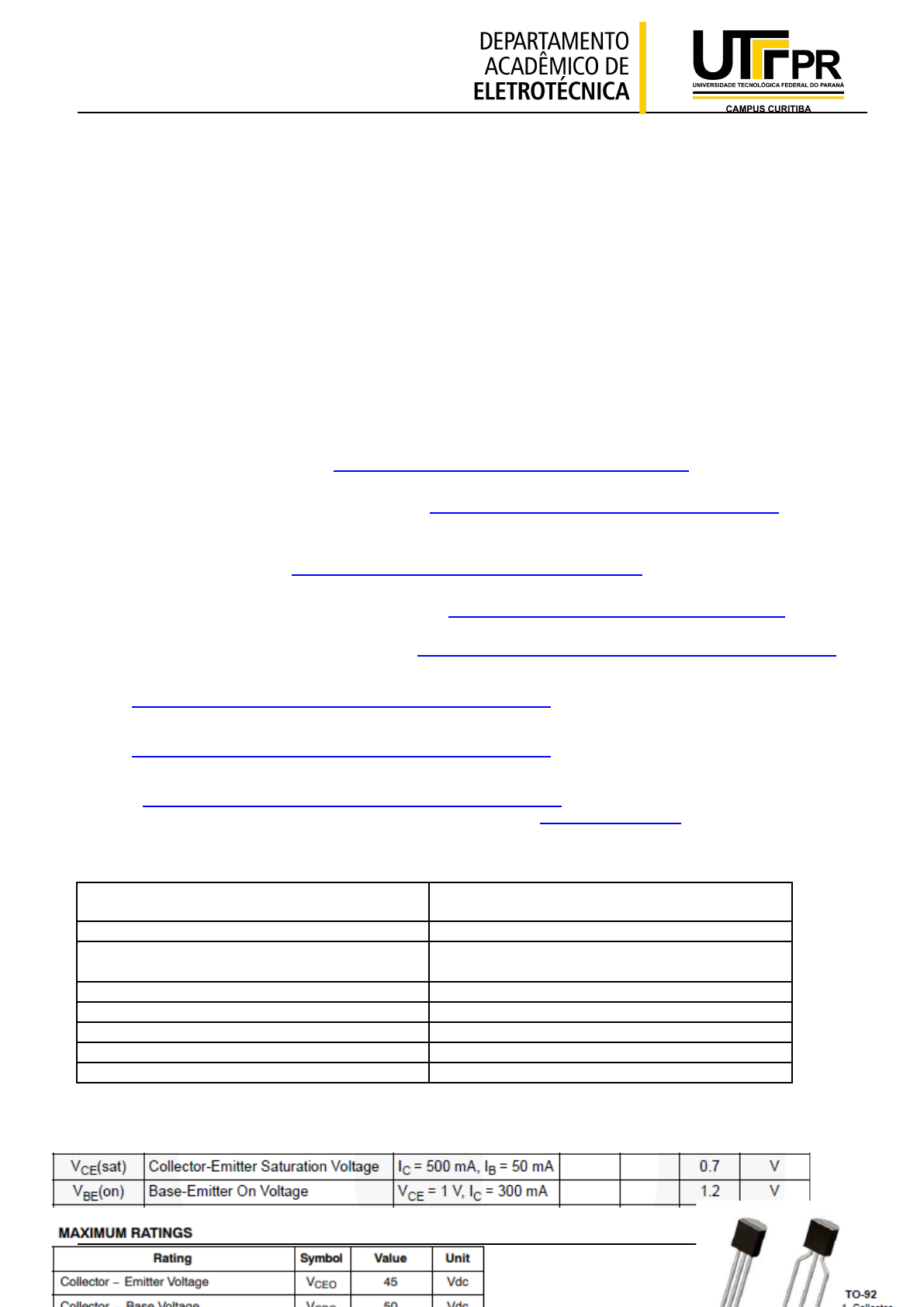 Universidade Tecnológica Federal do Paraná Departamento Acadêmico de Eletrotécnica Engenharias Laboratório de Eletrônica 1 – ET74C Prof.ª Elisabete Nakoneczny Moraes ROTEIRO-RELATÓRIO LAB08-OPERAÇÃO DO TJB COMO CHAVE 2 1. Objetivo: Verificar e identificar as características de funcionamento do TJB como chave na região de corte e saturação. A polarização empregada é por divisor de tensão, ativado pelo uso de sensor de luminosidade, o LDR (light dependent resistor) para a ativação de uma carga. 1.1. Sedimentar os conhecimentos sobre a identificação dos terminais do TBJ, níveis de tensão entre as junções BE e BC para operação do TJB como chave pelo uso do sensor de luz, o LDR. 1.2. Verificar as características elétricas do LDR em função da luminosidade. 1.3. Identificar como a variação da resistência elétrica ocorre em um potenciômetro pelo seu emprego no circuito de controle de ajuste do nível de luminosidade que ativa/desativa o corte/saturação. 1.4. Uso do relé eletromecânico para ativar carga em corrente alternada. Este objetivo é dependente do desempenho das equipes na realização das atividades práticas anteriormente previstas. 2. Referencial teórico: Vídeo contendo a operação do TBJ com o uso do LDR. Transistor 2 superb automatic light ON OFF use LDR, without relay 5’50 em https://www.youtube.com/watch?v=TT710RNuX_0 2.1. Vídeo sobre relés eletromecânicos. Relés- O que são – Teoria, como testar, tipos e prática! Canal Electrolab. Duração 20’38. Disponível https://www.youtube.com/watch?v=DeIUvPtdqEA. Acesso em 02/05/2022. 2.2. Vídeo sobre termistores: NTC e PTC. O básico sobre termistores NTC e PTC . Canal WRkits. Duração 10’20. Disponível em https://www.youtube.com/watch?v=YvkNeQoxnDI. Acesso em 02/05/2022. 2.3. Vídeo sobre diodo de roda livre ou flyback. A real função do diodo em paralelo com relés e motores. Canal WRkits. Duração 9’16. Disponível em https://www.youtube.com/watch?v=0PCsef9llX8. Acesso em 02/05/2022. 2.4. Teoria transistor livro online Malvino cap 6, 7ª edição: https://integrada.minhabiblioteca.com.br/reader/books/9788580550504/pageid/198 2.5. MARQUES, Ângelo.Eduardo. B.; CRUZ, Eduardo.Cesar. A.; JR., Salomão. C. Dispositivos Semicondutores: Diodos e Transistores. Capítulo 7. Disponível em: https://integrada.minhabiblioteca.com.br/reader/books/9788536518374/pageid/133 2.6. MALVINO, Albert.; BATES, David. Eletrônica - V1. Grupo A, 2016. 9788580555776. Disponível em: https://integrada.minhabiblioteca.com.br/#/books/9788580555776/. Acesso em: 01 nov. 2021. https://integrada.minhabiblioteca.com.br/reader/books/9788580555776/pageid/255 2.7. FRANCO, Sergio. Projetos de Circuitos Analógicos. Grupo A, 2016. 9788580555530. Disponível em: https://integrada.minhabiblioteca.com.br/#/books/9788580555530/. Acesso em: 01 nov. 2021. Capítulo 2 em: https://integrada.minhabiblioteca.com.br/reader/books/9788580555530/pageid/110 2.8. Vídeo 08 – Funcionamento do Potenciômetro de minha autoria disponível em https://youtu.be/fv8n6u1-dt4 3. Material: EXISTENTE NO LABORATÓRIO AQUISIÇÃO 01 Fonte de alimentação DC variável 02 Transistor bipolar BC 337 ou similar 01 Multímetro digital 01 LDR 10 kΩ@10 lux ou similar Pares de pontas de prova banana-jacaré Pares de ponta de prova banana-banana 02 Resistor de fio 1 Ω - 5 W (Rmed- medida indireta da corrente) Jumpers 01 Resistor de 1 kΩ ¼ W ou ½ W 01 Resistor de 10 kΩ ¼ W ou ½ W 01 Potenciômetro linear 100 kΩ 01 LED cor a escolha 01 bateria 9 V uso no MD em falta na UTFPR 4. Datasheets 4.1. Recorte datasheet BC337 ENM 1/9 RotLAB08_TJBChave2 https://www.youtube.com/watch?v=TT710RNuX_0 https://www.youtube.com/watch?v=DeIUvPtdqEA https://www.youtube.com/watch?v=YvkNeQoxnDI https://www.youtube.com/watch?v=0PCsef9llX8 https://integrada.minhabiblioteca.com.br/reader/books/9788580550504/pageid/198 https://integrada.minhabiblioteca.com.br/reader/books/9788536518374/pageid/133 https://integrada.minhabiblioteca.com.br/reader/books/9788580555776/pageid/255 https://integrada.minhabiblioteca.com.br/reader/books/9788580555530/pageid/110 https://youtu.be/fv8n6u1-dt4 Universidade Tecnológica Federal do Paraná Departamento Acadêmico de Eletrotécnica Engenharias Laboratório de Eletrônica 1 – ET74C Prof.ª Elisabete Nakoneczny Moraes Figura 1- Recorte do datasheet contendo as informações dobre tensão VCE e VBE na saturação e pinagem do TJB BC337. 4.2. Datasheet LDR http://ronja.twibright.com/datasheets/cds-resistor-pgm.pdf Acessada em 28/09/2022 4.3. Datasheet do relé AX1RC2 https://www.metaltex.com.br/assets/produtos/pdf/ax.pdf Acessada em 02/05/2022 4. Teoria: 4.1. Características determinantes para operação do TBJ como chave eletrônica: Região de Saturação: Junções BE e BC diretamente polarizadas. O TJB conduz a maior corrente permissível. Isto ocorre quando há um acréscimo muito elevado de corrente na base. É necessário: * Haver corrente na base * VBE ≥ 0,7 V Como resultado: * Ic = Ic máxima ou de saturação * VCE ≈ 0 V a 0,3 V Figura 2- Comportamento e características elétricas do TBJ como chave eletrônica fechada ou na saturação. Região de Corte: Junções BE e BC inversamente polarizadas, quando a corrente de base sofre um decréscimo, chegando a um valor quase nulo, o TJB passa para a região de corte. Nesta região o TJB não conduz. É necessário: * Corrente de base ≈ 0 A * VBE < 0,7 V Como resultado: * Ic ≈ 0 A * VCE = Vcc Figura 3- Comportamento e características elétricas do TBJ como chave eletrônica aberta ou em corte. ENM 2/9 RotLAB08_TJBChave2 http://ronja.twibright.com/datasheets/cds-resistor-pgm.pdf https://www.metaltex.com.br/assets/produtos/pdf/ax.pdf Universidade Tecnológica Federal do Paraná Departamento Acadêmico de Eletrotécnica Engenharias Laboratório de Eletrônica 1 – ET74C Prof.ª Elisabete Nakoneczny Moraes 4.2. Fotoresistor ou LDR – (Light Dependent Resistor ou Resisto