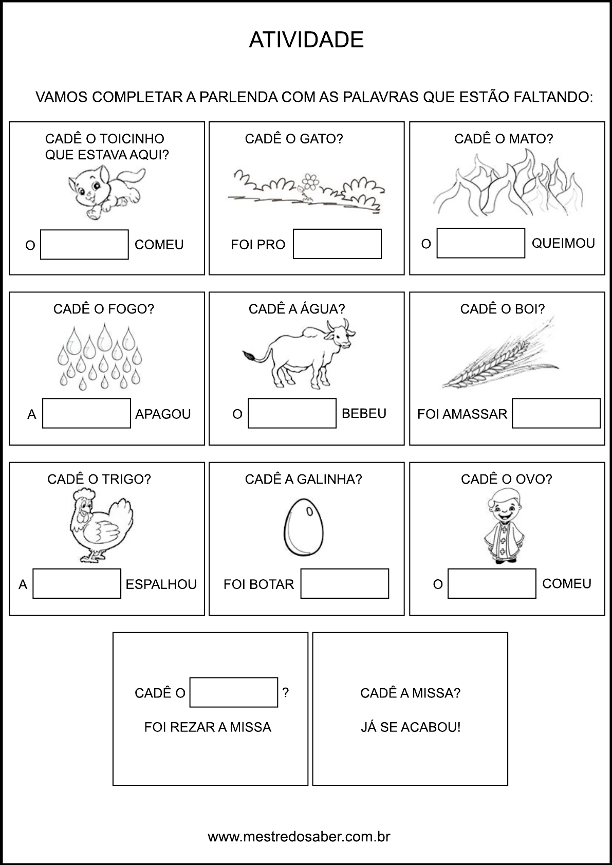 www.mestredosaber.com.br ATIVIDADE VAMOS COMPLETAR A PARLENDA COM AS PALAVRAS QUE ESTÃO FALTANDO: CADÊ O TOICINHO QUE ESTAVA AQUI? O COMEU CADÊ O GATO? FOI PRO CADÊ O MATO? O QUEIMOU CADÊ O FOGO? APAGOU CADÊ A ÁGUA? O BEBEU CADÊ O BOI? FOI AMASSAR CADÊ O TRIGO? A ESPALHOU CADÊ A GALINHA? FOI BOTAR CADÊ O ? FOI REZAR A MISSA CADÊ A MISSA? JÁ SE ACABOU! CADÊ O OVO? O COMEU A