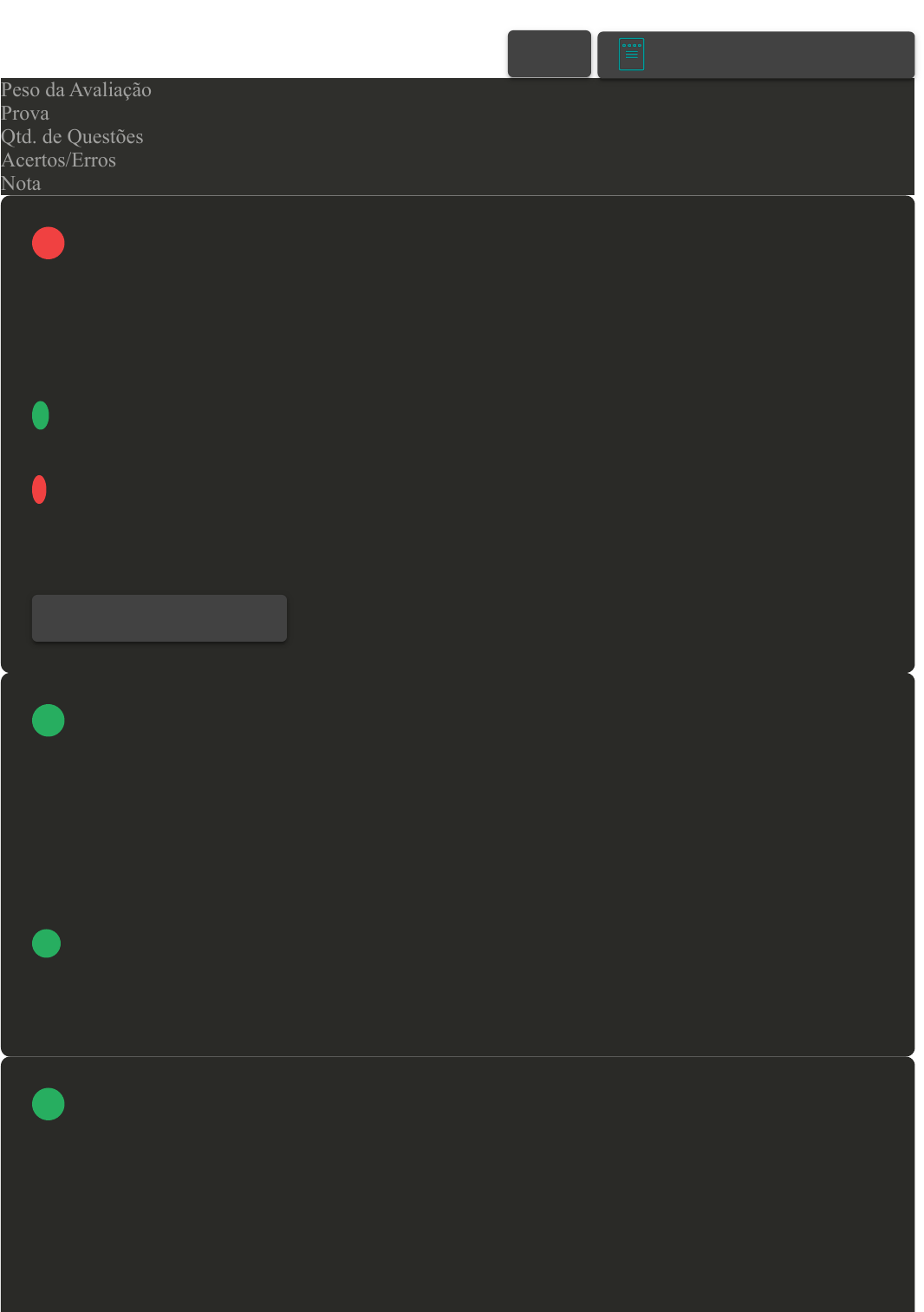 Prova Impressa GABARITO | Avaliação I - Individual (Cod.:956715) Peso da Avaliação 2,00 Prova 83122327 Qtd. de Questões 10 Acertos/Erros 8/2 Nota 8,00 A distribuição de probabilidades associa uma probabilidade a cada resultado numérico de um experimento, ou seja, dá a probabilidade de cada valor de uma variável aleatória. Com relação a essas distribuições, assinale a alternativa CORRETA: A A distribuição exponencial deriva de um processo conhecido como teste de Bernoulli. B A distribuição de Poisson descreve a probabilidade dos números de ocorrências, num campo ou intervalo contínuo (normalmente tempo e espaço), de eventos bem raros. C A distribuição de T de student descreve que a curva normal tem forma de sino, ou seja, é unimodal e simétrica, e o seu valor de máxima frequência, a moda, coincide com o valor da média e da mediana. D A distribuição binomial é aplicada nos casos que queremos analisar o espaço ou intervalo de acontecimentos de um evento. É a coleção de métodos e técnicas utilizados para se estudar uma população, baseados em amostras probabilísticas dessa mesma população. Sobre o aspecto descrito no enunciado, assinale a alternativa CORRETA: A Estatística Qualitativa e Quantitativa. B Estatística Populacional ou Inferencial. C Estatística Indutiva ou Inferencial. D Estatística Indutiva ou Preferencial. O dado é a menor unidade de informação obtida de cada unidade amostral. Podendo ser valores numéricos ou categorias, os dados fazem referência às variáveis, que são qualquer característica observada na unidade amostral e que pode variar entre as unidades amostrais. As variáveis podem ser classificadas de acordo com as suas características. Considerando as características de cada variável, associe os itens, utilizando o código a seguir: I- Variáveis Quantitativas. II- Variáveis Qualitativas. III- Variáveis Derivadas. VOLTAR A+ Alterar modo de visualização 1 Revisar Conteúdo do Livro 2 3 19/06/2024, 10:56 Avaliação I - Individual about:blank 1/4 ( ) São variáveis criadas a partir de operações lógicas ou matemáticas de outras variáveis, como a razão, a taxa e o índice. ( ) São valores numéricos e expressam quantidades, que podem ser contínuas ou discretas. ( ) São também denominadas categóricas, fornecem dados não numéricos e podem ser nominais ou ordinais. Assinale a alternativa que apresenta a sequência CORRETA: A II - I - III. B I - III - II. C III - I - II. D III - II - I. As variáveis quantitativas são características que podem ser descritas por números, sendo classificadas entre contínuas e discretas. Assinale a alternativa CORRETA que descreve as variáveis discretas: A A variável é avaliada pela ordenação entre as categorias. Exemplos: escolaridade (1º, 2º, 3º graus), estágio da doença (inicial, intermediário, terminal), mês de observação (janeiro, fevereiro etc.). B A variável é avaliada em números que são resultados de contagens e, por isso, somente fazem sentido números inteiros. Exemplos: número de filhos, número de bactérias por litro de leite, número de cigarros fumados por dia. C A variável é avaliada e não existe ordenação entre as categorias. Exemplos: sexo, cor dos olhos, fumante/não fumante, doente/sadio. D A variável é avaliada em números que são resultados de medições e, por isso, podem assumir valores com casas decimais e devem ser medidas por meio de algum instrumento. Exemplos: massa (balança), altura (régua), tempo (relógio), pressão arterial, idade. A tabela é uma maneira de apresentar de forma resumida um conjunto de observações, nesse sentido, ela possui a vantagem de conseguir expor organizadamente, em um só local, os resultados sobre determinado assunto. Assinale a alternativa CORRETA que apresenta os elementos da tabela: A Título, corpo da tabela, cabeçalho e rodapé. B Título, série, corpo da tabela, cabeçalho e rodapé. C Título, coluna indicadora, cabeçalho e rodapé. D Título, coluna numérica, cabeçalho e rodapé. 4 5 Revisar Conteúdo do Livro 19/06/2024, 10:56 Avaliação I - Individual about:blank 2/4 Alguns requisitos básicos são fundamentais para que os dados tenham uma representação gráfica. Assinale a alternativa CORRETA que apresenta esses requisitos: A Precisão, clareza e veracidade. B Simplicidade, clareza e veracidade. C Simplicidade, tabulação e veracidade. D Precisão, tabulação e veracidade. O gráfico estatístico é uma forma de apresentação, cujo objetivo é reproduzir, no pesquisador ou no público em geral, uma impressão mais rápida e viva do fenômeno em estudo, já que, visualmente, os gráficos tendem a ser mais rápidos na compreensão do que as tabelas. Para que os seus dados tenham uma representação gráfica, eles deverão ter alguns requisitos fundamentais. A respeito deles, analise as sentenças a seguir: I- Simplicidade: como o próprio nome diz, deve ser simples, os detalhes de importância secundária devem ser retirados, assim como os traços desnecessários que possam levar o observador a uma análise morosa ou com erros. II- Clareza: o gráfico deve mostrar de forma incorreta a interpretação dos valores representativos do fenômeno em estudo. III- Veracidade: deve expressar a verdade sobre o fenômeno em estudo. Assinale a alternativa que apresenta a sequência CORRETA: A As sentenças I e III estão corretas. B Somente a sentença II está correta. C Somente a sentença III está correta. D Somente a sentença I está correta. O gráfico estatístico é uma forma de apresentação que possui como objetivo reproduzir, no pesquisador, ou no público geral, uma impressão mais rápida e viva do fenômeno em estudo, já que, visualmente, os gráficos tendem a ser mais rápidos na compreensão do que as tabelas. Para que os dados tenham uma representação gráfica, eles deverão ter alguns requisitos fundamentais. Assinale a alternativa CORRETA que apresen