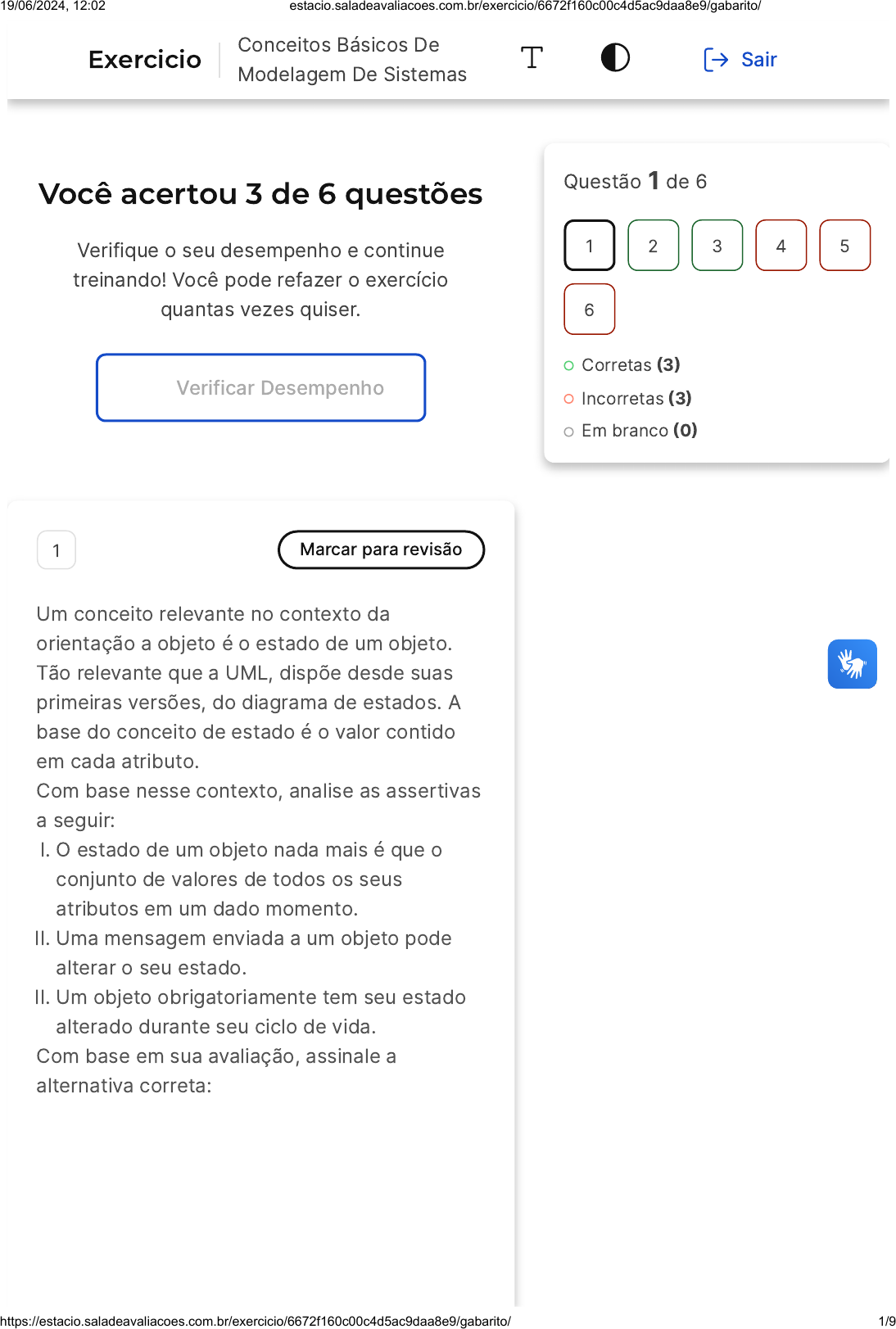 Você acertou 3 de 6 questões Verifique o seu desempenho e continue treinando! Você pode refazer o exercício quantas vezes quiser. Verificar Desempenho 1 Marcar para revisão Um conceito relevante no contexto da orientação a objeto é o estado de um objeto. Tão relevante que a UML, dispõe desde suas primeiras versões, do diagrama de estados. A base do conceito de estado é o valor contido em cada atributo. Com base nesse contexto, analise as assertivas a seguir: I� O estado de um objeto nada mais é que o conjunto de valores de todos os seus atributos em um dado momento. II� Uma mensagem enviada a um objeto pode alterar o seu estado. II� Um objeto obrigatoriamente tem seu estado alterado durante seu ciclo de vida. Com base em sua avaliação, assinale a alternativa correta: Questão 1 de 6 Corretas �3� Incorretas �3� Em branco �0� 1 2 3 4 5 6 Exercicio Conceitos Básicos De Modelagem De Sistemas Sair 19/06/2024, 12:02 estacio.saladeavaliacoes.com.br/exercicio/6672f160c00c4d5ac9daa8e9/gabarito/ https://estacio.saladeavaliacoes.com.br/exercicio/6672f160c00c4d5ac9daa8e9/gabarito/ 1/9 A B C D E Estão corretas as assertivas I e II. Estão corretas as assertivas I, II e III. Estão corretas as assertivas II e III. Estão corretas as assertivas I e III. Somente a assertiva I está correta. Resposta correta Parabéns, você selecionou a alternativa correta. Confira o gabarito comentado! Gabarito Comentado A resposta correta é: Estão corretas as assertivas I e II. As assertivas I e II estão corretas porque o estado de um objeto nada mais é que o conjunto de valores de todos os seus atributos em um dado momento e uma mensagem enviada a um objeto pode alterar o seu estado. A assertiva III está incorreta porque um objeto não obrigatoriamente tem seu estado alterado durante seu ciclo de vida. 2 Marcar para revisão O uso de camadas tem vantagens que justificam seu uso, mas existem pontos negativos. Com base nesse contexto, assinale a 19/06/2024, 12:02 estacio.saladeavaliacoes.com.br/exercicio/6672f160c00c4d5ac9daa8e9/gabarito/ https://estacio.saladeavaliacoes.com.br/exercicio/6672f160c00c4d5ac9daa8e9/gabarito/ 2/9 A B C D E ÚNICA alternativa que apresenta uma desvantagem do uso de camadas no desenvolvimento de software: Torna o código mais organizado e legível. Permite o desenvolvimento, o teste e a manutenção de cada camada isoladamente. Permite melhor reuso do código ou dos objetos. Permite substituir uma tecnologia que implemente uma camada de forma simples. Aumenta o número de classes do sistema. Resposta correta Parabéns, você selecionou a alternativa correta. Confira o gabarito comentado! Gabarito Comentado No caso da orientação a objetos, as classes são organizadas em módulos maiores, as chamadas camadas. Uma camada somente pode usar serviço (de outras classes) da camada imediatamente inferior. A seguir, as desvantagens do desenvolvimento de software em camadas: � Aumenta o número de classes do sistema. � A adição de camadas torna o sistema mais complexo. 19/06/2024, 12:02 estacio.saladeavaliacoes.com.br/exercicio/6672f160c00c4d5ac9daa8e9/gabarito/ https://estacio.saladeavaliacoes.com.br/exercicio/6672f160c00c4d5ac9daa8e9/gabarito/ 3/9 A B C D E � Potencialmente, reduz o desempenho do software. 3 Marcar para revisão Nos estágios iniciais, é necessária uma visão externa (do sistema). As maquetes de empreendimento imobiliário nos dão essa ajuda. Com elas, é possível visualizar todas as áreas do empreendimento e ter uma noção do todo. Ou seja, a visão é de quem está de fora. Na UML há um diagrama com finalidade semelhante e que mostra os tipos de usuário que interagem com o sistema e com quais funções eles interagem. Estamos falando de qual diagrama da UML? Classes. Estruturas compostas. Objetos. Casos de uso. Estados. Resposta correta Parabéns, você selecionou a alternativa correta. Confira o gabarito comentado! 19/06/2024, 12:02 estacio.saladeavaliacoes.com.br/exercicio/6672f160c00c4d5ac9daa8e9/gabarito/ https://estacio.saladeavaliacoes.com.br/exercicio/6672f160c00c4d5ac9daa8e9/gabarito/ 4/9 Gabarito Comentado O diagrama de casos de uso é um diagrama que mostra os tipos de usuário que interagem com o sistema e com quais funções eles interagem. Ele é usado para obter uma visão externa do sistema e para identificar os requisitos funcionais do sistema. 4 Marcar para revisão "Modelagem de sistema de software consiste na utilização de notações gráficas e textuais com o objetivo de construir modelos que representam as partes essenciais de um sistema, considerando-se várias perspectivas diferentes e complementares." BEZERRA, E. Princípios de análise e projeto de sistemas com UML. 3. ed. Rio de Janeiro: Elsevier, 2015. Ao modelar sistemas orientados a objetos, nos preocupamos em identificar os objetos que se relacionam com o domínio do problema do sistema em estudo. Nesse sentido, a UML oferece um conjunto de diagramas que permite modelar sistemas orientados a objeto. Sobre a UML, analise as assertivas: I. A UML é uma metodologia de desenvolvimento, que pode ser aplicada nas diferentes fases de um processo de desenvolvimento de software. II. A UML disponibiliza diagramas que permitem o entendimento do sistema sob diferes visões. III. Uma das visões, a de casos de uso, tem uma perspectiva externa, tal qual uma 19/06/2024, 12:02 estacio.saladeavaliacoes.com.br/exercicio/6672f160c00c4d5ac9daa8e9/gabarito/ https://estacio.saladeavaliacoes.com.br/exercicio/6672f160c00c4d5ac9daa8e9/gabarito/ 5/9 A B C D E maquete de um empreendimento imobiliário. IV. A UML é dependente de tecnologia, podendo ser aplicada em contexto computacional específico. É correto apenas o que se afirma em: II e III. I e II. I, II e III. III e IV. II e IV. Resposta incorreta Opa! A alternativa correta é a letra A. Confira o gabarito comentado! Gabarito Comentado Resposta correta: II e III. A UML é uma linguagem de modelagem de sistemas o
