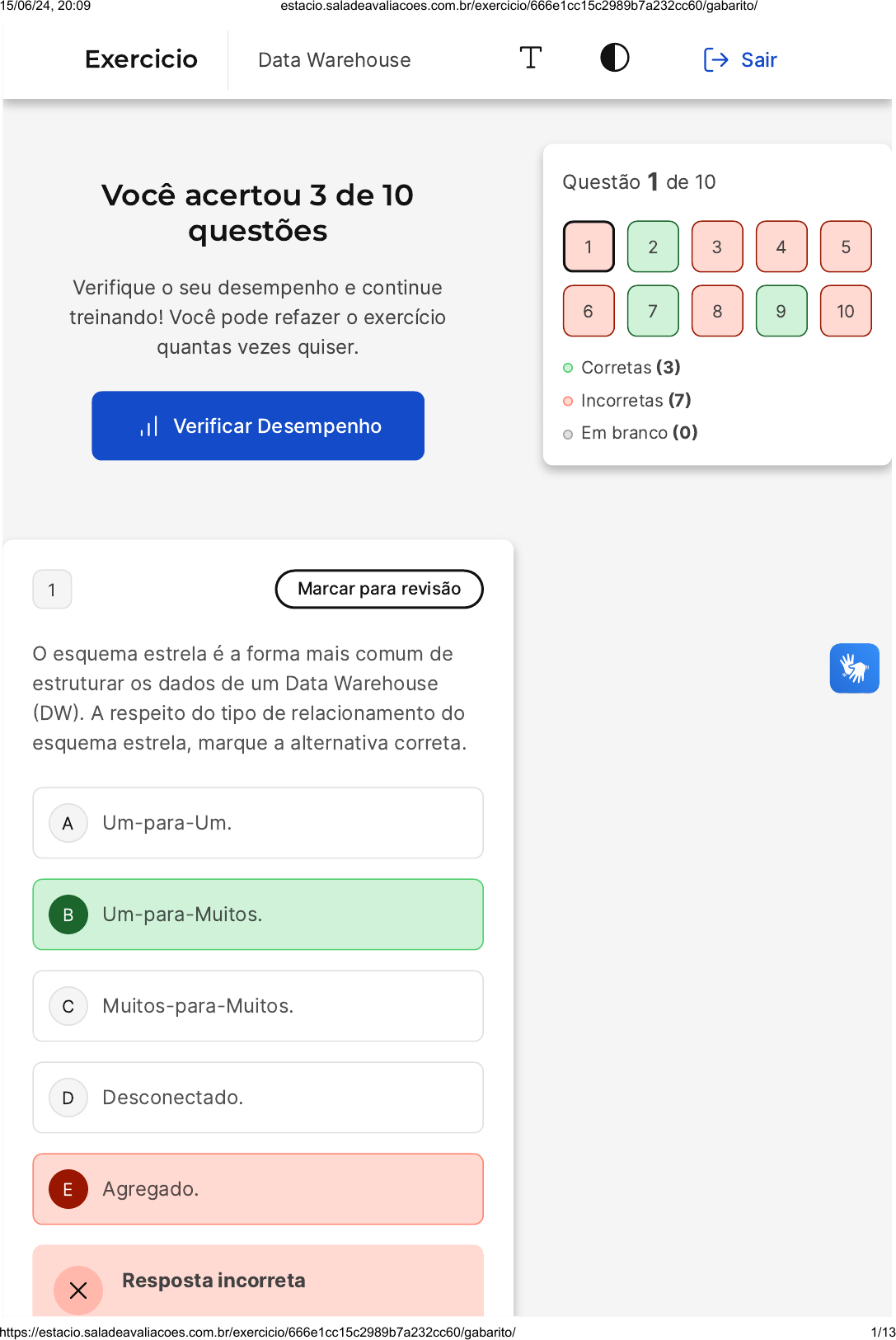 Você acertou 3 de 10 questões Verifique o seu desempenho e continue treinando! Você pode refazer o exercício quantas vezes quiser. Verificar Desempenho A B C D E 1 Marcar para revisão O esquema estrela é a forma mais comum de estruturar os dados de um Data Warehouse �DW�. A respeito do tipo de relacionamento do esquema estrela, marque a alternativa correta. Um-para-Um. Um-para-Muitos. Muitos-para-Muitos. Desconectado. Agregado. Resposta incorreta Questão 1 de 10 Corretas �3� Incorretas �7� Em branco �0� 1 2 3 4 5 6 7 8 9 10 Exercicio Data Warehouse Sair 15/06/24, 20:09 estacio.saladeavaliacoes.com.br/exercicio/666e1cc15c2989b7a232cc60/gabarito/ https://estacio.saladeavaliacoes.com.br/exercicio/666e1cc15c2989b7a232cc60/gabarito/ 1/13 A B C Opa! A alternativa correta é a letra B. Confira o gabarito comentado! Gabarito Comentado No esquema estrela, o tipo de relacionamento é caracterizado como "Um- para-Muitos". Isso ocorre porque a tabela Fato, que é o centro do esquema estrela, se relaciona com várias tabelas de dimensões através de chaves estrangeiras. As alternativas "Um-para-Um" e "Muitos- para-Muitos" não são aplicáveis ao esquema estrela. Ademais, "Desconectado" e "Agregado" não representam tipos de relacionamentos válidos neste contexto. 2 Marcar para revisão Um Data Warehouse funciona como uma base histórica de dados que será utilizada como fonte de dados por aplicações analíticas. A respeito da motivação para desenvolver uma solução de Data Warehouse �DW�, marque a alternativa correta. Criar melhores oportunidades de negócios. Acelerar as operações de inserção e exclusão. Utilizar as tecnologias mais modernas para gerenciamento de dados. 15/06/24, 20:09 estacio.saladeavaliacoes.com.br/exercicio/666e1cc15c2989b7a232cc60/gabarito/ https://estacio.saladeavaliacoes.com.br/exercicio/666e1cc15c2989b7a232cc60/gabarito/ 2/13 D E Reduzir a quantidade de recursos para analisar dados. Aumentar a quantidade de relatórios. Resposta correta Parabéns, você selecionou a alternativa correta. Confira o gabarito comentado! Gabarito Comentado A principal motivação para criar uma solução de DW é a de criar oportunidades de negócios através de bases de dados históricos e centralizados. Já a opção "acelerar operações de inserção e de exclusão" está errada, pois o DW não se destina a isso. Além disso, também é errado afirmar que o DW reduz a quantidade de recursos para a análise, pois é exatamente ao contrário. Por fim, também é errado que a motivação de desenvolver um DW seja aumentar a quantidade de relatórios. 3 Marcar para revisão O BI (business intelligence) revela insights para a tomada de decisões estratégicas. As ferramentas de business intelligence analisam dados históricos e atuais e apresentam as descobertas em formatos visuais intuitivos. Disponível em: https://powerbi.microsoft.com/pt-br/what-is- business-intelligence/. Acesso em: 03 nov. 2022. 15/06/24, 20:09 estacio.saladeavaliacoes.com.br/exercicio/666e1cc15c2989b7a232cc60/gabarito/ https://estacio.saladeavaliacoes.com.br/exercicio/666e1cc15c2989b7a232cc60/gabarito/ 3/13 A B C D E Um Data Mart �DM� é especialmente útil quando se trabalha com aplicações voltadas para Inteligência nos Negócios. A respeito de um Data Mart �DM�, marque a alternativa correta. É uma outra forma de se referenciar a um Data Warehouse. É uma versão especializada do Data Warehouse. É um sistema de apoio à tomada de decisão. É um relatório voltado para a tomada de decisão. É um banco de dados transacional. Resposta incorreta Opa! A alternativa correta é a letra B. Confira o gabarito comentado! Gabarito Comentado Um Data Mart �DM� é um subconjunto do Data Warehouse �DW�. A principal diferença entre os dois modelos está no foco deles. Já as demais opções estão erradas, pois DM e DW são modelos com objetivos diferentes, além disso o DM não é um sistema de decisão e nem mesmo um banco de dados transacional. 15/06/24, 20:09 estacio.saladeavaliacoes.com.br/exercicio/666e1cc15c2989b7a232cc60/gabarito/ https://estacio.saladeavaliacoes.com.br/exercicio/666e1cc15c2989b7a232cc60/gabarito/ 4/13 A B C D E 4 Marcar para revisão Um Data Mart �DM� é um repositório de dados históricos focado em determinado tema. Em relação aos diferentes tipos de Data Mart, qual é o tipo que se caracteriza por ser um subconjunto dos dados do Data Warehouse �DW�? Independente. Híbrido. Homogêneo. Analítico. Dependente. Resposta incorreta Opa! A alternativa correta é a letra E. Confira o gabarito comentado! Gabarito Comentado O tipo de Data Mart que se caracteriza por ser um subconjunto dos dados do Data Warehouse é o tipo dependente. Este tipo de Data Mart é alimentado diretamente a partir dos dados do Data Warehouse. Por outro lado, os tipos independente e híbrido possuem outras finalidades e não são subconjuntos diretos do Data Warehouse. As opções "Analítico" e "Homogêneo" não são consideradas categorias válidas de 15/06/24, 20:09 estacio.saladeavaliacoes.com.br/exercicio/666e1cc15c2989b7a232cc60/gabarito/ https://estacio.saladeavaliacoes.com.br/exercicio/666e1cc15c2989b7a232cc60/gabarito/ 5/13 A B C D E Data Mart, portanto, não se aplicam à questão. 5 Marcar para revisão Uma das situações que precisamos nos expor ao trabalhar com a construção do DW é a escolha da tecnologia que vamos utilizar para implementá-lo e, posteriormente, trabalhar com ele. Com base no exposto na questão e no seu conhecimento, escolha a opção correta que trata de um requisito associado a seleção de tecnologia com o desenvolvimento de uma solução de Data Warehouse �DW�. Analisar o impacto da inclusão do DW na configuração tecnológica já existente. Qual a solução mais barata. Escolher a solução com maior quantidade de funcionalidades. Selecionar a solução de DW do fornecedor mais conhecido no mercado. Garantir que a solução se