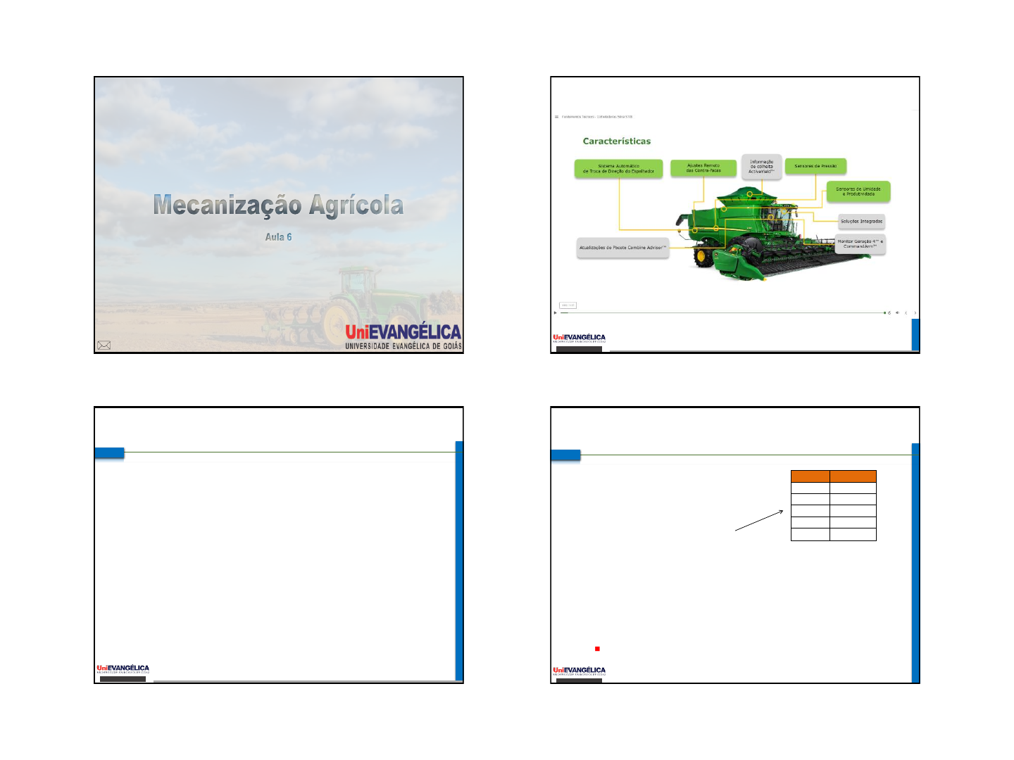 12/06/2024 1 Anderson da Silva Umbelino Agronomia 2024/1 andersonumbelino5@gmail.com Colheita mecanizada - Histórico ◼ 1834 – primeiro corte e recolhimento pela segadora McCornick; ◼ 1938 – primeira colhedora comercial auto-propelida; ◼ 1970 – implemento no Brasil em função da “revolução verde”; Fatores decisivos para uma boa • colheita mecanizada: ◼ Umidade do produto; ◼ Influencia na trilha; ◼ Alta umidade=desintegração do grão; ◼ Baixa umidade = danos mecânicos aos grãos; ◼ Dimensionamento correto da frota; cultura umidade % Aroz 26 a 20 Feijão 18 a 16 Milho 15 a 13 Soja 14,5 a 12 Trigo 16 a 15 12/06/2024 2 Definição e Classificação ◼ Para normatizar os nomes dos equipamentos a ABNT criou 3 normas: ◼ NBR-9740 ◼ NBR- 9741 “Colhedora autopropelida de grãos - Máquina agrícola autopropelida destinada a realizar, concomitantemente as operações de ceifa, trilha e limpeza dos grãos” Definição e Classificação ◼ NBR- 9742 ◼ Classifica quanto ao tipo de propulsão, que pode ser: ◼ Rebocada, ◼ Montada, e ◼ Autopropelida. http://br.monografias.com/trabalhos902/comp ortamento-trator-colhedora/comportamento- trator-colhedora2.shtml :/ /i n ro d a .c o m .b r/ p ro d u to s. p h p As colhedoras são classificadas em: ◼ Colhedoras de grãos. ◼ Colhedoras de Cana de açúcar. ◼ Colhedoras de Forragens (Forrageiras). ◼ Colhedoras de Algodão. ◼ Colhedoras de Raízes e tubérculos. ◼ Colhedoras de Frutas Arbóreas. ◼ Colhedoras de Feijão/Amendoim. Tipos de colhedoras mecanizadas: Colheita arroz http://br.monografias.com/trabalhos902/comp 12/06/2024 3 5 Operações Básicas Alimentação Debulha Separação Limpeza Armazenagem Retrilha ALIMENTAÇÃO Corte da cultura pela barra de corte da plataforma, a condução do material para o cilindro de debulha é feita pelo molinete da plataforma e elevador alimentador. Componentes do sistema: 1 Molinete 2 Barra de Corte 3 Sem-fim de Alimentação 4 Elevador de Palha 5- Corrente e Travessas Alimentadoras DEBULHA Passagem do material entre o cilindro e o côncavo retira o grão da planta jogando-os diretamente no bandejão e a palha passa pelo batedor e depois pelo Rotary Separator. Componentes do Sistema: 6- Cilindro de Debulha 7- Côncavo de Debulha COMBINADAS - SISTEMAS Corte e Alimentação – Plataforma de corte Separadores Molinete Esteira Alimentadora Condutor helicoidal e Dedos Retráteis Barra de Corte 12/06/2024 4 COMBINADAS - SISTEMAS Separadores Molinete Barra de Corte Condutor helicoidal e Dedos Retráteis Esteira Alimentadora MOLINETE - Funções ✓ Separar a quantidade a ser cortada; ✓ Levantar plantas acamadas; ✓ Apoiar as plantas que serão cortadas; ✓ Conduzir as plantas cortadas para a ação do caracol. COMBINADAS - SISTEMAS MOLINETE - Regulagens ✓ Altura COMBINADAS - SISTEMAS MOLINETE - Regulagens ✓ Inclinação dos dedos dos pentes COMBINADAS - SISTEMAS 12/06/2024 5 MOLINETE - Regulagens ✓ Afastamento COMBINADAS - SISTEMAS MOLINETE - Regulagens ✓ Velocidade periférica COMBINADAS - SISTEMAS MOLINETE - Regulagens ✓ Velocidade periférica Rm0,10467rm Ivm = V Ivm – Índice de velocidade do molinete Rm – rotação do molinete (rpm) rm – raio do molinete (m) V – velocidade de deslocamento da colhedora (ms-1) COMBINADAS - SISTEMAS Limites do Índice de Velocidade do Molinete COMBINADAS - SISTEMAS Condição da cultura Posição do Molinete Inclinação dos dentes Ivm Porte normal Eixo do molinete 15 a 20cm à frente da barra de corte Verticais 1,25 a 1,50 Porte pequeno Eixo do molinete próximo à barra de corte Verticais 1,25 a 1,50 Acamada Eixo do molinete 20 a 30cm à frente da barra de corte Inclinado s para trás <1,25 Silva (2015) ATENÇÃO Ivm < 1,25 - risco de tombamento da cultura à frente da barra de corte; Ivm > 1,50 – risco de perdas por debulhamento e arremesso. 12/06/2024 6 Barra de corte COMBINADAS - SISTEMAS Contra-facas ou Dedos da barra Facas Barra de corte COMBINADAS - SISTEMAS Barra de corte COMBINADAS - SISTEMAS Barra de corte flexível Esteiras transportadoras COMBINADAS - SISTEMAS 12/06/2024 7 Condutor helicoidal (Sem-fim ou Caracol) COMBINADAS - SISTEMAS Plataforma de corte ◼ Milho ◼ Outros: soja, trigo, arroz, … 12/06/2024 8 12/06/2024 9 Cilindro + Côncavo ◼ Barra ◼ Dente (Arroz) Cilindro e Côncavo ◼ Rotação ◼ Distância na entrada e saída Sistema de trilha 4 COMBINADAS - SISTEMAS De fluxo radial Sistema de trilha 4 COMBINADAS - SISTEMAS De fluxo radial Cilindro Batedor Entrada Saída da palha Côncavo Grãos 12/06/2024 10 Sistema de trilha 4 COMBINADAS - SISTEMAS De fluxo radial Até 90% dos grãos Cilindro Côncavo Batedor 4 COMBINADAS - SISTEMAS Cilindro e côncavo - Regulagem ✓ Rotação ✓ Afastamento 4 COMBINADAS - SISTEMAS Cilindro e côncavo - Regulagem ✓ Rotação ✓ Afastamento Regra geral Grãos pequenos: < afastamento e > rotação Grãos maiores: > afastamento e < rotação 4 COMBINADAS - SISTEMAS Sistema de trilha De fluxo axial 12/06/2024 11 4 COMBINADAS - SISTEMAS IMPORTANTE Nas colhedoras de fluxo AXIAL O sistema de separação está integrado ao rotor de trilha Limpeza ◼ Peneira superior ◼ Peneira inferior ◼ Ventilador 12/06/2024 12 4 COMBINADAS - SISTEMAS Ventilador Sistema de limpeza Peneiras Bandeja alimentadora Superior Inferior Extensão da retrilha 4 COMBINADAS - SISTEMAS Sistema de limpeza - Regulagens Peneiras ✓ Superior – mais aberta ✓ Inferior – mais fechada Ventilador ✓ Intensidade de fluxo ✓ Direcionamento de fluxo Transporte e armazenamento ◼ Grãos limpos: ◼ Passam pela peneira inferior, vão para o sem- fim de grãos limpos. O elevador de grãos limpos os transporta para o graneleiro. Transporte e armazenamento ◼ Retrilha: ◼ Da calha de retrilha atingem o sem-fim que direciona o material para o elevador de retrilha que o deposita na parte frontal do cilindro 12/06/2024 13 https://www.youtube.com/watch?v=w9u0a YIkjKQ https://ww