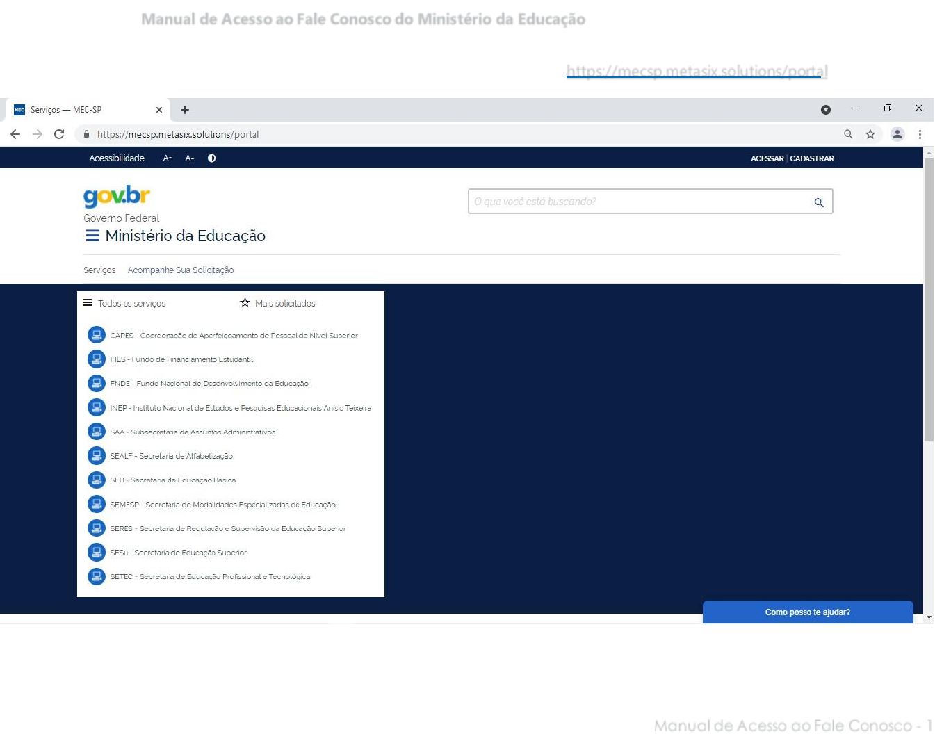 Olá! Este é o Manual de Acesso ao Fale Conosco do Ministério da Educação. Seguindo o passo a passo, você localizará com facilidade as informações disponibilizadas pelo MEC, bem como realizará o registro das suas demandas no Fale Conosco, por meio do endereço eletrônico https://mecsp.metasix.solutions/portal. Manual de Acesso ao Fale Conosco - 1 Manual de Acesso ao Fale Conosco - 2 Inicialmente, ao acessar o Portal, aba "Todos os Serviços", estarão listadas as Secretarias (SAA, SEB, SETEC, SERES, SESU, SEMESP e SEALF), as Autarquias (FNDE e INEP) e a Fundação (CAPES) do Ministério da Educação. Selecionando qualquer unidade, será apresentada a relação de assuntos disponíveis. Como exemplo, FIES - Fundo de Financiamento Estudantil. Manual de Acesso ao Fale Conosco - 3 Outro exemplo, SESu - Secretaria de Educação Superior. Manual de Acesso ao Fale Conosco - 4 Ao escolher o assunto desejado e posteriormente o respectivo serviço, será apresentada a opção “SELECIONAR”. Após clicá-la, a resposta fornecida pelo MEC estará disponível. Caso a informação não seja suficiente, você poderá: - Entrar em contato por meio do telefone 0800 616161; - Acessar o chat online clicando em “Como posso te ajudar?”, na parte inferior da tela; ou - Realizar o registro detalhado da solicitação, isto é, abertura de demanda, preenchendo os campos solicitados. Manual de Acesso ao Fale Conosco - 5 Atenção: O registro da demanda também pode ser realizado através da aba “ACESSAR”. Manual de Acesso ao Fale Conosco - 6 Clicando em “ACESSAR” será aberta uma nova tela para inserção do LOGIN (CPF/CNPJ) e SENHA. Caso seja o primeiro acesso, é necessário realizar o cadastro selecionando indicativa acima. conforme seta “Cadastre-se clicando aqui”, Manual de Acesso ao Fale Conosco - 7 Ao término do preenchimento, é necessário clicar em “Cadastrar”, localizado no final da tela. Os campos indicados com asterisco (*) são de preenchimento obrigatório. Manual de Acesso ao Fale Conosco - 8 Importante: Acessando o Portal Serviços, você será direcionado para o ambiente perfil e poderá visualizar as opções: ➢ Minhas solicitações: Contém os protocolos abertos em seu nome, sendo possível acompanhar o status das demandas. ➢ Dados pessoais: Onde é possível realizar atualização de dados e alteração de senha. Retornando na aba “Todos os serviços”, será permitido localizar assuntos específicos das Secretarias, Autarquias e Fundação do Ministério da Educação. Como exemplo, assunto AVAMEC da SEB - Secretaria de Educação Básica. Manual de Acesso ao Fale Conosco - 9 Se o assunto e o respectivo serviço não contemplarem as informações desejadas, orientamos a abertura de demanda clicando em “Solicitar como”, conforme imagem: Na sequência, será aberto o formulário para descrição da demanda. Importante: Cada Secretaria, Autarquia e Fundação possui formulário específico para abertura da solicitação. Manual de Acesso ao Fale Conosco - 10 Atenção: Havendo a necessidade de encaminhamento de documentos, é permitida a inserção de anexos com limite de 50 Mb por arquivo. Clique em “+ Adicionar anexos” e selecione seus arquivos salvos. Para finalizar a demanda, basta marcar o “reCAPTCHA ( Não sou um robô)” e em seguida “Finalizar”. Manual de Acesso ao Fale Conosco - 11 Finalizado o registro, o número de protocolo da solicitação será gerado. Serão enviadas ao e-mail cadastrado, as informações sobre a Confirmação de Abertura e de Fechamento do Protocolo. Manual de Acesso ao Fale Conosco - 12
