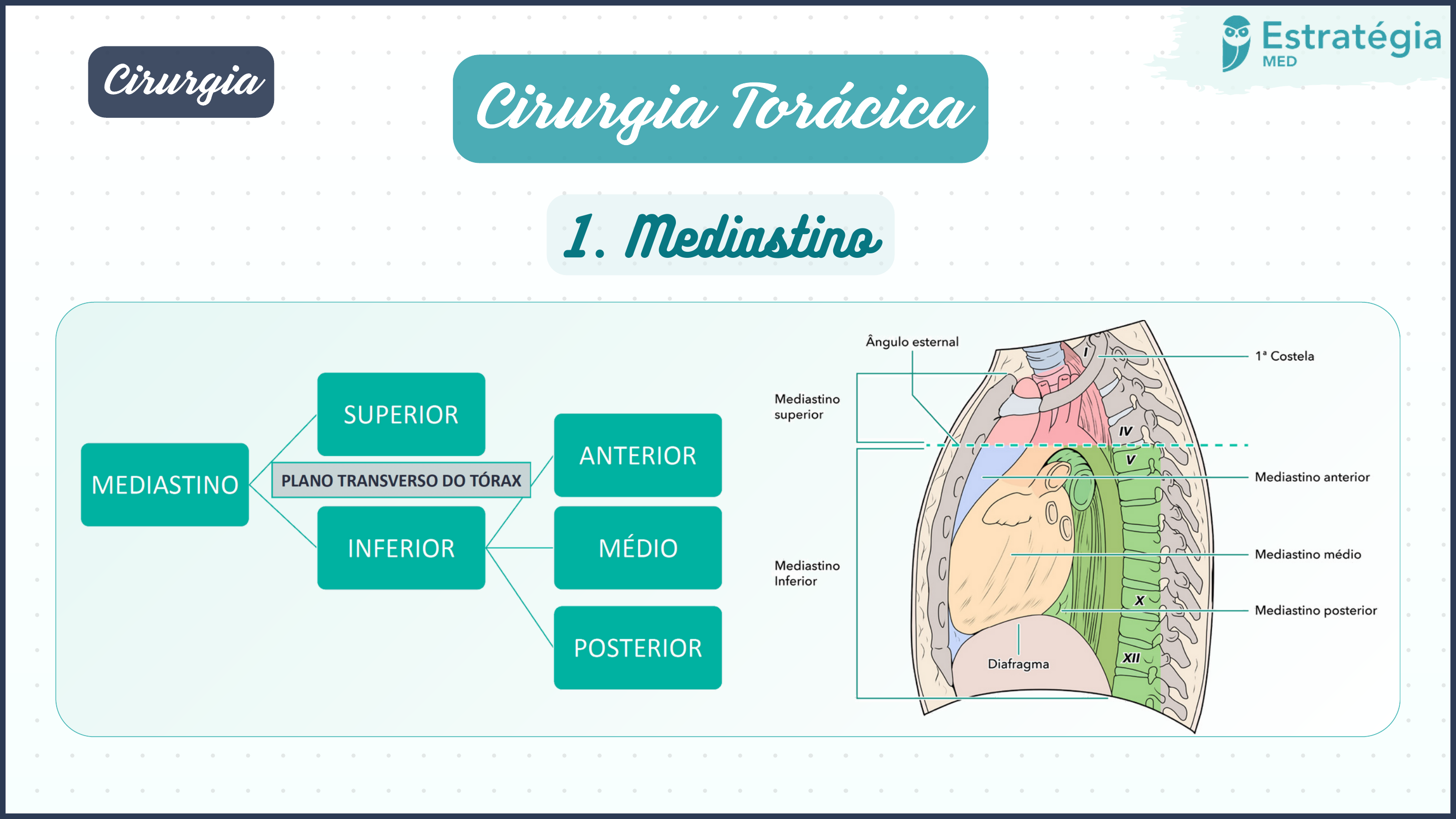 Cirurgia Torácica Cirurgia 1. Mediastino CISTOS E TUMORES MEDIASTINAIS TUMORES E CISTOS MEDIASTINAIS - LOCALIZAÇÃO Mediastino Tumores Cistos Superior *Principal: bócio intratorácico *Outro: tumor de células germinativas - Anterior *Principal: timoma *Outros: tumores de células germinativas, linfomas; bócio intratorácico *Principal: pericárdico *Outro: cisto tímico Médio *Principal: linfonodomegalias *Outros: LINFOMA, aneurismas *Principal: broncogênico *Outro: cisto pericárdico Posterior *Principal: tumores neurogênicos *Outros: tumores broncogênicos; aneurismas de aorta; divertículos e tumores esofágicos *Principal: cisto entérico MASSAS MEDIASTINAIS MAIS COMUNS Adulto Criança Timoma e cisto tímico: 26,5% → m. anterior Tumores de células germinativas: 13,8% → m. anterior Linfomas: 12,7% → m. anterior e médio Cistos enterogênicos: 10,3% Cistos pleuro-pericárdicos: 6,7% Tumores neurogênicos: 41,6% → m. posterior Tumores de células germinativas: 13,5% → m. anterior e superior Cistos primários: 13,4% Linfomas: 13,4% → m. anterior e médio Tumores do Mediastino SuperiorTumores do Mediastino Superior Principal lesão do mediastino superior: bócio tireoidiano intratorácico/mergulhante Outras possíveis lesões: tumores de células germinativas Bócio mergulhante de tireoide: Quadro clínicoQuadro clínico:: DiagnósticoDiagnóstico:: TratamentoTratamento:: Evolução lenta, poucos sintomas Compressão extrínseca de estruturas adjacentes: dispneia progressiva e ruídos da ventilação (estridor), síndrome da veia cava superior (maiores) O diagnóstico é confirmado por exame de imagem, principalmente TC Ressecção da lesão, que pode ser feita por cervicotomia, cervicoesternotomia ou toracotomia posterolateral direita, a depender do tamanho e da localização Note, na radiografia, à direita, o aumento das partes moles na região cervical com deslocamento e afilamento traqueal, decorrentes de volumoso bócio tireoidiano com extensão para o mediastino superior. LESÕES DO MEDIASTINO ANTERIOR TUMORES – 4 “Ts” CISTOS Timoma Tumores de células germinativas (Terrível) Linfoma (Tireoide) Bócio-intratorácico Pericárdico1. Tímico2. Tumores do Mediastino AnteriorTumores do Mediastino Anterior Timoma: Aspectos GeraisAspectos Gerais:: Miastenia GravisMiastenia Gravis:: Tumor mais frequente do mediastino anterior (95% estão nessa topografia); Mais comum entre 35 e 70 anos, sem prevalência por sexo; Crescimento lento, assintomático em 30 a 50% dos pacientes; Sintomas: decorrente da invasão de estruturas adjacentes: Dispneia (invasão do nervo frênico ou por derrame pleural); Rouquidão (invasão no nervo laríngeo reccorente inferior); Diagnóstico: radiográfico e histopatológico Tratamento: Estágio I: timectomia radical Estágios II e III: timectomia + radioterapia adjuvante Estágio IV: terapia multimodal Principal síndrome paratímica! Conceito: doença autoimune, que cursa com perda de força muscular generalizada, secundária à existência de anticorpos antirreceptores de acetilcolina. Tratamento farmacológico: corticoide sistêmico e drogas anticolinesterásicas (piridostigmina), além de gamaglobulina intravenosa na crise miastênica aguda. Tratamento cirúrgico: timectomia é OBRIGATÓRIA! Veja a seguir!Veja a seguir! Tumores de Células Germinativas: Segundo tumor mais frequente do mediastino anterior; Mais comum em adultos; Sem prevalência por sexo, mas lesões malignas são mais comuns em homens (90%) Linfoma: Mais comuns no mediastino anterior e médio, sendo pouco comum o acometimento isolado do mediastino Sintomas mais comuns: dor torácica, tosse, febre, dispneia, rouquidão e síndrome da veia cava superior Linfomas de Hodgkin: febre, calafrios, perda de peso e anorexia Diagnóstico: biópsia da lesão (amostras maiores de tecido: toracoscopia, mediastinoscopia ou mediastinotomia) Tratamento: quimioterapia SÍNDROME DA VEIA CAVA SUPERIOR Causa: Etiologias: Tumores que podem causá-la: Sintomas: Diagnóstico: Medidas iniciais: Tratamento: Obstrução do fluxo sanguíneo. Trombose venosa, COMPRESSÃO EXTRÍNSECA TUMORAL. Câncer de pulmão em lobo superior direito (principal); Linfomas; Timoma; Bócio mergulhante de tireoide; Tumores de células germinativas. Pletora e edema em face/pescoço, tórax superior; Turgência venosa com circulação colateral exuberante; Cefaleia; sensação de peso na cabeça; dispneia. Suspeita clínica + exame de imagem visualizando tumor. Decúbito elevado, oxigenoterapia e repouso. Específico para cada patologia; Tratamento endovascular: pacientes sem proposta cirúrgica. Dilatação por broncoscopia Prótese traqueal Traqueoplastia Traqueostomia definitiva Efeito temporário Não altera a estenose. Opções: metálica e “tubo T” Tratamento defi- nitivo: ressecção da estenose + anastomose Na presença de contraindicações à traqueoplastia Indicação: cirurgia em poucos dias Escolha: tubo T exteriorizado por traqueostomia: melhor higiene Contraindicações: > 60% de extensão; paciente sem condições clínicas 2. Estenose de Traqueia Pós-Intubação Orotraqueal 80% dos casos de estenose de traqueia ocorrem após intubação orotraqueal! Fatores de Risco: Apresentação Clínica e Diagnóstico: Abordagem Inicial: Pressões elevadas no balonete EM ADULTOS; Diâmetro do tubo EM CRIANÇAS; Má higiene da via aérea; Baixa umidificação da via aérea; Intubação orotraqueal prolongada; Realização de traqueostomia acima do 2º anel traqueal. Devemos prevenir! Tratamento: Sintomas: acometimento > 40% da luz traqueal: FALTA DE AR, exacerbada aos esforços; Taquipneia; Tiragem supraclavicular e intercostal; Cornagem ou estridor; Rouquidão; voz baixa. Diagnóstico: TC pescoço e tórax; Padrão-ouro: Laringotraqueobroncoscopia (diagnóstico e planejamento terapêutico – permite dilatação)