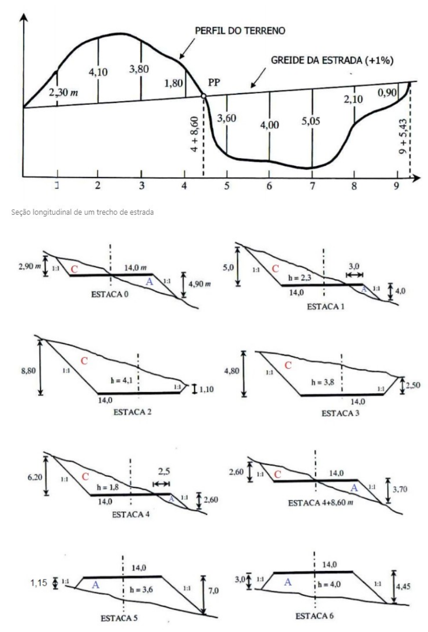 Atividade 02 – Infraestrutura Viária Dado um trecho de uma estrada e suas seções transversais, construa um diagrama de Brückner sabendo que o estaqueamento da estrada é feito a cada 20 m e que o fator de homogeneização é de 1,1. O diagrama de Brückner é feito a partir do quadro de volumes de terraplenagem. Para isso devemos preenchê-lo conforme o passo a passo apresentado a seguir. Passo 01: Calcular as áreas de corte e aterro O cálculo aproximado das áreas de corte e aterro é feito por meio de cálculos geométricos com base nos desenhos das seções transversais fornecidos, conforme abaixo: Passo 02: Calcular os volumes de corte e aterro O cálculo do volume aproximado compreendido entre duas estacas também é feito por meio da geometria, de acordo com o esquema abaixo: Onde: · An-1 é a área de corte ou de aterro de um seção n-1 (m²); · An é a área de corte ou de aterro de um seção n (m²); · d é a distância entre essas duas seções (m). Volume entre 4+8,60 m e 5: Passo 03: Corrigir o volume de aterro Para corrigir o volume de aterro realmente necessário, devemos considerar o grau de compactação do material granular no aterro. Para isso, observe a imagem abaixo: Podemos observar que o material granular retirado de um corte está no seu estado de compactação natural. Quando esse material é escavado e transportado até um aterro, ele adquire um novo grau de compactação, em outras palavras, se torna menos compactado que no estado natural. Por fim, quando esse material é depositado em um aterro, será necessário compactá-lo até um grau desejado. Dessa forma, o volume de corte necessário para realizar um aterro deverá ser maior que o necessário, tendo em vista que este volume deverá ser compactado. Portanto, a essa transição de graus de compactação de corte para aterro dá-se o nome de fator de homogeneização. Sabendo disto, para realizar a correção do real volume necessário para aterro, basta multiplicarmos o volume do aterro calculado até agora pelo fator de homogeneização = 1,1. Passo 04: Calcular as ordenadas de Brückner Para o cálculo da última coluna do quadro de volumes, devemos inicialmente arbitrar um valor qualquer de Brückner para a estaca inicial. Esse valor arbitrado tem o único objetivo de evitar valores de Brückner negativos e em nada influencia no resultado final. Portanto, nesse exemplo adotaremos um valor inicial de 5000 m³. Feito isso, o valor de Brückner da próxima estaca será a diferença entre o volume de corte e de aterro corrigido mais o valor de Brückner da estaca anterior e assim sucessivamente, conforme abaixo: Onde: · Bn é a ordenada de Brückner na estaca n (m³); · VC,n é o volume de corte na estaca n (m³); · VAc,n é o volume de aterro corrigido na estaca n (m³); · Bn-1 é a ordenada de Brückner na estaca n-1 (m³). Por fim, esse é o resultado final do quadro de volumes de terraplenagem: Passo 04: Diagrama de Brückner Para a construção de uma diagrama de Brückner, basta colocarmos, em um gráfico, as estacas nas abscissas e o Brückner correspondente nas ordenas. Por fim, basta apenas interligarmos cada ponto do gráfico por meio de uma curva, que será chamada de Onda de Brückner. Observe abaixo o diagrama resultante do nosso exemplo: Como interpretar os resultados do Diagrama de Brückner Onda de Brückner Para que possamos interpretar o Diagrama, precisamos saber que os trechos ascendentes da Onda de Brückner representam cortes, e os trechos descendentes, aterros. Consequentemente, o ponto mais alto (E-4+8,60 m), ou seja, onde a tangente da Onda é zero, é o ponto em que o perfil de projeto coincide com o perfil do terreno e é chamado ponto de passagem de corte para aterro. Analisando a Onda, é possível também observarmos que a diferença entre as ordenadas de dois pontos representa o volume de terraplenagem entre eles. Podemos perceber isso pelo volume entre a E-0 e a E-4+8,60 de 3609,00 m³, correspondendo justamente ao volume de corte destinado ao preenchimento do aterro. Linha de compensação A linha de compensação é uma reta horizontal que intersecciona a onda Brückner em pelo menos dois pontos. Se a onda fica abaixo da linha de compensação, significa que o volume vai ser transportado no sentido contrário ao estaqueamento (esquerda), caso contrário, será transportado no sentido do estaqueamento (direita). Distância média de transporte – DMT É representada pela distância que equivale à base do retângulo de área equivalente ao do trecho compensado e de altura igual à máxima ordenada desse trecho. Na prática, ela representa a distância de transporte de todo o material retirado do corte para a realização do aterro. Para traçar a DMT é muito simples, basta desenharmos uma linha vertical do ponto de passagem da onda em direção à linha de compensação e desenhar, em seguida, uma linha horizontal que interseccione o ponto médio da linha vertical e a Onda de Brückner. O tamanho dessa linha horizontal será a DMT, que no nosso caso será 69,67 m. Empréstimo É o volume destinado a suprir a carência de material de aterro, que geralmente é extraído da jazida mais próxima a esse aterro. No Diagrama de Brückner, os empréstimos são representados como linhas descendentes não contempladas pela linha de compensação e seu volume será a diferença entre as ordenadas desses intervalo. No nosso exemplo, o empréstimo necessário será de 2619,25 m³. Fonte: https://www.guiadaengenharia.com/diagrama-de-bruckner-exemplo/ image3.png image4.png image5.png image6.png image7.png image8.png image9.png image10.png image11.png image12.png image13.png image14.png image15.png image16.png image17.png image18.png image19.png image20.png image21.png image1.png image2.png