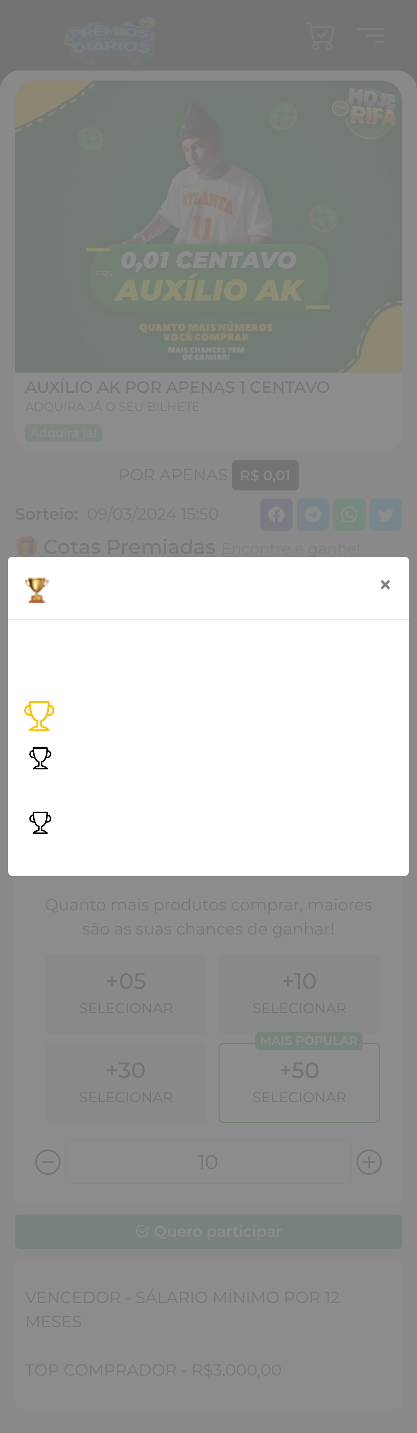 Desenvolvido por Agência BRN POR APENAS R$ 0,01 Sorteio: 09/03/2024 15:50 Cotas Premiadas Encontre e ganhe! Promoção Compre mais barato! Quero participar VENCEDOR - SÁLARIO MÍNIMO POR 12 MESES TOP COMPRADOR - R$3.000,00 AUXÍLIO AK POR APENAS 1 CENTAVO ADQUIRA JÁ O SEU BILHETE Adquira já! 2643915 2165560 3286421 R$ 500,00 3207814 R$ 500,00 8902973 R$ 500,00 4994415 R$ 500,00 9401690 1000 POR - R$: 7,00 4000 POR - R$: 36,00 Ver meus títulos ! Top Compradores Quanto mais produtos comprar, maiores são as suas chances de ganhar! 10 +05 SELECIONAR +10 SELECIONAR +30 SELECIONAR +50 SELECIONAR MAIS POPULAR Top Compradores × Esses são os maiores compradores no sorteio Ianara ramos 40000 Números Anderson de Moura Santos 29575 Números alana oliveira martineli 8560 Números 09/03/2024, 15:18 Página 1 de 1