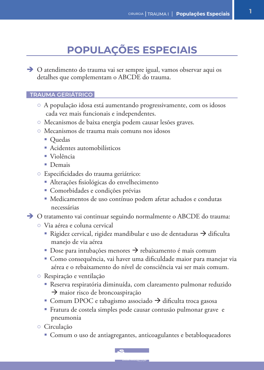 1CIRURGIA | TRAUMA I | Populações Especiais POPULAÇÕES ESPECIAIS O atendimento do trauma vai ser sempre igual, vamos observar aqui os detalhes que complementam o ABCDE do trauma. TRAUMA GERIÁTRICO ○ A população idosa está aumentando progressivamente, com os idosos cada vez mais funcionais e independentes. ○ Mecanismos de baixa energia podem causar lesões graves. ○ Mecanismos de trauma mais comuns nos idosos § Quedas § Acidentes automobilísticos § Violência § Demais ○ Especificidades do trauma geriátrico: § Alterações fisiológicas do envelhecimento § Comorbidades e condições prévias § Medicamentos de uso contínuo podem afetar achados e condutas necessárias O tratamento vai continuar seguindo normalmente o ABCDE do trauma: ○ Via aérea e coluna cervical § Rigidez cervical, rigidez mandibular e uso de dentaduras dificulta manejo de via aérea § Dose para intubações menores rebaixamento é mais comum § Como consequência, vai haver uma dificuldade maior para manejar via aérea e o rebaixamento do nível de consciência vai ser mais comum. ○ Respiração e ventilação § Reserva respiratória diminuída, com clareamento pulmonar reduzido maior risco de broncoaspiração § Comum DPOC e tabagismo associado dificulta troca gasosa § Fratura de costela simples pode causar contusão pulmonar grave e pneumonia ○ Circulação § Comum o uso de antiagregantes, anticoagulantes e betabloqueadores Conteúdo licenciado para Gustavo Dorneles Lobo Moura - 045.500.651-25 CIRURGIA | TRAUMA I | Populações Especiais2 § Comum comorbidades como hipertensão arterial sistêmica, insuficiência cardíaca, arritmia § Não respondem ao choque com taquicardia e hipotensão § Maior risco de sangramentos ○ Déficit neurológico e exposição § Alto risco de delirium § Mais comum possuírem comorbidades neurológicas, dificultando a avaliação do nível de consciência § Maior suscetibilidade à hipotermia, devido a muitos terem algum grau de desnutrição e menos gordura subcutânea. § De forma geral, são mais susceptíveis a alterações do ambiente ○ De maneira geral: § É um atendimento mais desafiador, em que traumas de baixa energia podem levar a grandes lesões. Com altas chances de o paciente não retornar à vida anterior após uma internação. § O melhor investimento é na prevenção primária. CRIANÇAS ○ Trauma pediátrico é a principal causa de mortalidade e morbidade na infância ○ Hipóxia e hipoventilação são 5x mais comuns na faixa etária pediátrica ○ Estrutura corporal mais frágil, mas apesar de ruim para o crescimento, maioria se recupera bem ○ Sempre que possível utilizar a régua de Breslow ○ Sempre levantar hipótese de maus tratos se lesões incompatíveis com mecanismo do trauma Assim como no idoso, o atendimento inicial sempre vai se basear no ABCDE do trauma, precisamos ficar atentos apenas a alguns aspectos: ○ Via aérea e coluna cervical § O crânio é maior que o corpo e a via aérea é mais anteriorizada, com a traqueia mais curta, ou seja, há um desalinhamento natural da via aérea. § Cartilagens não formadas, estruturas mais frágeis Cricotireoidostomia cirúrgica apenas em > 12 anos § Não rotacionar 180 graus cânula de Guedel, pode machucar o palato da criança. Conteúdo licenciado para Gustavo Dorneles Lobo Moura - 045.500.651-25 3CIRURGIA | TRAUMA I | Populações Especiais § IOT com cuff de baixa pressão < 30mmHG, nunca utilizar de intubação nasotraqueal. ○ Respiração e ventilação § Caixa torácica mais complacente fraturas de costela indicam traumas de altíssima energia ou maus tratos. § Frequência respiratória aumentada menor tolerância a hipóxia ○ Circulação § Regra prática para PAS = 90 + 2x idade § PA demora para cair, é habitualmente antecedida por taquicardia e palidez § Acesso intraósseo melhor segunda opção para não especialistas ○ Déficit neurológico e exposição § Mais suscetíveis à hipotermia devido ao metabolismo mais rápido § Necessário alta energia para fraturas (ossos mais flexíveis, coluna móvel e flexível) § Abaulamento de fontanelas ajudam a identificar lesões expansivas ○ Tomografias § É mais danoso um diagnóstico tardio ou perdido na avaliação do que a radiação. ○ Trauma cranioencefálico tratar hipóxia e hipovolemia agressivamente GESTANTES ○ Trauma na gestante é a principal causa de morte não obstétrica na gestação ○ Tratar a mãe = tratar o feto ○ Não deixar de realizar testes e procedimentos pelo fato de ser gestante ○ Mulheres em idade fértil sempre considerar gestantes ○ Principais mecanismos de trauma nas gestantes: § 1º Acidente automobilístico § 2º Quedas § 3º Violência doméstica Vamos seguir novamente o fluxo ABCDE, chamando a atenção para algumas peculiaridades: ○ Respiração e ventilação Conteúdo licenciado para Gustavo Dorneles Lobo Moura - 045.500.651-25 CIRURGIA | TRAUMA I | Populações Especiais4 § Hipocapnia é comum (PaCo2 > 35 na gestação pode indicar falência respiratória), devido a uma maior ventilação-minuto § A compressão do diafragma pode ocasionar um desvio cefálico das estruturas § Capacidade residual funcional diminuída ○ Circulação § Pode ocorrer compressão da veia cava pelo útero, diminuindo o retorno venoso. § Vasoconstrição placentária para compensar sangramento diminui repercussão clínica materna, porém leva a sofrimento fetal – o sofrimento fetal é o sinal mais sensível para choque hipovolêmico materno. ○ Trauma abdominal § Posição do útero e dos intestinos varia conforme idade gestacional § Exame físico inespecífico muitas vezes, com dificuldade de se avaliar peritonite § Risco de embolia amniótica e coagulação intravascular disseminada ○ Manejo específico § Colocar a paciente em decúbito lateral esquerdo ou mobilizar útero manualmente – com o intuito de retirar o útero da compressão da veia c