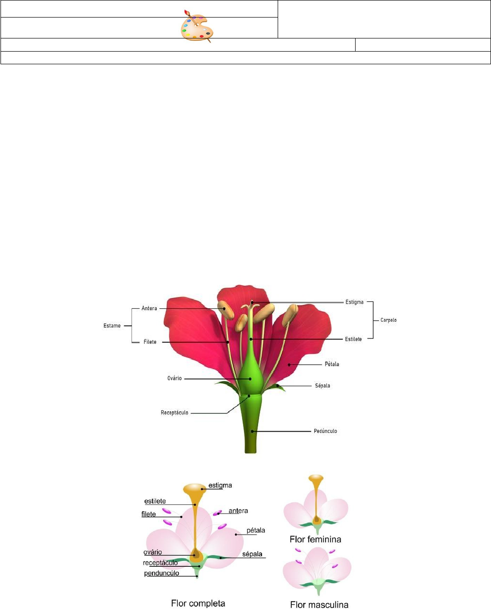 CIÊNCIAS ESCOLA ESTADUAL DE ENSINO FUNDAMENTAL CÂNDIDO PORTINÁRI TURMA: T5 NOME: DATA: Prof.ª: ROSIMERI WEIS TEXTO 5 FLORES, SEMENTES E FRUTOS A flor é a estrutura responsável pela reprodução das plantas angiospermas. É por meio da reprodução que novas plantas são originadas, assegurando a manutenção dos ecossistemas. · Funções das flores A função primordial das flores é a produção de sementes para a formação de novas plantas, garantindo a sobrevivência das espécies. Assim, a flor é responsável pela reprodução das plantas. Para isso, elas são formadas por folhas modificadas, geralmente de cores atrativas e formatos diferenciados para atrair os seus polinizadores. · Partes das flores Uma flor completa apresenta as seguintes estruturas: - Estame: estrutura masculina da flor onde localizam-se o filete e a antera. - Carpelo: estrutura feminina da flor, formada pelo estigma, estilete e ovário. - Pétalas: folhas modificadas e coloridas com a função de atrair os polinizadores. O conjunto de pétalas é chamado de corola. - Sépalas: localizadas abaixo das pétalas, geralmente, de coloração verde. O conjunto de sépalas é chamado de cálice. Toda essa estrutura é sustentada pelo pedúnculo, haste responsável por ligar a flor à planta. O pedúnculo apresenta uma porção dilatada ligada à flor denominada de receptáculo floral, onde estão inseridos os elementos florais. De acordo com a estrutura da flor, ela pode ser feminina ou masculina. Essa definição depende da presença do gineceu e do androceu. · Gineceu O conjunto de carpelos é denominado de gineceu, a parte feminina da flor. O gineceu é formado por carpelos, pistilo, estigma, estilete e ovário. Dentro do ovário estão os gametas femininos da planta. O estigma é a porção que recebe o grão de pólen e através do estilete liga-se ao ovário. Já o ovário é a parte que vai se transformar em fruto. O fruto é resultado do desenvolvimento do ovário, enquanto a semente representa o desenvolvimento do óvulo depois da fecundação. · Androceu O conjunto de estames é denominado de androceu, a parte masculina da flor. O androceu é formado pelos estames, antera e filete. Os estames são formados pela antera e filete. O filete corresponde a uma haste longa e fina, onde em sua extremidade encontra-se a antera, responsável pela produção do pólen. Tipos de flores As flores apresentam diferentes classificações, que pode ser quanto ao sexo ou quanto ao número de flores. · Classificação quanto ao sexo - Hermafroditas ou monoicas: são as flores que apresentam os órgãos reprodutores masculino e feminino na mesma flor. A maioria das angiospermas são hermafroditas, como exemplo podemos citar a tulipa. - Dioicas: são as flores que apresentam os órgãos reprodutores masculino ou feminino de formas separadas. Como exemplo podemos citar o mamoeiro. · Presença dos elementos florais - Flores completas: são as flores que apresentam todos os elementos florais: cálice, corola, androceu e gineceu. A rosa é um exemplo de flor completa. - Flores incompletas: são as flores com a ausência de algum dos elementos florais. A begônia é um exemplo de flor incompleta, pois ela possui uma estame ou um pistilo, mas não ambos. POLINIZAÇÃO DAS FLORES A polinização pode ocorrer da seguinte forma: - Polinização direta: quando acontece na mesma flor, é a autopolinização. - Polinização indireta: representa a polinização entre flores da mesma planta. - Polinização cruzada: é quando a polinização acontece entre flores de plantas diferentes. Sementes As sementes são estruturas extremamente importantes para a sobrevivência das plantas no ambiente terrestre. Elas são responsáveis por proteger o embrião, além de garantir a dispersão das espécies pelo ambiente. Frutos Frutos são estruturas resultantes do amadurecimento do ovário e que surgem após a fecundação. A banana é uma das exceções, já que é formada a partir do ovário não amadurecido. Nesses casos, falamos em fruto partenocárpico. Existem, no entanto, alimentos vegetais suculentos que chamamos de fruto, mas que na verdade não o são, biologicamente falando, já que não são oriundos do ovário. Eles são classificados na biologia como pseudofrutos. O caju, a maçã e a pera são alguns exemplos. Referência física de consulta: Livro didático adotado para a série (Gewandsznajder, Fernando Teláris ciências, 8º ano: ensino fundamental, anos finais / Fernando Gewandsznajder, Helena Pacca. - 3. ed. São Paulo: Ática, 2018) – Cap. 01 –Tipos de Reprodução – pag. 31 ATIVIDADES 1. As sementes são importantes estruturas reprodutivas que garantem, por exemplo, a proteção do embrião. Essa estrutura surgiu, primeiramente, no grupo das: a) briófitas. b) pteridófitas. c) gimnospermas. d) angiospermas. 2. Na maioria das angiospermas, o fruto é uma estrutura formada a partir do desenvolvimento: a) Do ovário; b) Do óvulo fecundado; c) Do zigoto; d) Da oosfera fecundada. 3. Observe o esquema da flor a seguir e marque a alternativa incorreta a respeito dessa estrutura reprodutora: Observe atentamente a estrutura da flor a) 1 e 2 representam, respectivamente, a antera e o filete. b) 3 representa o estigma, uma parte do gineceu. c) A estrutura 4 é chamada de pistilo. d) O ovário está representado pelo número 5. e) A estrutura 6 é conhecida por sépala. 4. É muito comum nos alimentarmos de estruturas vegetais e pensarmos, erroneamente, que se trata de frutos. A parte suculenta que consumimos do caju, por exemplo, na realidade, não é um fruto, sendo essa estrutura chamada de pseudofruto ou fruto acessório. Por que a parte suculenta e comestível do caju não é chamada de fruto? a) Porque ela não possui semente. b) Porque ela não é formada a partir do desenvolvimento do óvulo. c) Porque ela é formada por um único ovário. d) Porque ela não é formada a partir do desenvolvimento do ovário. 5. Ana