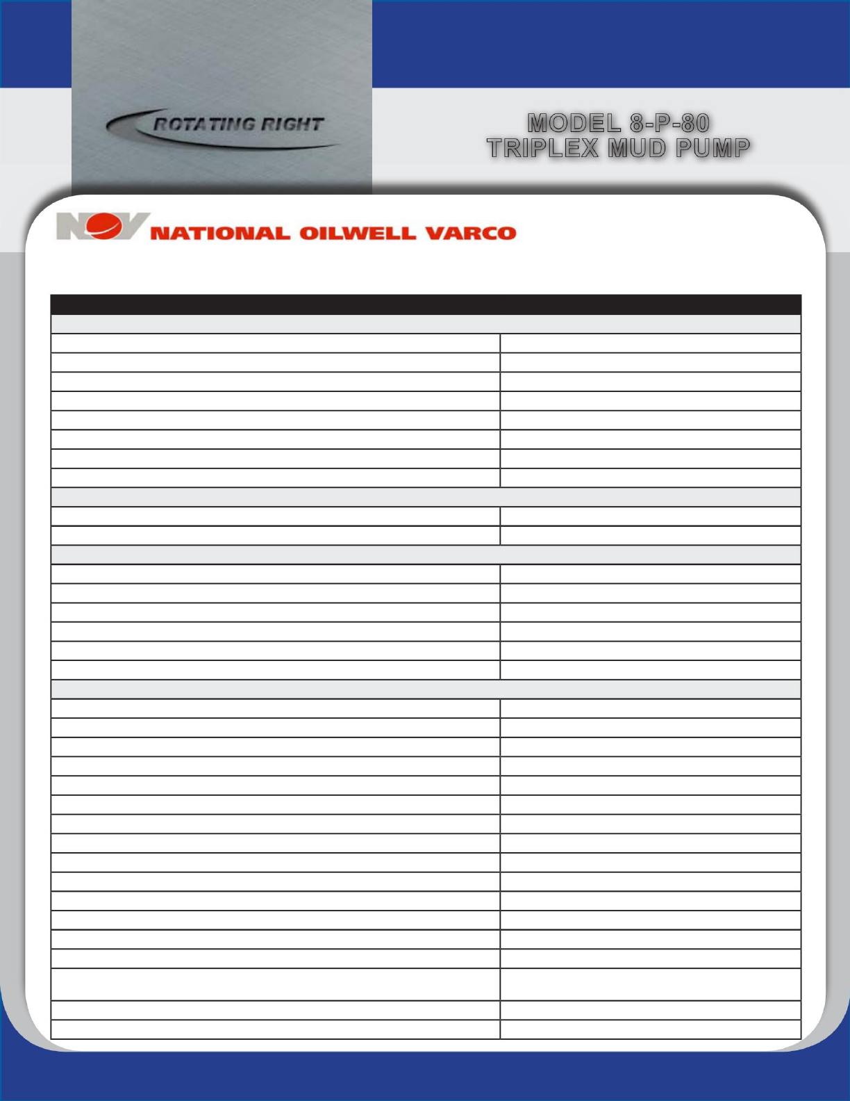 Modelo 8-P-80 bomba de lama triplex 160 espinha de peixe aliviada Extensão dupla no eixo do pinhão, polegadas (mm) Altura sobre os cilindros de fluido, polegadas (mm) Conexão de descarga, cruzada Válvulas, número API Dimensões Cônico 161 5/8" (4105) Velocidade nominal da bomba, spm CONTRA. 6 75T 1 1/2” passo óctuplo Roldana, cubo QD tipo S Peso completo, menos polia, lbs. (kg) Velocidade do pinhão, rpm Engrenagem e pinhão 2.463:1 Roda dentada com cubo QD tipo S-Dual Motor Electric Drive (roda dentada 1200 RPM máx.) 93 7/8" (2384) 394 Ressalto inferior, modificado para alta pressão Correias de seção OD 18-8V de 53" / Correias de seção PD26-D de 52" 8” ASA-150 lb. Flange RJ assentos de válvula 2 rolos autocompensadores Altura, do chão ao centro da sucção da entrada frontal, polegadas (mm) Pressão de teste hidrostático de cilindros de fluido, psi (kg/cm2) Tipo de pino cruzado 62 9/16" (1589) 6 1/4" (158,8) 3 rolos cilíndricos Largura sobre a moldura, polegadas (mm) Tipo de engrenagens Diâmetro máximo do revestimento, polegadas (mm) Conexões de fluido Conexão haste-pistão 2 rolos cônicos de carreira dupla Altura, do chão ao centro de descarga, polegadas (mm) 4” API-5000 lb. Flange RJ Largura sobre o eixo do pinhão, polegadas (mm) 8 1/2" (215,9) Pilotado e ombro, Nacional CB-4 Número e tipo de rolamento de cruzeta 26.970 (12.235) Dados Mecânicos Número e tipo de rolamento do eixo do pinhão 10 3/4" (273) 7” Diâm. x 17" de comprimento (177,8 x 431,8) Curso, polegadas (mm) relação de transmissão Número e tipo de mancal da biela do virabrequim Conexão da haste intermediária da haste do pistão 3 agulhas de carreira dupla Comprimento total sobre patins, polegadas (mm) Dados de capacidade Número e tipo de rolamento principal 800 (597) Bloqueio de metal com metal pilotado e com ombro Altura, do chão ao topo da caixa de engrenagens, polegadas (mm) Potência máxima de entrada (kW) Aço, design modular intercambiável de 2 peças Especificações conexão de sucção cilindro de fluido Quinto passo de dois 75T 1 1/2”. Através de liga endurecida Roda dentada ind. ou rig drive-drive 1100 rpm máx. 60" (1524) 51 7/8" (1318) 10.000 (703) 35 1/4" (895) A bomba de lama 8-P-80 da National Oilwell Varco tem uma potência nominal de 800 cavalos (597 kw) a 160 golpes por minuto, com um curso de 8 1/2 pol. (216 mm). Machine Translated by Google 600 360 3.386 (12.820) 281 (1063) 246 (930) 211 (797) 166 (628) 500 800** 1.755 (6.645) 111 (420) 140 339 (1282) 210 (794) 347 (1313) 303 (1149) 260 (984) 173 (656) 120 400 500 (1890) 437 (1654) 375 (1418)540 271 (1027) 222 (855) 176 (665) 720 450 3.121 (11.815) 100 250 (945) 700 312 (1182) 194 (734) 2.622 (9.927) 140 (532) 1.387(5.250) 262 (993) 139 (526) 80 420 (1588) 367 (1390) 315 (1191) 217 (820) 630 160** 2.167 (8.204) 542 (2051) 474 (1795) 406 (1538) Sede: Estrada Davies 6120 Telefone: (780) 485-2010 • Ligação gratuita: (866) 707-7867 T6E 4M9 www.rotatingright.com Edmonton, AB • Calgary • Drayton Valley • Lloydminster Fax: (780) 485-1938 Velocidade e potência de entrada máxima nominal (139.7) 4-1/2" (114,3) máx. Pressão de descarga, psi (kg/cm2) com alta pressão na extremidade do fluido*** GPM* velocidade spm Volume/Curso, gal. (Litros) 6" (206.7) GPM ** 5000 (351,5) 5" (127,0) Dados de desempenho (173,7) Hid.* HP, HP 2280 (LPM) GPM (LPM) 4395 (309) Bombear (LPM*) 2940 Baseado em 90% de eficiência mecânica e 100% de eficiência volumétrica (152.4) GPM (LPM) Entrada 6-1/4" (158,8) GPM 3560 (250,3) * 2470 4" (101,6) (LPM) (160.3) 5-1/2" (LPM) Tamanho do revestimento, polegadas (mm) HP GPM Machine Translated by Google