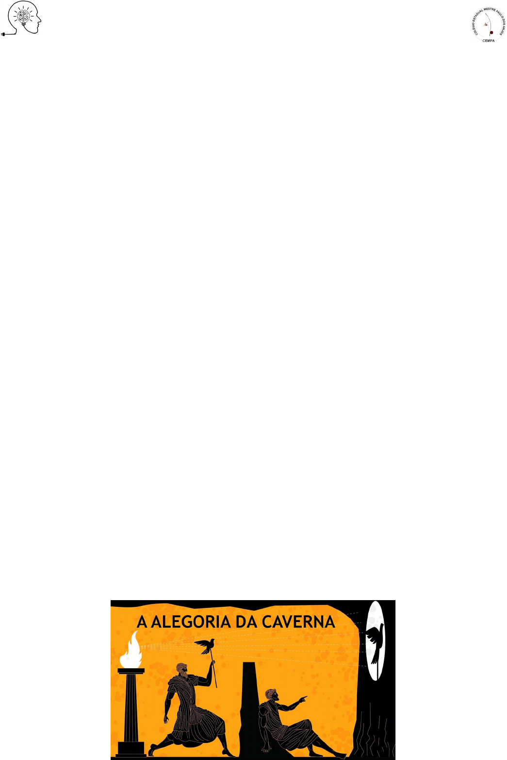 COLÉGIO ESTADUAL MESTRE PAULO DOS ANJOS - CEMPA FILOSOFIA - JAIRO ARAÚJO AULA 1 - O MITO (ALEGORIA) DA CAVERNA Imaginemos homens que vivam numa caverna cuja entrada se abre para a luz em toda a sua largura, com um amplo saguão de acesso. Imaginemos que esta caverna seja habitada, e seus habitantes tenham as pernas e o pescoço amarrados de tal modo que não possam mudar de posição e tenham de olhar apenas para o fundo da caverna, onde há uma parede. Imaginemos ainda que, bem em frente da entrada da caverna, exista um pequeno muro da altura de um homem e que, por trás desse muro, se movam homens carregando sobre os ombros estátuas trabalhadas em pedra e madeira, representando os mais diversos tipos de coisas. Imaginemos também que, por lá, no alto, brilhe o sol. Finalmente, imaginemos que a caverna produza ecos e que os homens que passam por trás do muro estejam falando de modo que suas vozes ecoem no fundo da caverna. Se fosse assim, certamente os habitantes da caverna nada poderiam ver além das sombras das pequenas estátuas projetadas no fundo da caverna e ouviriam apenas o eco das vozes. Entretanto, por nunca terem visto outra coisa, eles acreditariam que aquelas sombras, que eram cópias imperfeitas de objetos reais, eram a única e verdadeira realidade e que o eco das vozes seriam o som real das vozes emitidas pelas sombras. Suponhamos, agora, que um daqueles habitantes consiga se soltar das correntes que o prendem. Com muita dificuldade e sentindo-se frequentemente tonto, ele se voltaria para a luz e começaria a subir até a entrada da caverna. Com muita dificuldade e sentindo-se perdido, ele começaria a se habituar à nova visão com a qual se deparava. Habituando os olhos e os ouvidos, ele veria as estatuetas moverem-se por sobre o muro e, após formular inúmeras hipóteses, por fim compreenderia que elas possuem mais detalhes e são muito mais belas que as sombras que antes via na caverna, e que agora lhes parece algo irreal ou limitado. Suponhamos que alguém o traga para o outro lado do muro. Primeiramente ele ficaria ofuscado e amedrontado pelo excesso de luz; depois, habituando-se, veria as várias coisas em si mesmas; e, por último, veria a própria luz do sol refletida em todas as coisas. Compreenderia, então, que estas e somente estas coisas seriam a realidade e que o sol seria a causa de todas as outras coisas. Mas ele se entristeceria se seus companheiros da caverna ficassem ainda em sua obscura ignorância acerca das causas últimas das coisas. Assim, ele, por amor, voltaria à caverna a fim de libertar seus irmãos do julgo da ignorância e dos grilhões que os prendiam. Mas, quando volta, ele é recebido como um louco que não reconhece ou não mais se adapta à realidade que eles pensam ser a verdadeira: a realidade das sombras. E, então, eles o desprezariam. (Platão, A República) AULA 1 - O MITO (ALEGORIA) DA CAVERNA O que garante que o que acreditamos ser verdade seja de fato verdadeiro? - Por que podemos perceber materialmente? - Por que alguém nos diz que é verdadeiro (autoridade reconhecida)? - Por que acreditamos ser verdade (convicção/fé)? - Nossa racionalidade indica ser coerente e por isso é verdadeiro? O que é verdadeiro no texto platônico? As sombras que sempre estiveram refletidas na parede da caverna (sempre esteve ali)? O que foi visto fora da caverna, visto pelo prisioneiro que conseguiu se libertar? Teoria dos Dois Mundo - Sensível (material/sensível) e Inteligível (razão/idéias). Carga Simbólica do Mito/Alegoria. - Busca pela verdade e a libertação da ignorância e do engano. - Prisioneiros - Cidadão. - Correntes - Ignorância. - Sombras e ecos - preconceitos e opiniões. - Sair da Caverna - busca pelo conhecimento. - Luz do Sol - razão, conhecimento verdadeiro, Filosofia. Como o Mito da Caverna se encaixaria nos dias de hoje? - Redes Sociais (o que é e o que parece ser) - Fake News - Consumo (ter para parecer ser). Observações Prisioneiros: os prisioneiros da caverna somos nós mesmos, os cidadãos comuns. Caverna: é o nosso corpo, que segundo Platão, seria fonte de engano e dúvida, pois ele nos ilude na forma como apreendemos as aparências das coisas, nos fazendo acreditar que essas são as próprias coisas. Sombras e ecos: as sombras que os prisioneiros veem e os ecos que eles escutam são as opiniões e os preconceitos que trazemos do senso comum e da vida costumeira. Eles são, segundo Platão, conhecimentos errados que adquirimos através dos sentidos de nosso corpo e da vida cotidiana. Sair da caverna: a libertação do prisioneiro e a sua fuga da caverna simboliza a busca pelo conhecimento verdadeiro. A luz do Sol: a luz solar no exterior da caverna simboliza o conhecimento verdadeiro, a razão e a filosofia. Quando o prisioneiro sai da caverna, ele sente-se perturbado pela luz intensa, elemento natural que ele nunca havia vivenciado. No início, há uma dificuldade de aceitação dessa luz pelas retinas, até que ele adapta-se e percebe toda a realidade exterior. Metaforicamente, isso simboliza a zona de conforto que as sombras e a caverna representam, pois o engano da vida comum pode ser confortável, enquanto a verdade pode ser, ao menos, inicialmente, dolorosa e sacrificante. Sair da ignorância significa sair da zona de conforto. image2.png image1.png image3.png