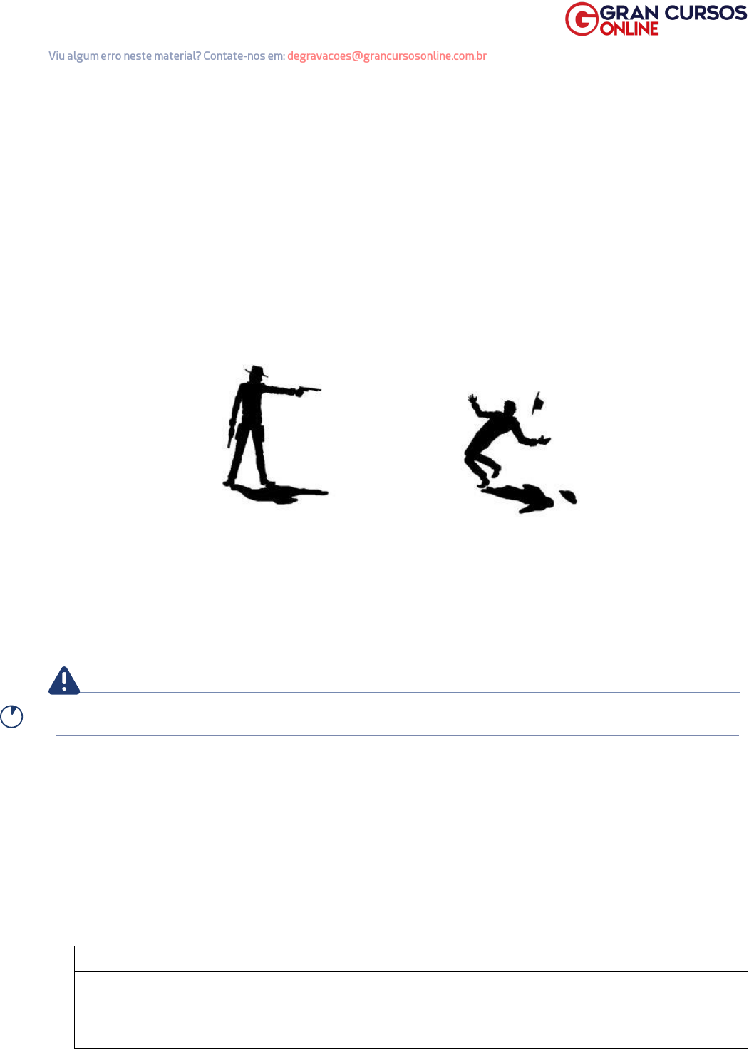 1www.grancursosonline.com.br Viu algum erro neste material? Contate-nos em: degravacoes@grancursosonline.com.br A N O TA ÇÕ E S Traumatologia - Projéteis de Arma de Fogo MEDICINA LEGAL TRAUMATOLOGIA - PROJÉTEIS DE ARMA DE FOGO Sumário 1. Armas de fogo comuns. 2. Espingardas. 3. Fuzis (projéteis de alta energia). BALÍSTICA Balística é o estudo do movimento dos projéteis. A balística que ocorre dentro da arma é chamada de interna, já o movimento do projétil no ar é a balística externa. O objeto de estudo da balística externa é chamado de trajetória e o caminho percorrido dentro do alvo é chamado trajeto. ATENÇÃO Não confundir trajetória com trajeto. Os efeitos que são produzidos no alvo são chamados de terminal. Munição comum A munição é diferente do projétil. Ela é composta de quatro partes: 5m www.grancursosonline.com.br 2www.grancursosonline.com.br Viu algum erro neste material? Contate-nos em: degravacoes@grancursosonline.com.br A N O TA ÇÕ E S Traumatologia - Projéteis de Arma de Fogo MEDICINA LEGAL • Projétil é o que de fato irá causar o dano; • O estojo envolve o projétil e une todos elementos; • Propelente é a pólvora. A pólvora é o elemento que entra em combustão; • A espoleta é uma cápsula que contém uma mistura iniciadora que irá gerar a combustão. A combustão é uma reação química com a substância da pólvora que vai liberar energia em forma de calor e uma grande quantidade de gases. Uma pressão é gerada devido a esta grande quantidade de gases que acaba expelindo o projétil pelo cano da arma. Não é somente o projétil que sai do cano da arma, pois também são liberados outros elementos: www.grancursosonline.com.br 3www.grancursosonline.com.br Viu algum erro neste material? Contate-nos em: degravacoes@grancursosonline.com.br Traumatologia - Projéteis de Arma de Fogo MEDICINA LEGAL • a pólvora combusta, fuligem; • os grãos de pólvora incombusta; • os gases superaquecidos. . Orifício de entrada x saída O projétil pode entrar no corpo e sair, ou seja, tem um trajeto transfixante com um orifício de entrada e saída. O projétil de arma de fogo a princípio é contundente, mas por possuir muita energia ciné- tica adquire características perfurantes. Sendo assim, ao atingir o alvo (entrada) ainda estará com muita energia cinética, tendo o predomínio das características perfurantes. Ao atraves- sar o alvo ele vai dispersando a sua energia cinética na medida que encontra resistência. Caso ele saia terá um predomínio das características contundentes, ou seja, de rasgar a pele. Orifício de entrada Orifício de saída Redondo(perfura) ou elíptico Obs.: redondo é o que tem incidência perpen- dicular e elíptico é o que tem incidência oblí- qua. Irregular. Bordas invertidas • para dentro. Bordas evertidas • para fora. Diâmetro menor. . Diâmetro maior. Pouco sangrante. Muito sangrante. Orlas/halos • de contusão; • de escoriação; • de enxugo. Efeitos secundários 10m 15m www.grancursosonline.com.br 4www.grancursosonline.com.br Viu algum erro neste material? Contate-nos em: degravacoes@grancursosonline.com.br A N O TA ÇÕ E S Traumatologia - Projéteis de Arma de Fogo MEDICINA LEGAL Exemplos Efeitos secundários do disparo O efeito primário é tudo aquilo que é feito pelo projétil. 20m www.grancursosonline.com.br 5www.grancursosonline.com.br Viu algum erro neste material? Contate-nos em: degravacoes@grancursosonline.com.br Traumatologia - Projéteis de Arma de Fogo MEDICINA LEGAL Os efeitos secundários são aqueles causados por outros elementos que não o projétil e que causam efeitos no corpo também: . • Gases aquecidos: geram a zona de queimadura. • Fuligem: a pólvora deposita–se sobre a pele causando ao redor do orifício a zona de esfumaçamento. • Pólvora incombusta: os grãos são mais densos e conseguem penetrar na pele gerando a zona de tatuagem. Todos esses elementos possibilitam deduzir que o tiro foi disparado a curta distância. Não há uma distância definida, pois depende do tipo de munição e depende da arma. ATENÇÃO Curta distância é sinônimo de queima roupa, porém é diferente de tiro encostado. Exemplo 25m www.grancursosonline.com.br 6www.grancursosonline.com.br Viu algum erro neste material? Contate-nos em: degravacoes@grancursosonline.com.br A N O TA ÇÕ E S Traumatologia - Projéteis de Arma de Fogo MEDICINA LEGAL Obs.: no caso de anteparos ( roupas, travesseiro etc.), os efeitos secundários do disparo podem ficar no anteparo. ATENÇÃO Zona é característica de entrada a curta distância. ��Este material foi elaborado pela equipe pedagógica do Gran Cursos Online, de acordo com a aula preparada e ministrada pelo professor Francisco Helmer Almeida Santos. A presente degravação tem como objetivo auxiliar no acompanhamento e na revisão do conteúdo ministrado na videoaula. Não recomendamos a substituição do estudo em vídeo pela leitura exclu- siva deste material. www.grancursosonline.com.br