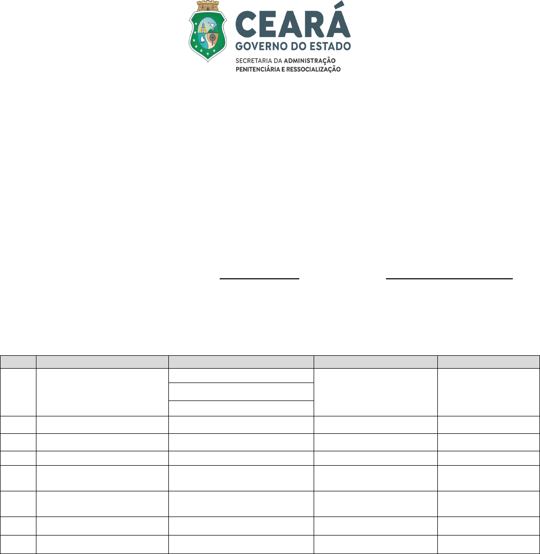 1 de 52 GOVERNO DO ESTADO DO CEARÁ SECRETARIA DA ADMINISTRAÇÃO PENITENCIÁRIA E RESSOCIALIZAÇÃO – SAP/CE CONCURSO PÚBLICO PARA PROVIMENTO DE VAGAS AO CARGO DE POLICIAL PENAL EDITAL Nº 007/2024-SAP, DE 10 DE ABRIL DE 2024 A SECRETARIA DA ADMINISTRAÇÃO PENITENCIÁRIA E RESSOCIALIZAÇÃO - SAP/CE e a SECRETARIA DO PLANEJAMENTO E GESTÃO DO ESTADO DO CEARÁ - SEPLAG/CE, tendo em vista o disposto na Lei Estadual Nº 9.826, de 14 de maio de 1974; Lei Estadual Nº 14.582, de 21 de dezembro de 2009; Lei Estadual Nº 17.388, de 26 de fevereiro de 2021 e alterações posteriores, tornam pública a realização de concurso público para provimento de 600 (seiscentas) vagas no cargo de Policial Penal e 200 (duzentas) vagas para cadastro de reserva, mediante as condições estabelecidas neste edital. 1. DAS DISPOSIÇÕES PRELIMINARES 1.1. O concurso público será regido por este edital e será executado pelo Instituto de Desenvolvimento Educacional, Cultural e Assistencial Nacional – IDECAN, endereço eletrônico www.idecan.org.br e correio eletrônico policiapenal.ce@idecan.org.br e será coordenado pela Secretaria da Administração Penitenciária e Ressocialização - SAP, e pela Secretaria do Planejamento e Gestão do Estado do Ceará – SEPLAG, em conformidade com as normas, condições e disposições estabelecidas neste edital. 1.2. A realização das etapas deste concurso é de responsabilidade técnica e operacional do IDECAN, com exceção da etapa de investigação social, que será de responsabilidade da Secretaria da Administração Penitenciária e Ressocialização - SAP, respeitadas as normas deste edital. 1.3. O concurso compreenderá as seguintes Etapas: Etapa Item Especificação Caráter Responsável 1ª Exame Intelectual Conhecimentos Básicos Eliminatório e classificatório Instituição Contratada Conhecimentos Específicos Redação 2ª Avaliação Biopsicossocial Candidatos com deficiência Eliminatório Instituição Contratada 3ª Teste de Aptidão Física Avaliação de capacidade física Eliminatório Instituição Contratada 4ª Avaliação Psicológica Avaliação psicológica Eliminatório Instituição Contratada 5ª Avaliação de Saúde Exame Médico, Odontológico e Toxicológico Eliminatório Instituição Contratada 6ª Procedimento de Heteroidenti- ficação Candidatos negros Eliminatório Instituição Contratada 7ª Curso de Formação Profissional Curso de formação Eliminatório e classificatório Instituição Contratada 8ª Investigação Social Investigação social Eliminatório COINT/SAP 1.3.1. O procedimento de Investigação Social ocorrerá durante todo o período do concurso e compreenderá uma investigação social, visando a avaliar a conduta e idoneidade moral do candidato, de caráter eliminatório. Será realizada pela Coordenadoria de Inteligência – COINT da Secretaria da Administração Penitenciária e Ressocialização, em cooperação com a Controladoria Geral de Disciplina dos Órgãos de Segurança Pública - CGD e Secretaria da Segurança Pública e Defesa Social – SSPDS e demais órgãos do sistema de inteligência estadual e federal. 1.3.2. Todas as Etapas previstas no subitem 1.3 são de responsabilidade do IDECAN, com exceção apenas da 8ª Etapa. 1.4. Todas as Etapas do Concurso serão realizadas na cidade de Fortaleza e Região Metropolitana, no Estado do Ceará. 1.4.1. Para realização das provas objetiva e discursiva poderá ser utilizada a região metropolitana da cidade de Fortaleza, no Estado do Ceará, para fins de alocação do quantitativo de candidatos inscritos. 1.5. Os candidatos nomeados estarão subordinados às Leis Estaduais Nº 14.582, de 21 de dezembro de 2009, Nº 17.388, de 26 de fevereiro de 2021, e Nº 9.826/74, e suas alterações. 1.6. São parte integrante deste edital os anexos a seguir especificados: a) Anexo I – Do modelo de atestado para candidatos inscritos na condição de pessoa com deficiência e que optaram por concorrer às vagas reservadas; b) Anexo II – Do formulário de requerimento de isenção de taxa de inscrição; c) Anexo III – Dos conteúdos programáticos; 2 de 52 d) Anexo IV – Do modelo de atestado médico para o Teste de Aptidão Física (TAF); e) Anexo V – Do cronograma de execução previsto; f) Anexo VI – Da Ficha de Informações Confidenciais (FIC). 1.7. Todos os questionamentos relacionados ao presente concurso deverão ser direcionados aos canais de atendimento do IDECAN, disponíveis por chat on-line através do endereço eletrônico www.idecan.org.br, por correio eletrônico – policiapenal.ce@idecan.org.br ou por telefones nº (61) 3201.6225 e 0800 8782696, de segunda a sexta-feira (dias úteis), das 08h às 12h e das 13h às 17h. 1.8. Toda menção a horário neste edital e em outros atos dele decorrentes terá como referência o horário oficial de Brasília-DF. 2. DO CARGO DE POLICIAL PENAL 2.1. A denominação do cargo, o número de vagas e o cadastro de reserva são os disponibilizados na tabela a seguir (AC = Ampla Concorrência / PCD = Pessoas com Deficiência / PP = Pretos e Pardos): CARGO VAGAS CADASTRO DE RESERVA (CR) VAGAS + CADASTRO DE RESERVA Total Vagas AC PCD PP Total CR AC PCD PP Total Vagas + CR Vagas AC + CR AC Vagas PCD + CR PCD Vagas PP + CR PP POLICIAL PENAL 600 450 30 120 200 150 10 40 800 600 40 160 2.2. REQUISITOS PARA EXERCÍCIO DO CARGO: certificado, devidamente registrado, de conclusão de curso de Ensino Médio, expedido por instituição de ensino reconhecida pelo órgão competente; ter, na data da inscrição no concurso, idade igual ou superior a 18 (dezoito) anos, e idade máxima de 34 (trinta e quatro) anos, 11 (onze) meses e 29 (vinte e nove) dias; possuir Carteira Nacional de Habilitação, no mínimo B; e cumprimento dos demais requisitos previstos no item 3 deste edital. 2.3. DESCRIÇÃO SUMÁRIA DAS ATIVIDADES DO CARGO: é atribuição do cargo de Policial Penal a vigilância, custódia, guarda, esco